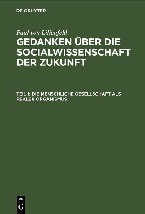 Frontmatter -- Vorwort -- Inhalt -- I. Die socialen Fragen -- II. Die Socialwissenschaft -- III . Kraft, als Ursache der Erscheinungen in der Natur und Gesellschaft -- IV. Die menschliche Gesellschaft als reales Wesen -- V. Die Relativität der Erscheinungen in der Natur und in der Gesellschaft -- VI. Die Bedeutung allgemeiner Begriffe -- VII. Unterschied in der Wirkung unorganischer und organischer Kräfte -- VIII . Die verschiedenen Entwicklungsstufen des organischen Lebens -- IX. Die Realität der verschiedenen Seiten der Entwickelung des socialen Lebens -- X. Die sociale Freiheit -- XI. Allgemeine Analogie zwischen der Gesellschaft und der Natur. -- XII. Das Gesetz der Erhaltung der Kraft -- XIII. Das Princip der Bewegung -- XIV. Einwendungen -- XV. Vermehrung, Zeugung, Wachstimm, Blüthe, Krankheit, Tod, Wiedergeburt -- XVI. Das Nervensystem -- XVII. Die Nervenreflexe -- XVIII. Offenbare und latente Reflexe -- XIX. Die Entwickelung der höheren Nervenorgane -- XX. Direkte und indirekte Reflexe -- XXI. Die Sprache, als Werkzeug höchster geistiger Reflexwirkung -- XXII. Sociale Embryologie -- XXIII. Die Volkserziehung -- XXIV. Klassische und reale Bildung -- XXV. Der sociale Kosmos -- XXVI. Die Entstehung der menschlichen Gesellschaft -- XXVII. Ursprung der Religion, Vernunft, Wissenschaft und Kunst, der Sprache, Sittlichkeit und der Gesetze -- XXVIII. Einseitigkeit der rein-materialistischen und rein - idealistischen Weltanschauung -- XXIX. Die Anerkennung der Gesellschaft als reales Wesen erweitert die materielle und befestigt zugleich die ideale Weltanschauung -- XXX. Das Princip der Notwendigkeit und der Freiheit -- XXXI. Methode der Socialwissenschaft -- XXXII. Die Sociologie als Hilfsmittel der Naturkunde -- XXXIII. Schluss