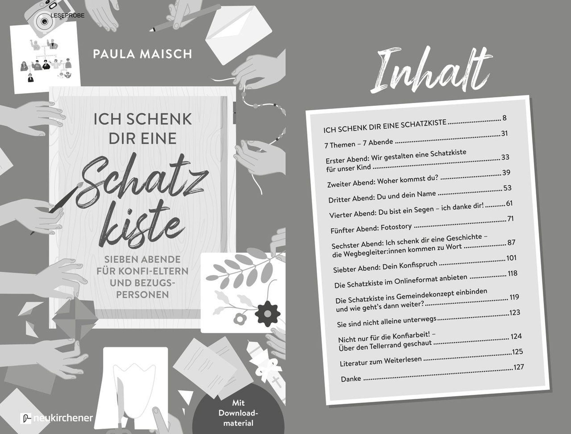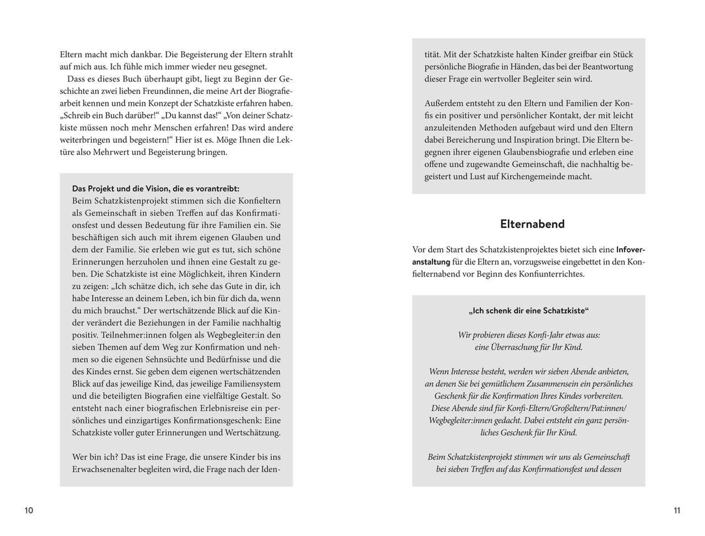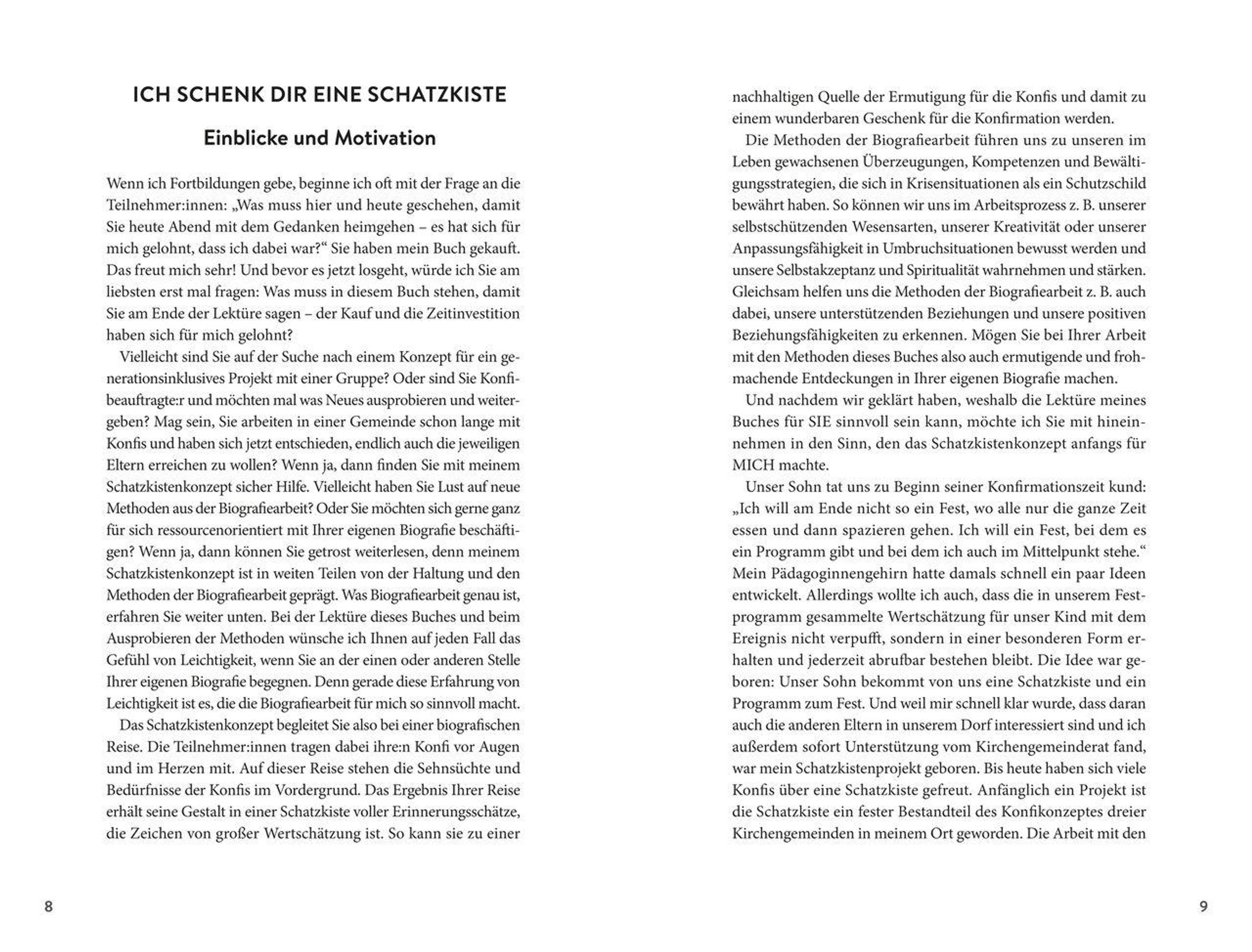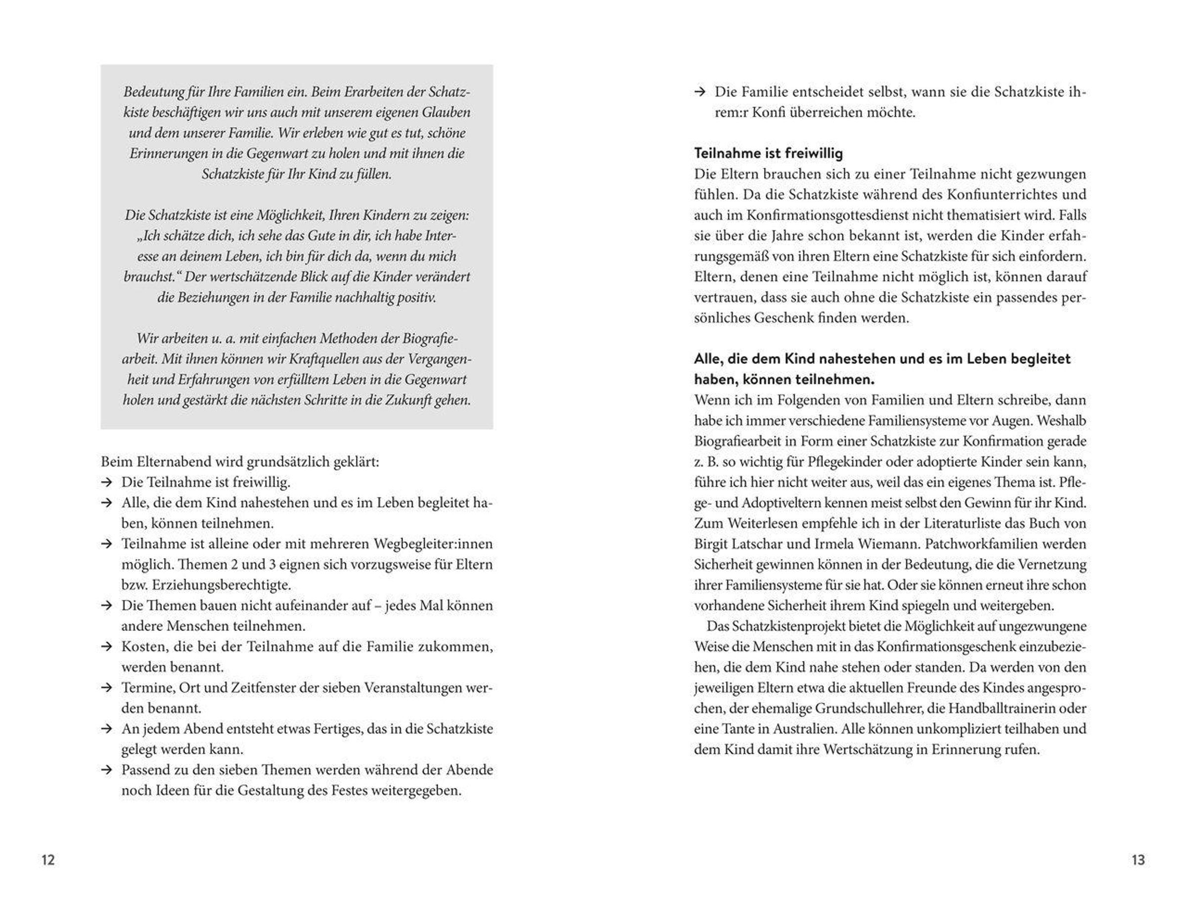 Das Buch zeigt, wie man gemeinsam mit Konfi-Eltern, Geschwistern, Großeltern, Patinnen und Paten oder weiteren Angehörigen eine individuelle Schatzkiste als Geschenk für die Jugendlichen füllt mit biografischen Erinnerungsstücken, Briefen, Konfirmationsspruch, begleitenden Gedanken und vielem mehr.