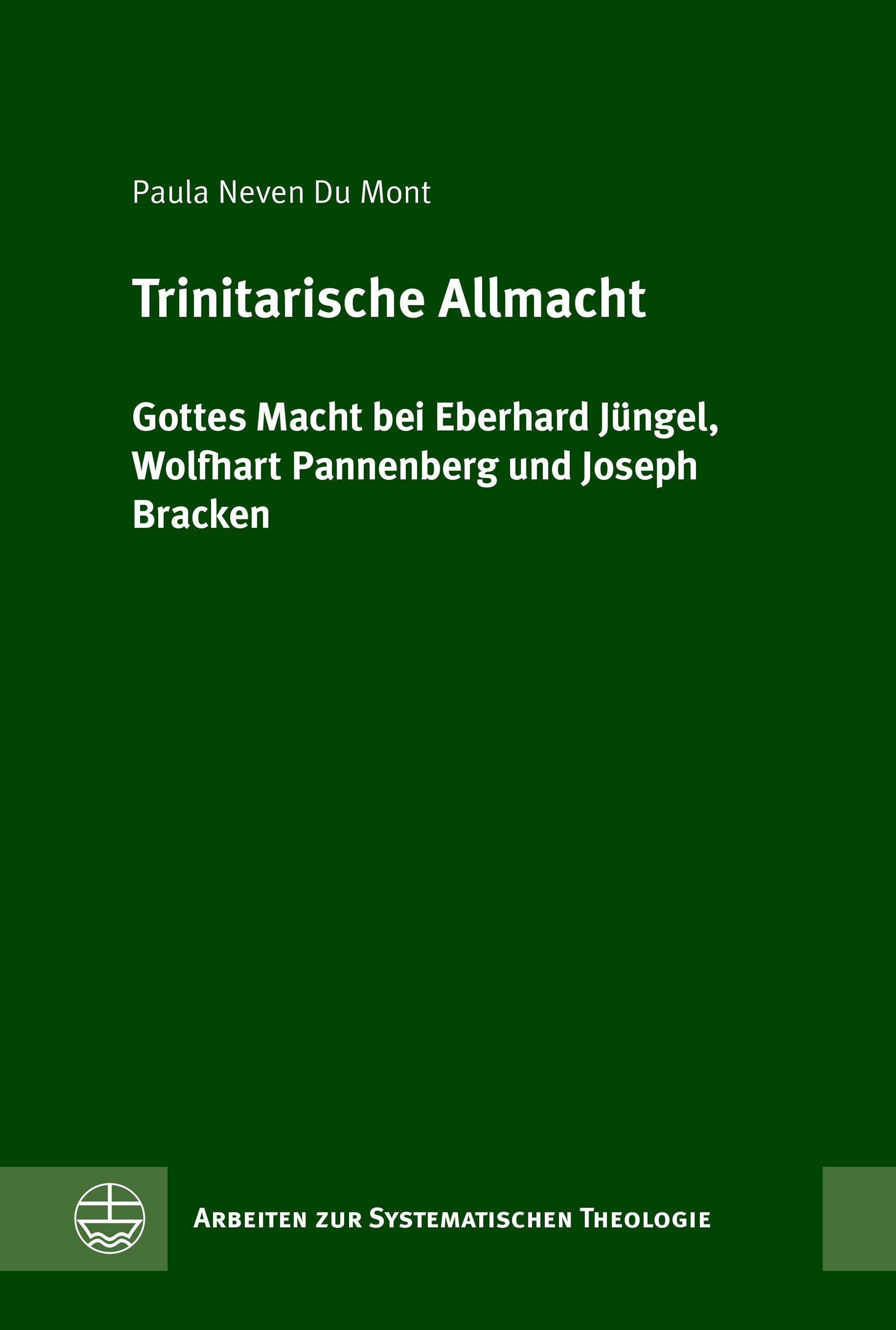 "Trinitarische Allmacht" von Paula Neven Du Mont. Grüner Hintergrund, unteres Logo mit einem stilisierten Kreuz und Wellen., Buch