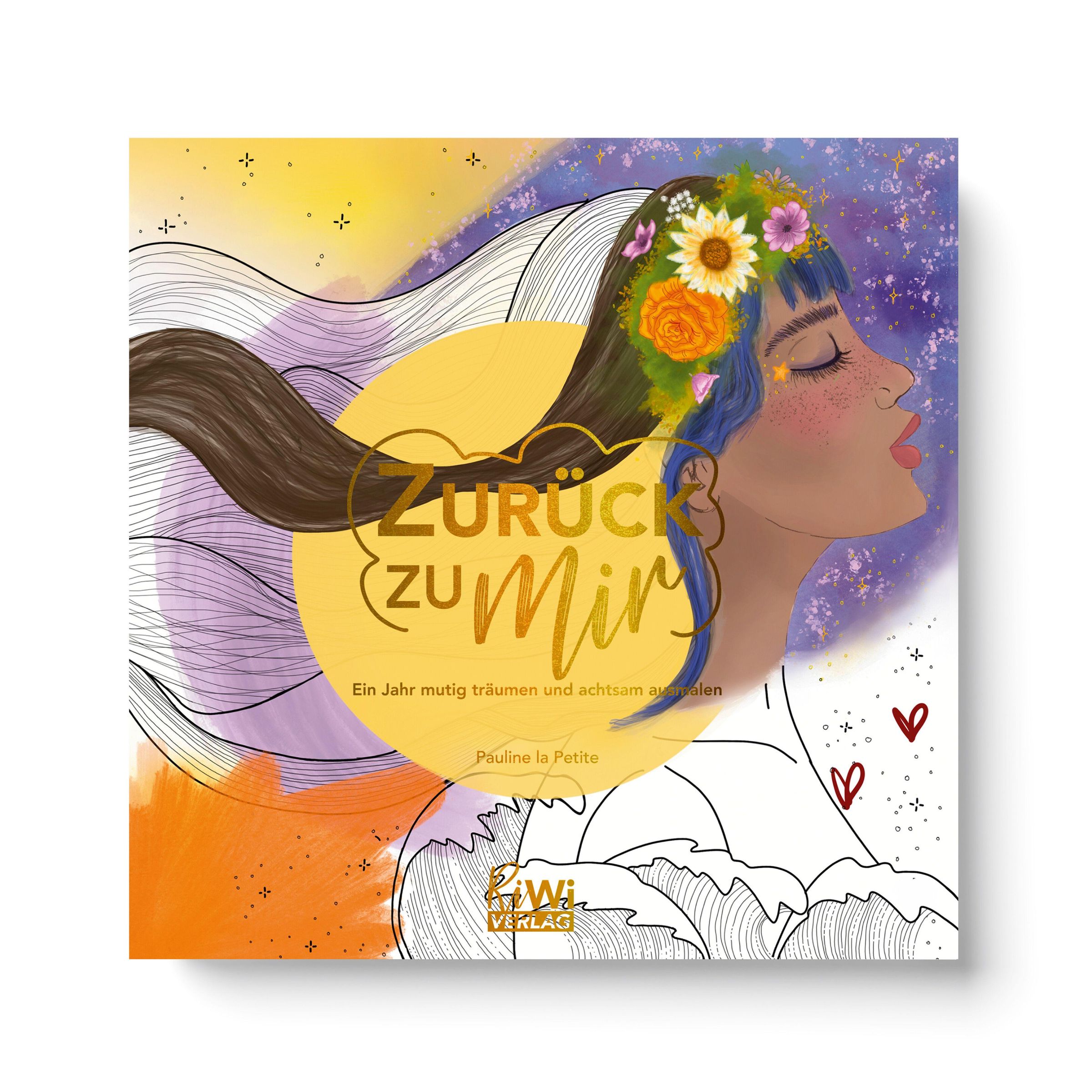 "ZURÜCK zu Mir. Ein Jahr mutig träumen und achtsam ausmalen." Illustration: Profil einer Frau mit Blumen im Haar., Buch