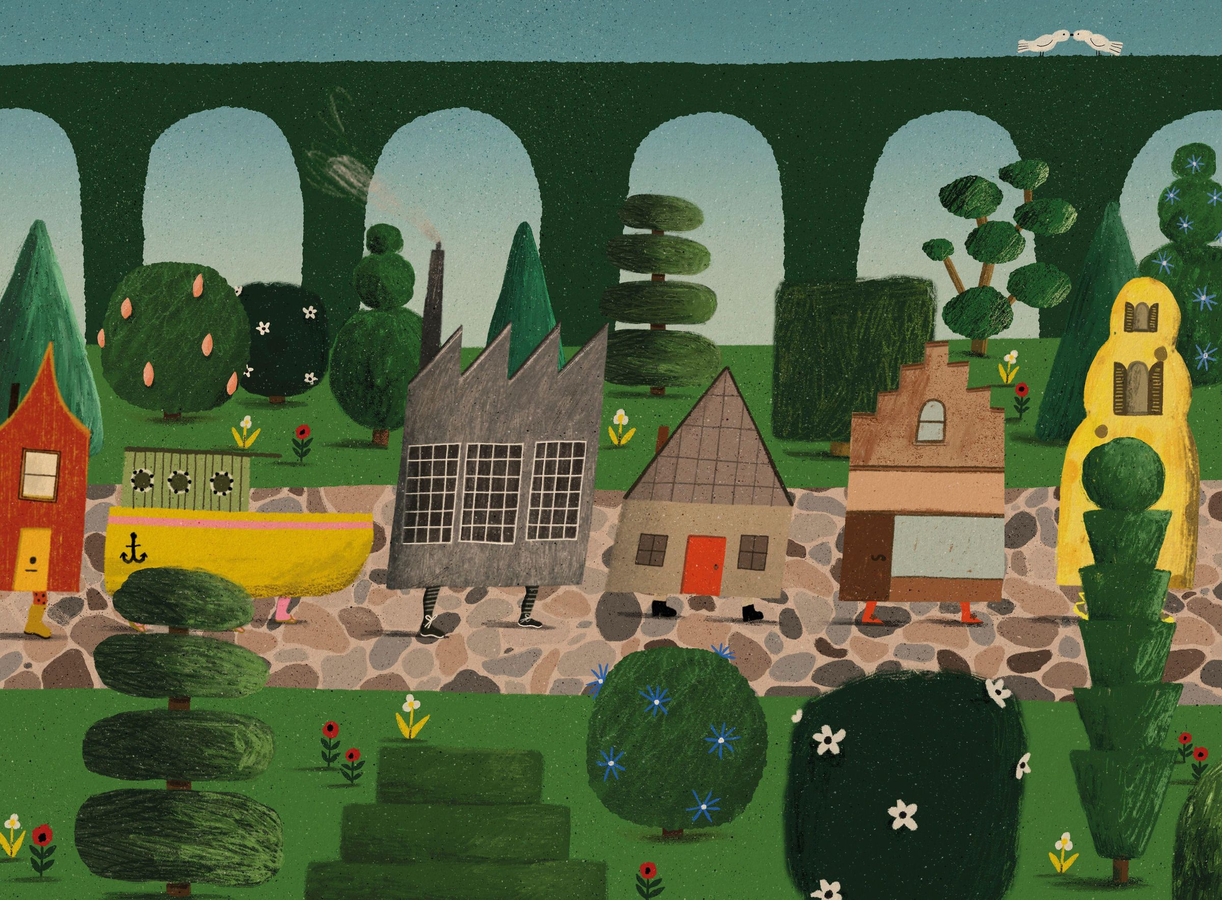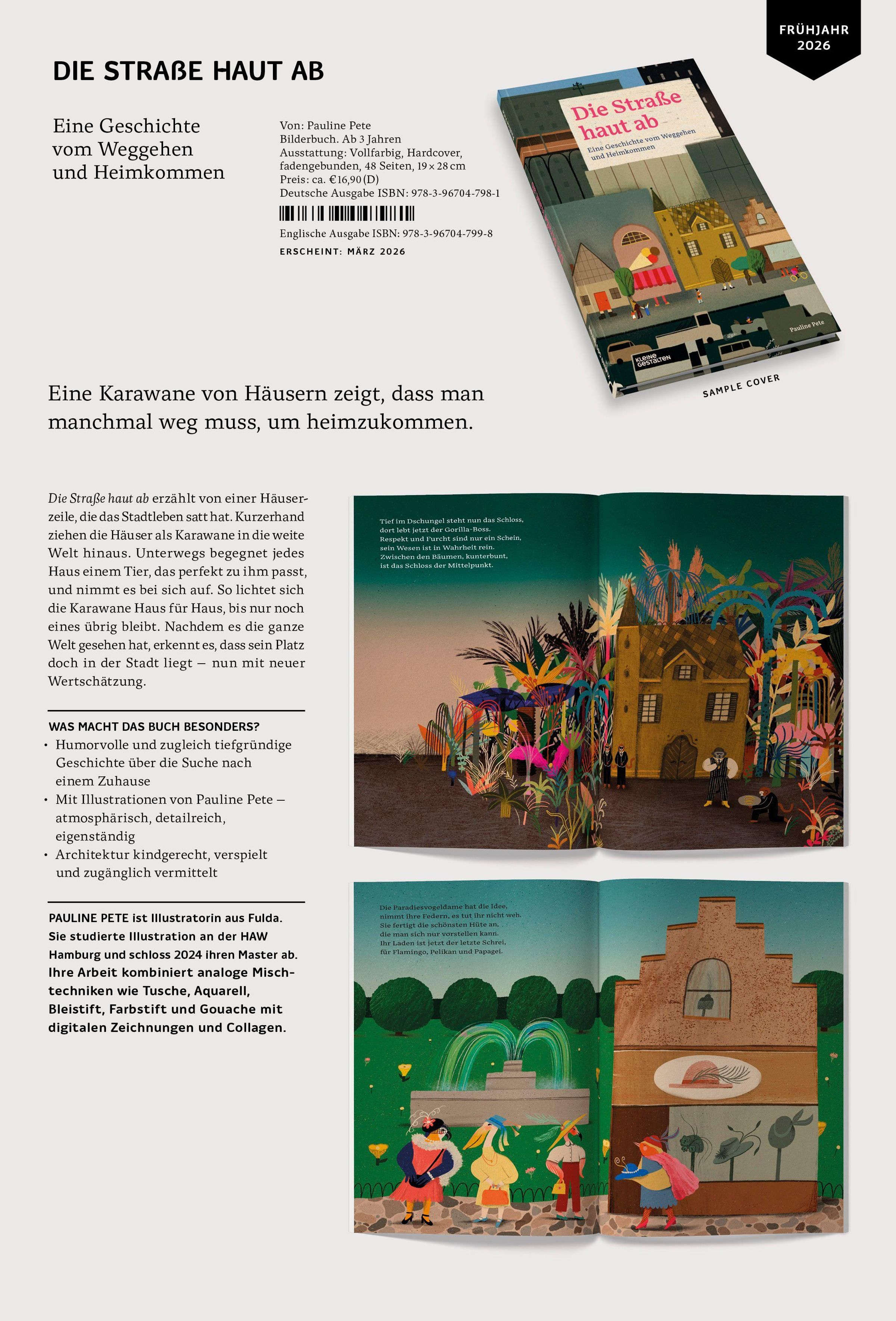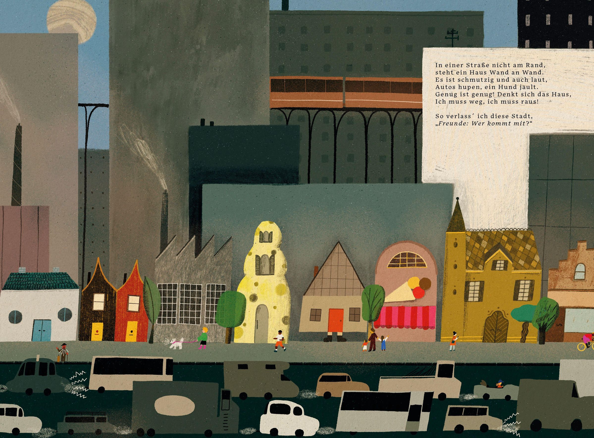 Die Straße haut ab erzählt von einer Häuserzeile, die das Stadtleben satt hat. Kurzerhand ziehen die Häuser als Karawane in die weite Welt hinaus. Unterwegs begegnet jedes Haus einem Tier, das perfekt zu ihm passt, und nimmt es bei sich auf. So lichtet sich die Karawane Haus für Haus, bis nur noch eines übrig bleibt. Nachdem es die ganze Welt gesehen hat, erkennt es, dass sein Platz doch in der Stadt liegt - nun mit neuer Wertschätzung.