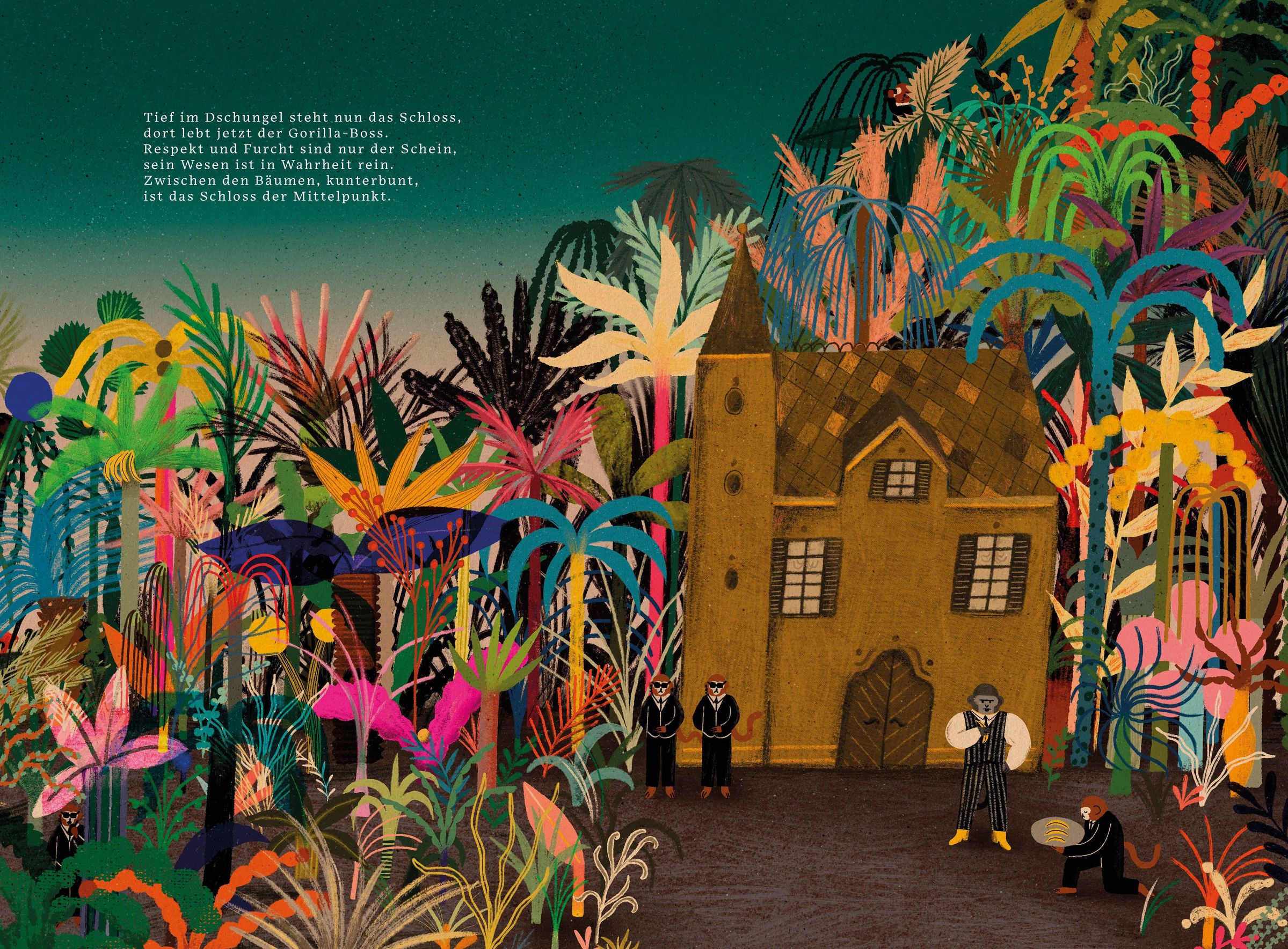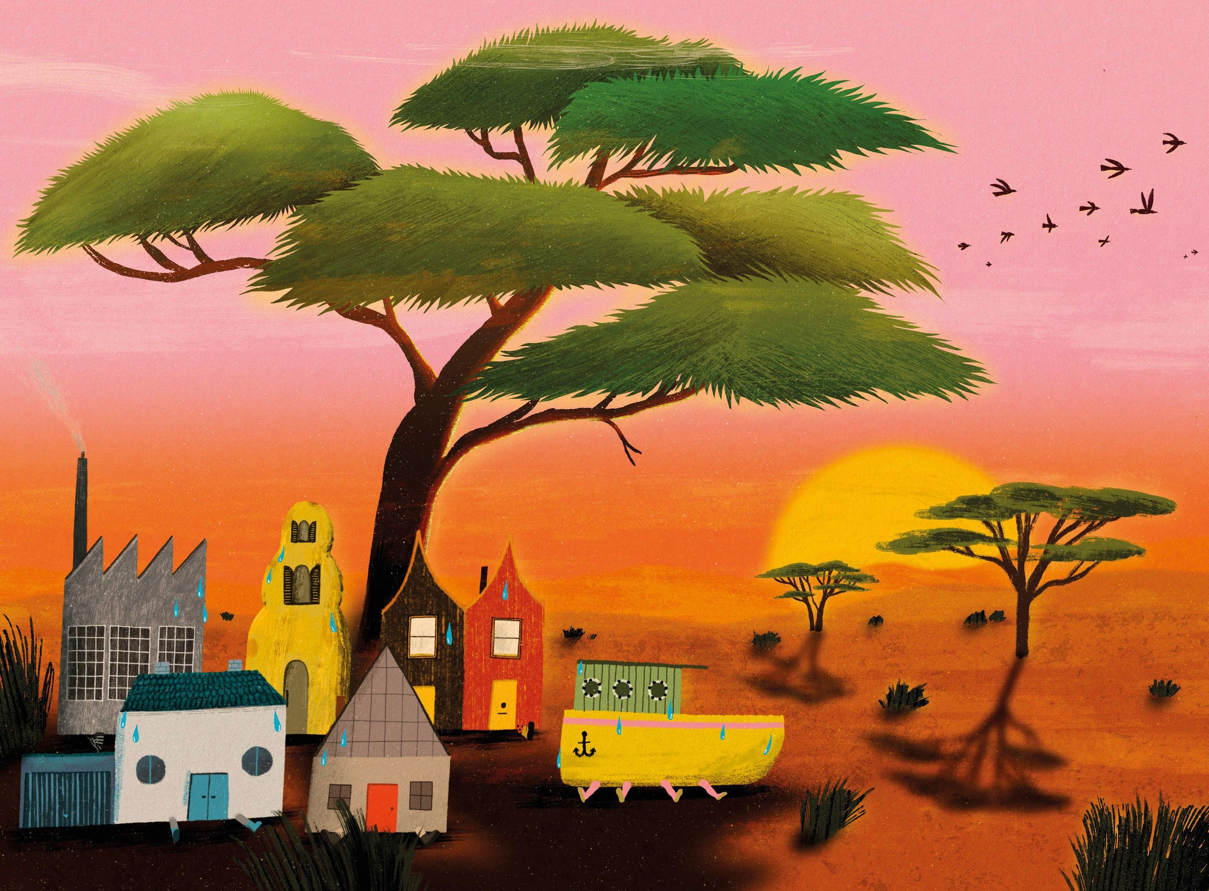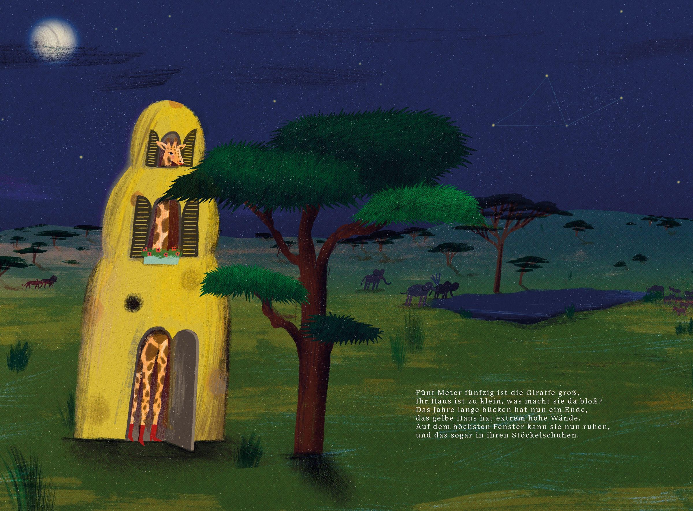 Die Straße haut ab erzählt von einer Häuserzeile, die das Stadtleben satt hat. Kurzerhand ziehen die Häuser als Karawane in die weite Welt hinaus. Unterwegs begegnet jedes Haus einem Tier, das perfekt zu ihm passt, und nimmt es bei sich auf. So lichtet sich die Karawane Haus für Haus, bis nur noch eines übrig bleibt. Nachdem es die ganze Welt gesehen hat, erkennt es, dass sein Platz doch in der Stadt liegt - nun mit neuer Wertschätzung.