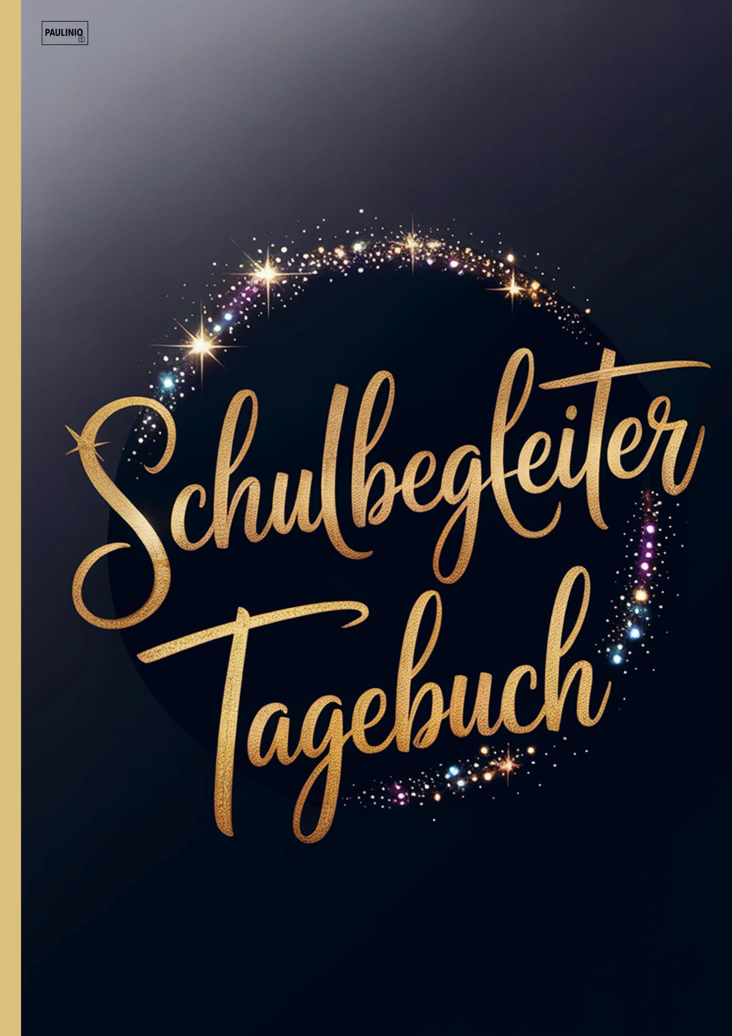 „Schulbegleiter Tagebuch“ steht in goldener Schrift, umgeben von glitzernden, bunten Lichtern auf dunklem Hintergrund., Buch