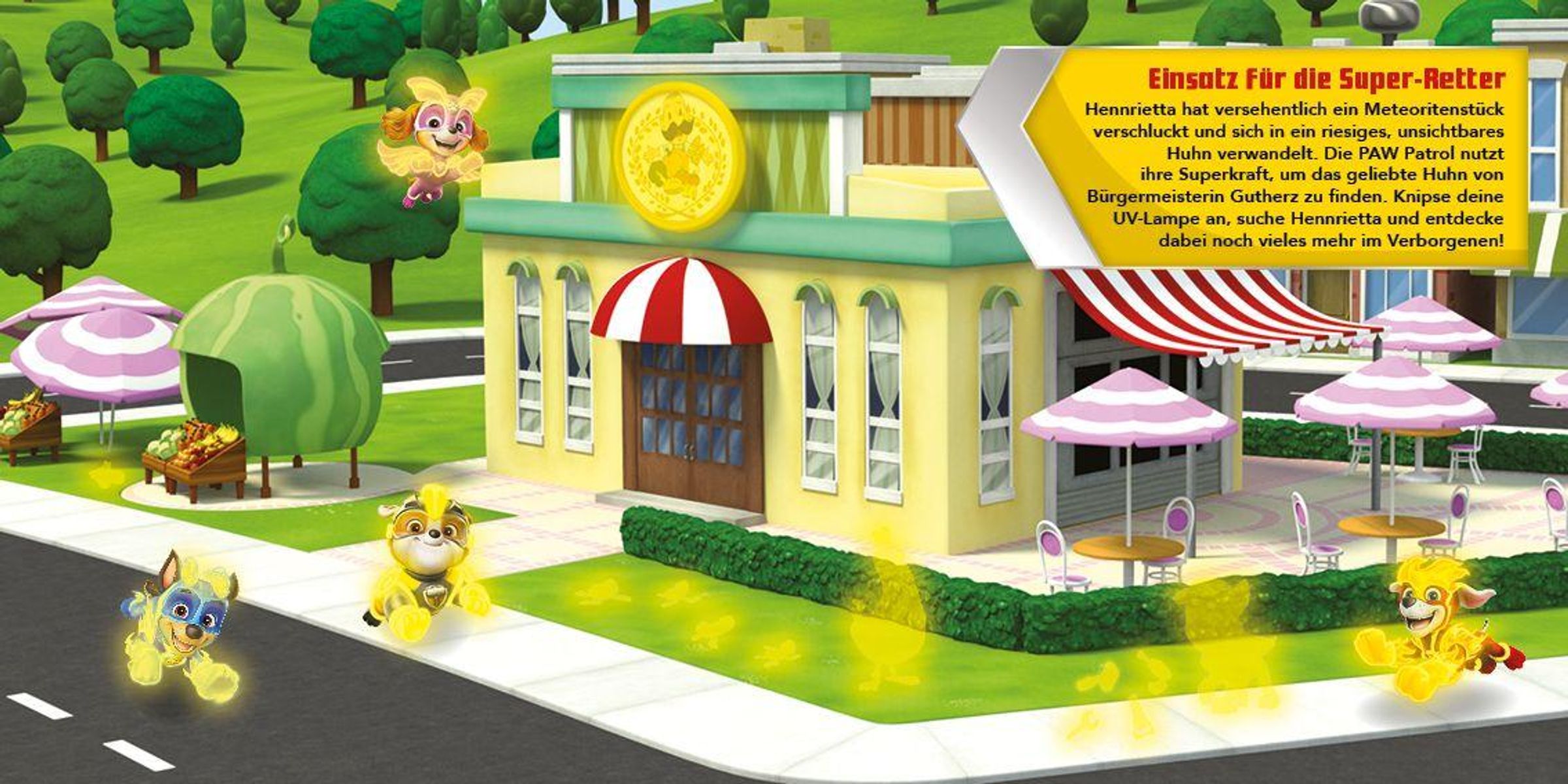 Ob als Super-Hunde, Dschungel-Helfer, Piraten, Ritter oder Meerfellfreunde - die PAW Patrol ist für jeden Einsatz bereit. Begleite die Rettungshunde bei ihren spektakulären Einsätzen und gehe mit deiner pawtastischen UV-Lampe auf die Suche nach Ryder, einer verschwundenen Schatzkarte und vielem mehr!