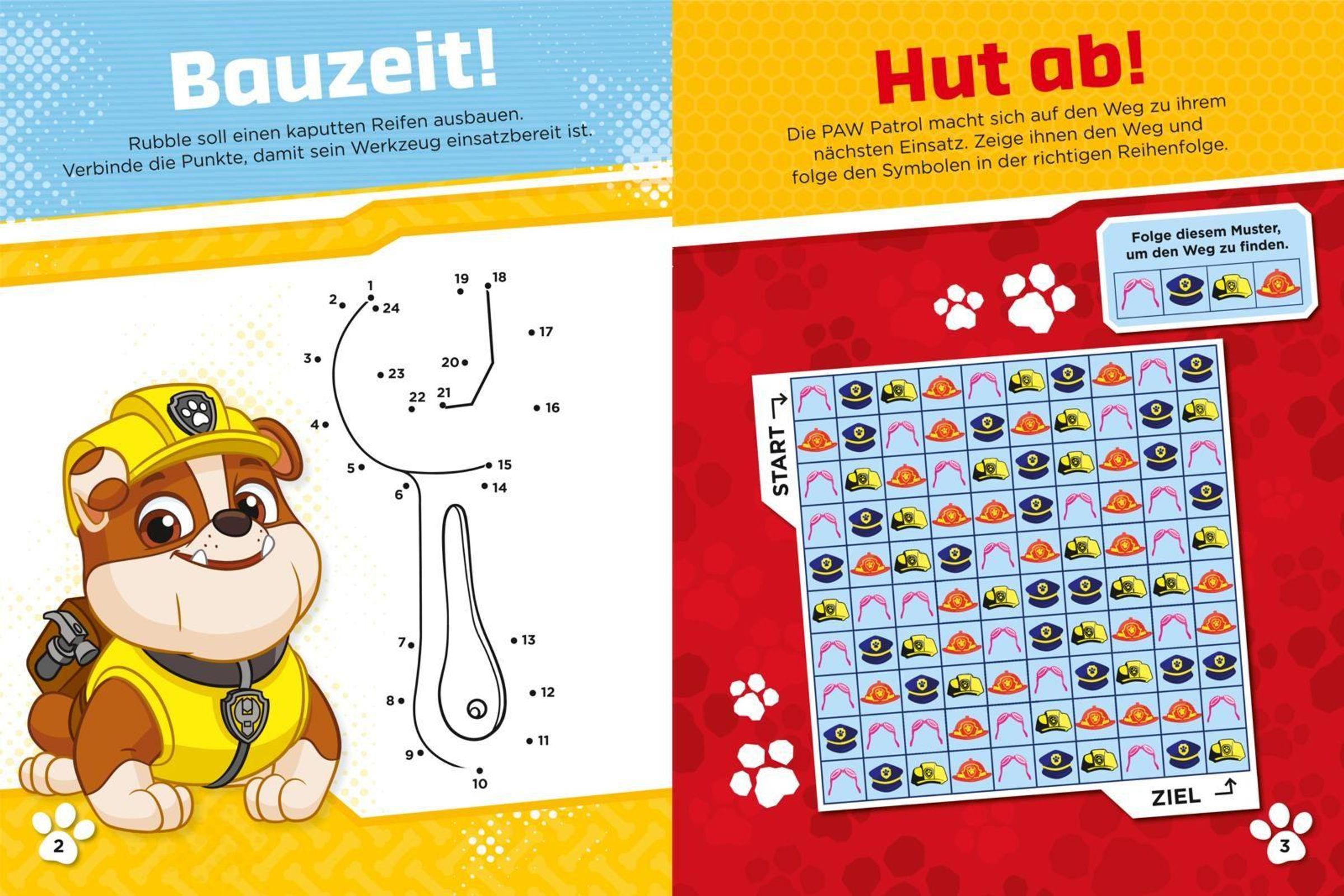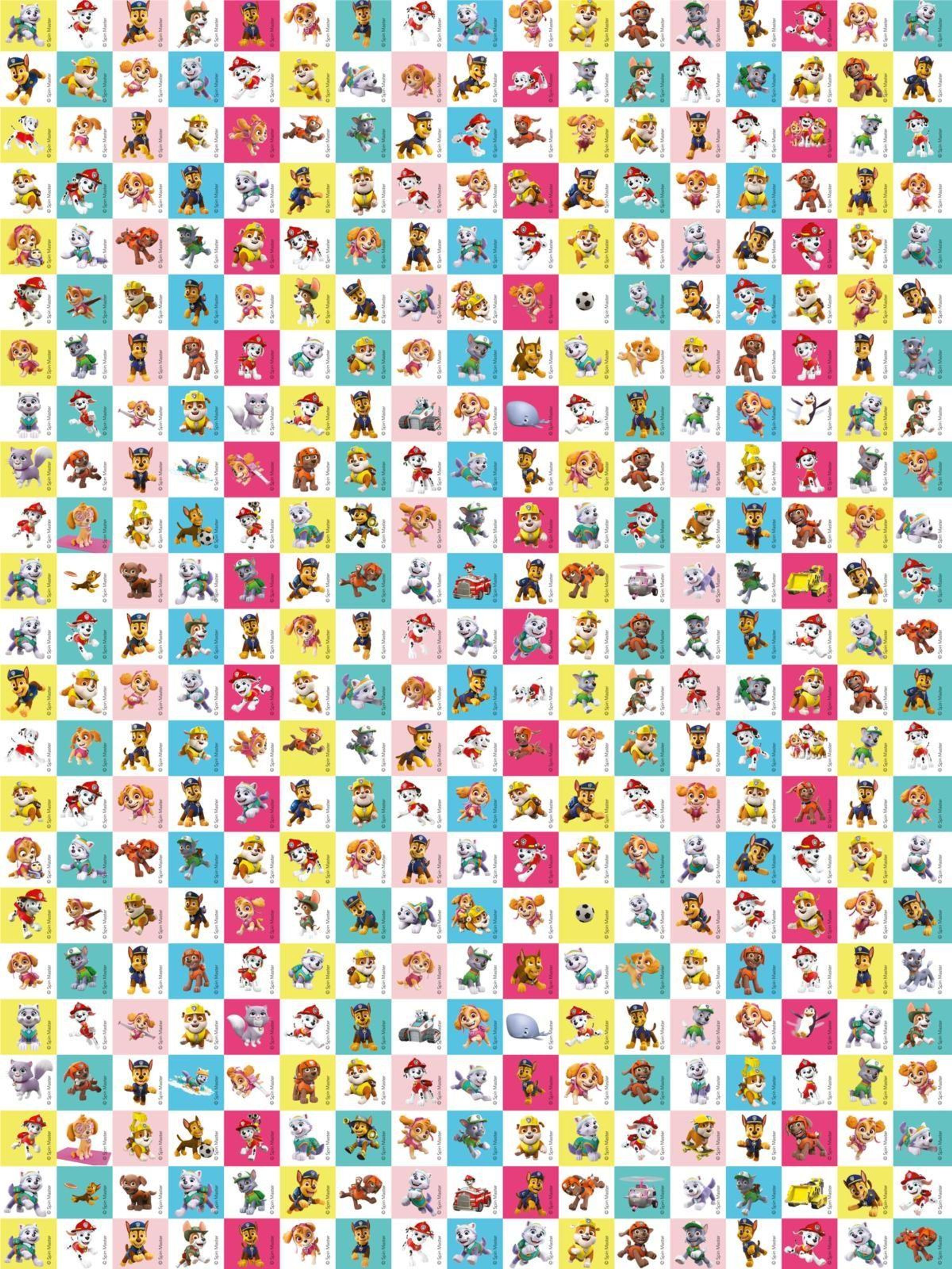 "1000 Sticker", "Mit tollen Rätseln und Ausmalbildern!". Illustration mit Paw Patrol Hunden und bunten Pfotenabdrücken., Buch