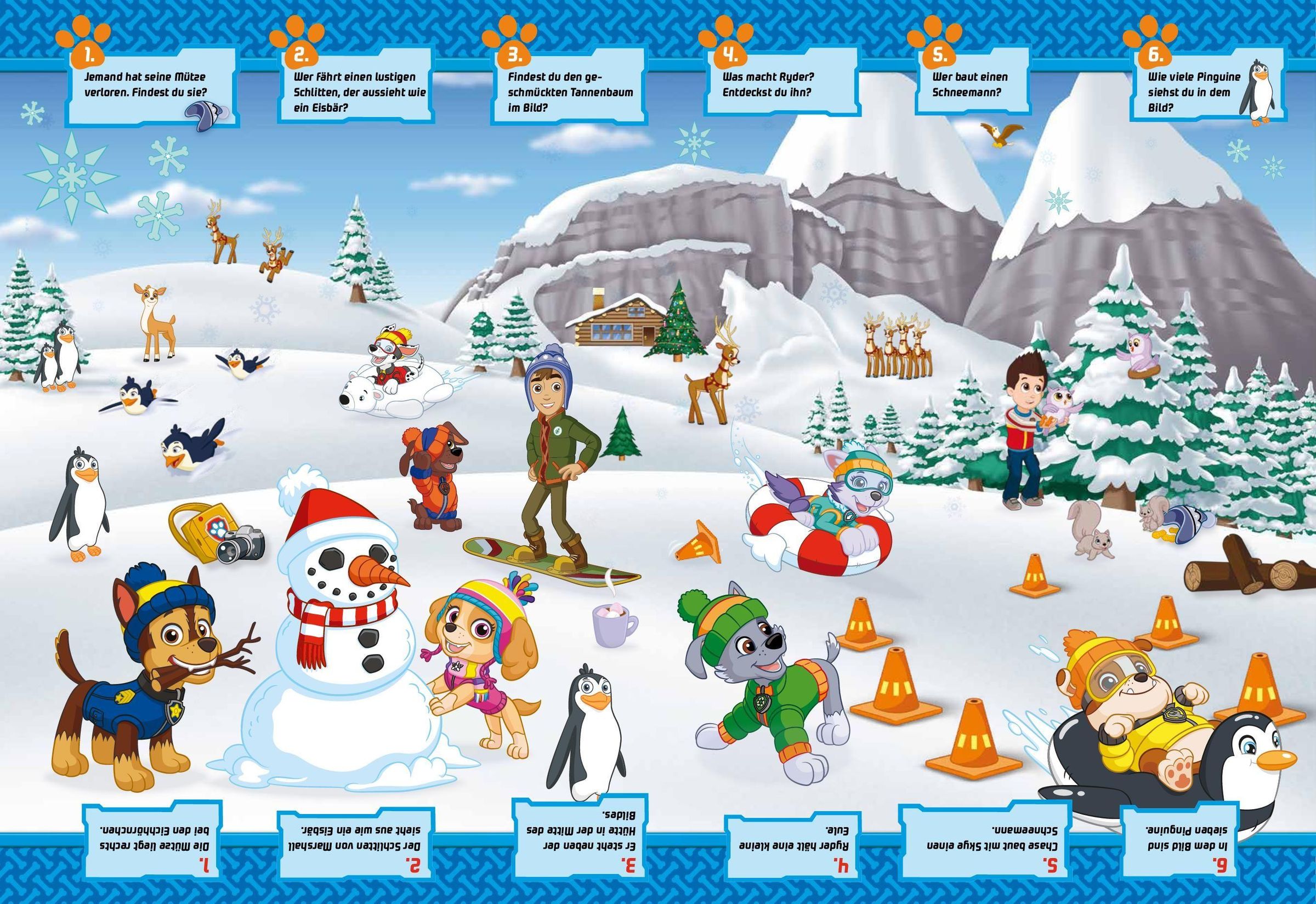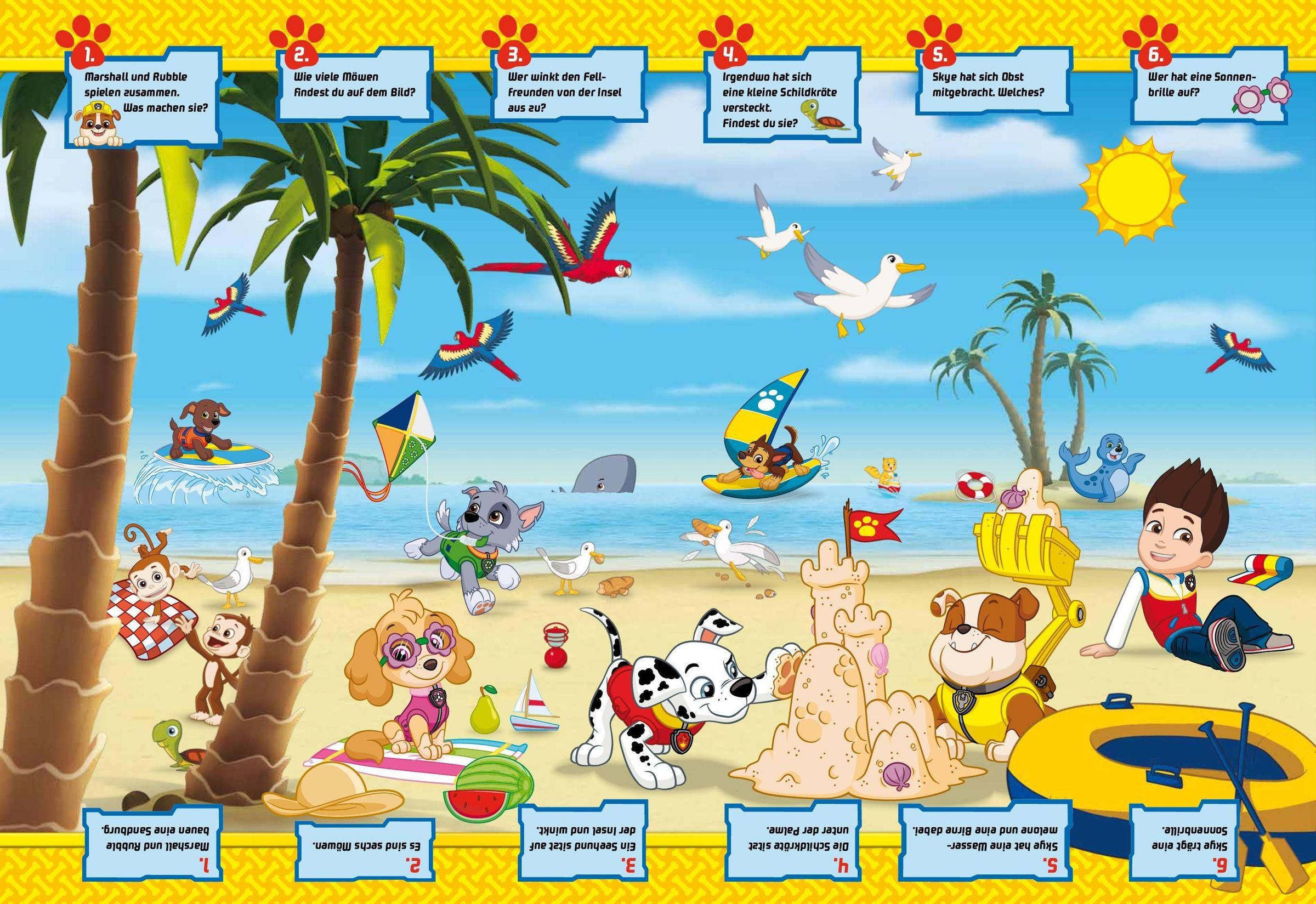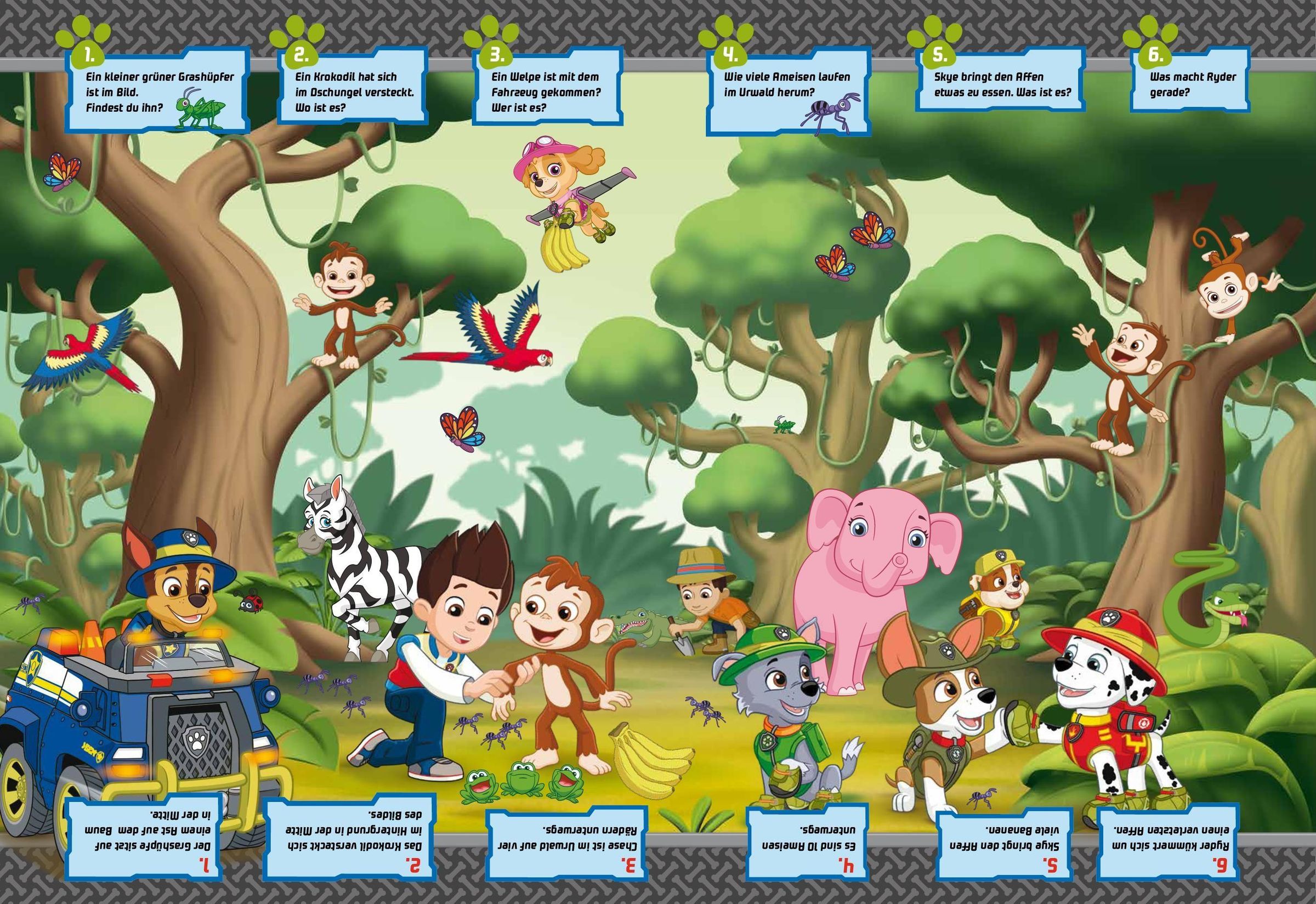 Mit der Paw Patrol erlebst du 5 actionreiche Szenerien voller Missionen. Kinder finden Figuren, zählen Fahrzeuge und erzählen Abenteuer -- und kontrollieren mit Lösungen. Das Großformat zeigt viele Details, der weiche Einband liegt sicher in Kinderhänden.