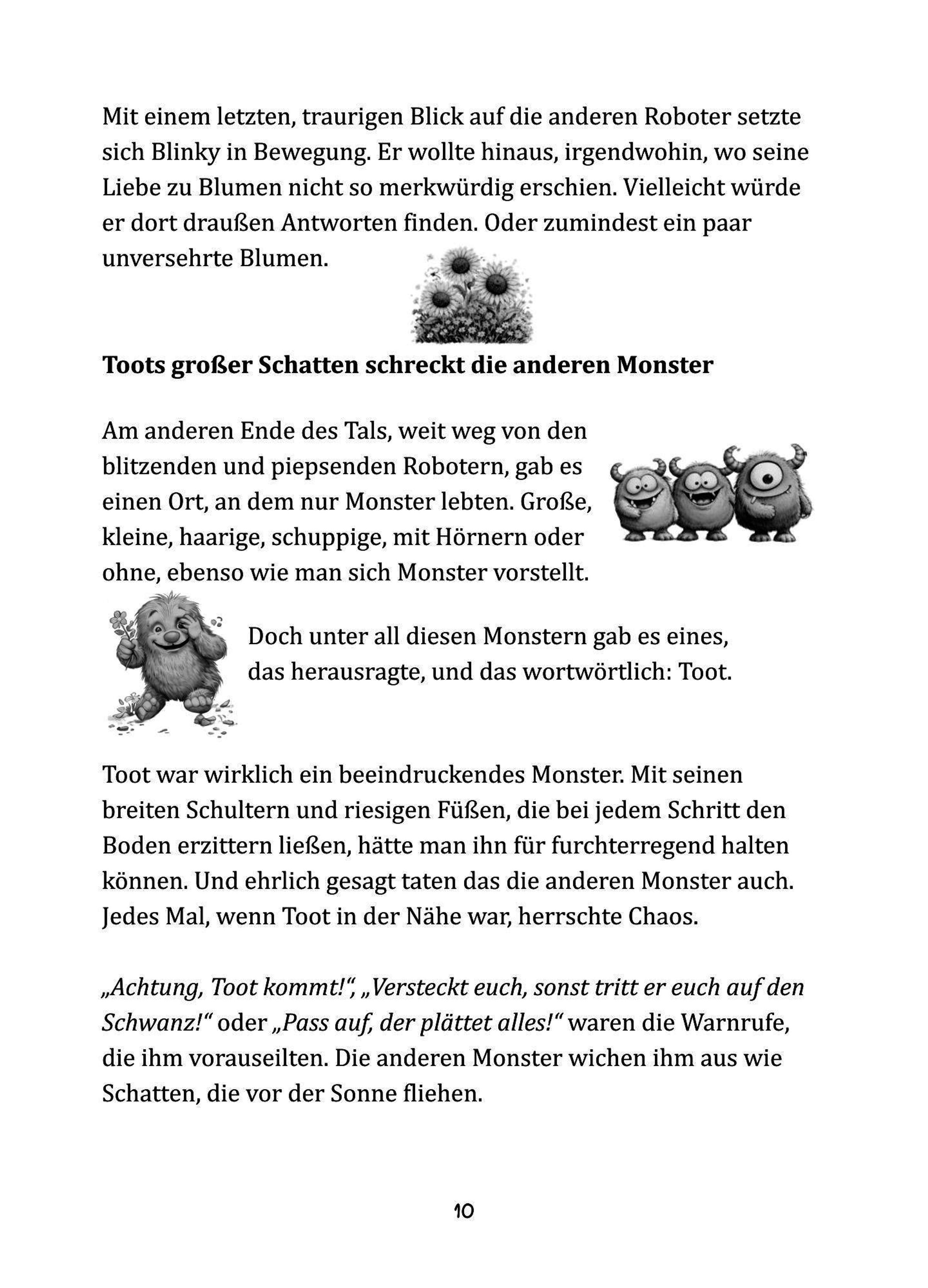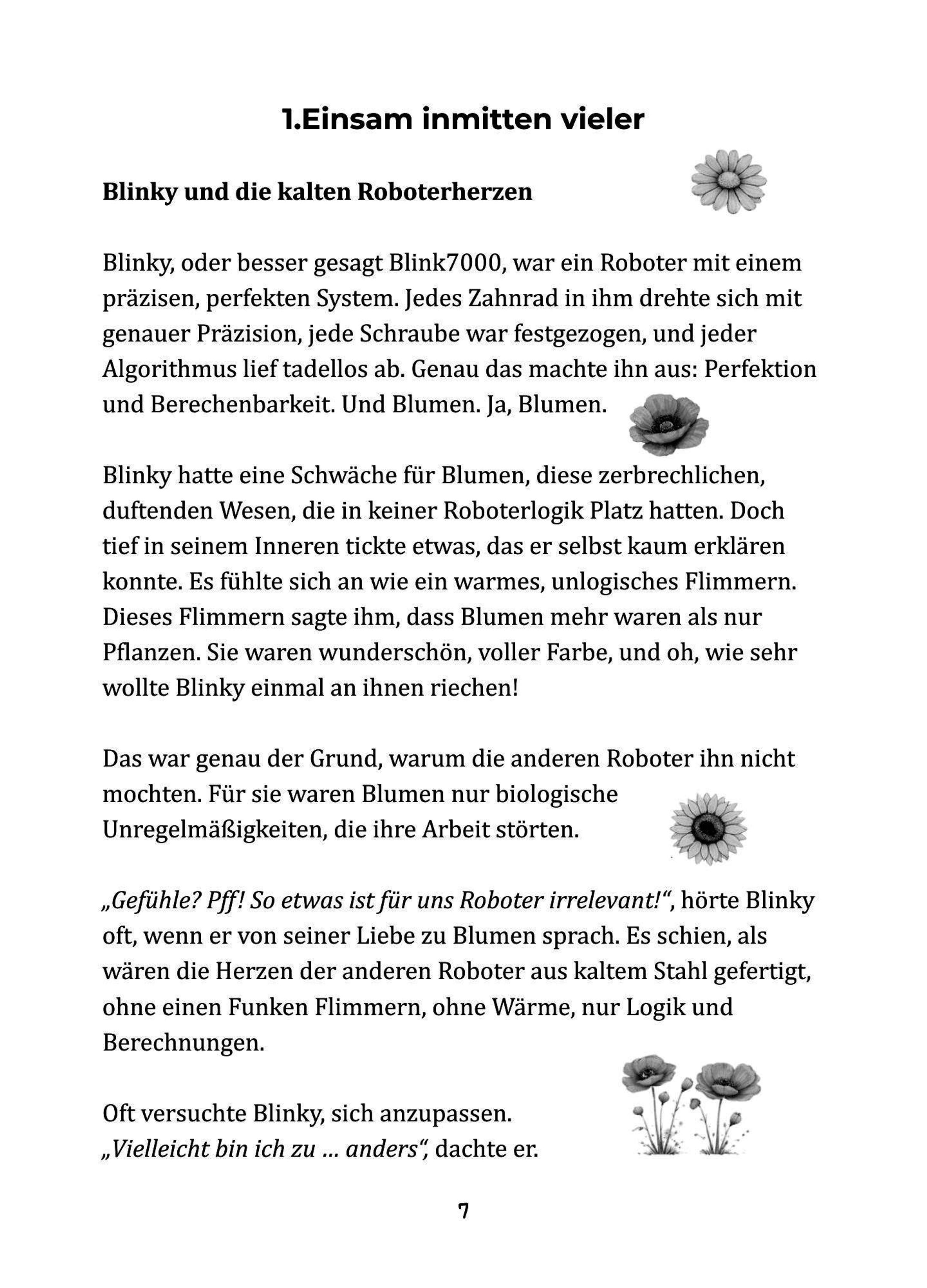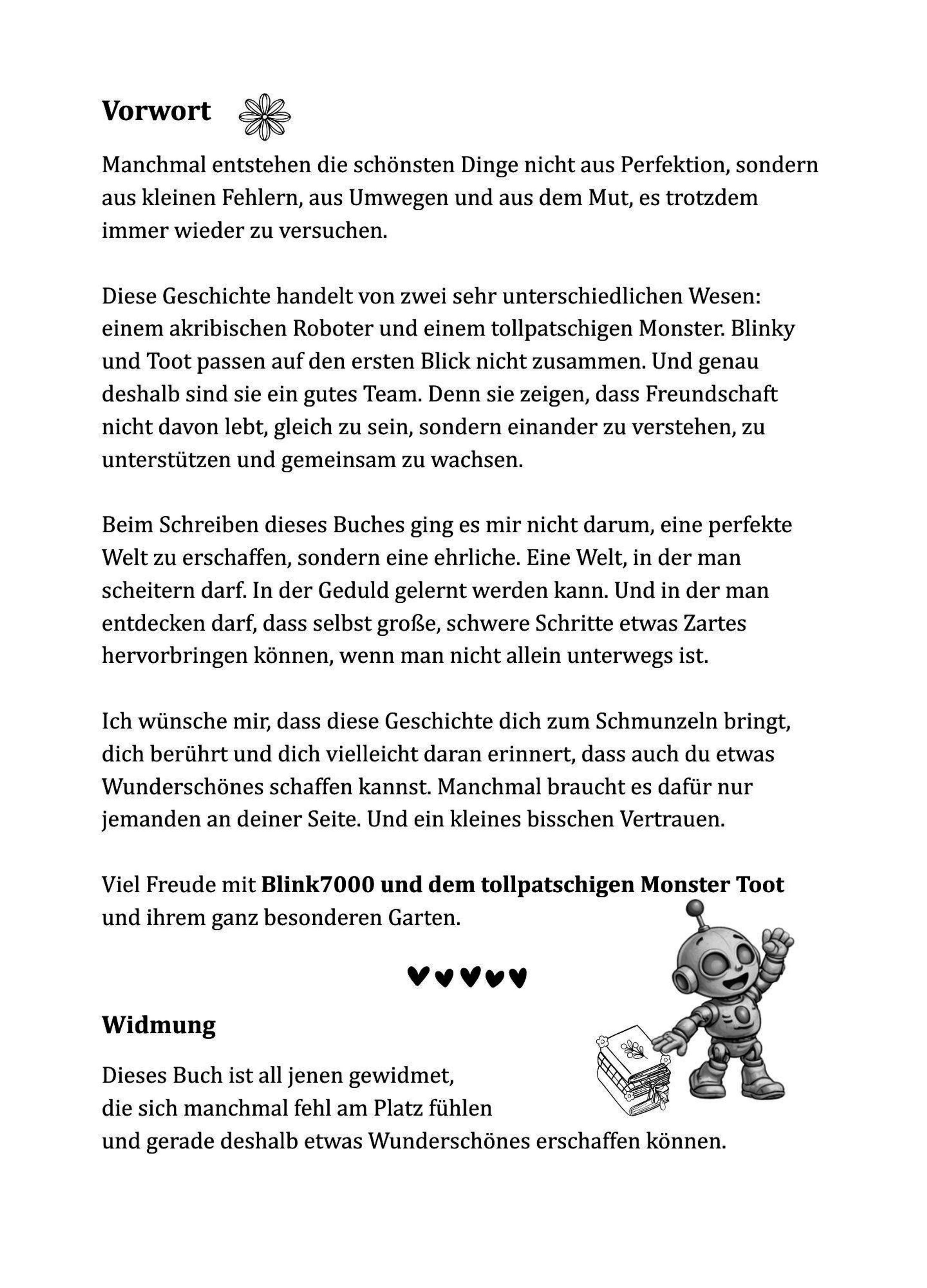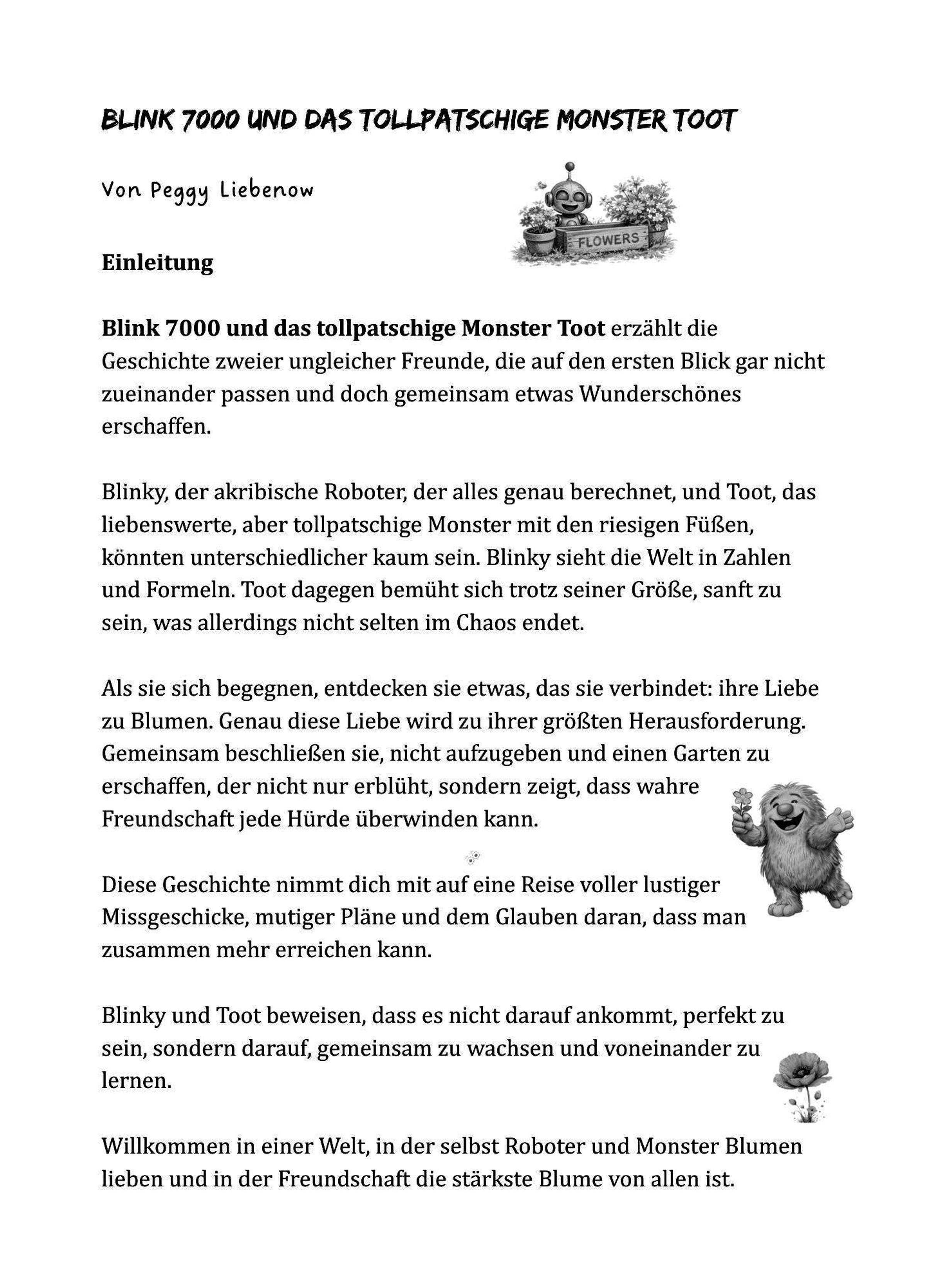 "Blink 7000 und das tollpatschige Monster Toot" erzählt die warmherzige Geschichte zweier Außenseiter, die unterschiedlicher kaum sein könnten. Blinky denkt in Zahlen, Formeln und perfekten Berechnungen. Toot dagegen fühlt mit seinem großen Herzen, doch seine riesigen Füße machen jede vorsichtige Bewegung zur Herausforderung. Beide lieben Blumen - und beide scheitern immer wieder daran, sie unversehrt zu pflücken.