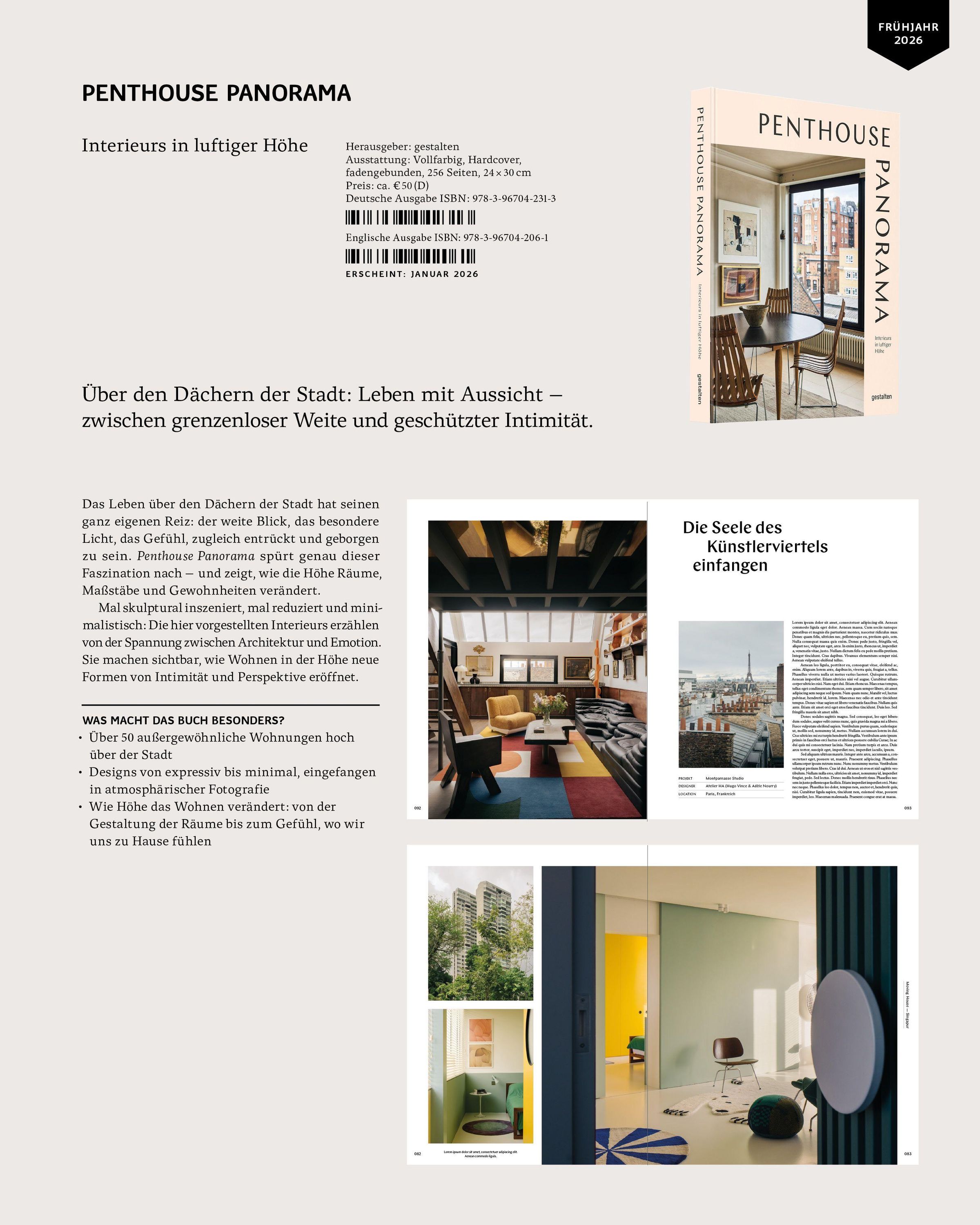 Das Leben über den Dächern der Stadt hat seinen ganz eigenen Reiz: der weite Blick, das besondere Licht, das Gefühl, zugleich entrückt und geborgen zu sein. Penthouse Panorama spürt genau dieser Faszination nach - und zeigt, wie die Höhe Räume, Maßstäbe und Gewohnheiten verändert. Mal skulptural inszeniert, mal reduziert und minimalistisch: Die hier vorgestellten Interieurs erzählen von der Spannung zwischen Architektur und Emotion. Sie machen sichtbar, wie Wohnen in der Höhe neue Formen von Intimität und Perspektive eröffnet.