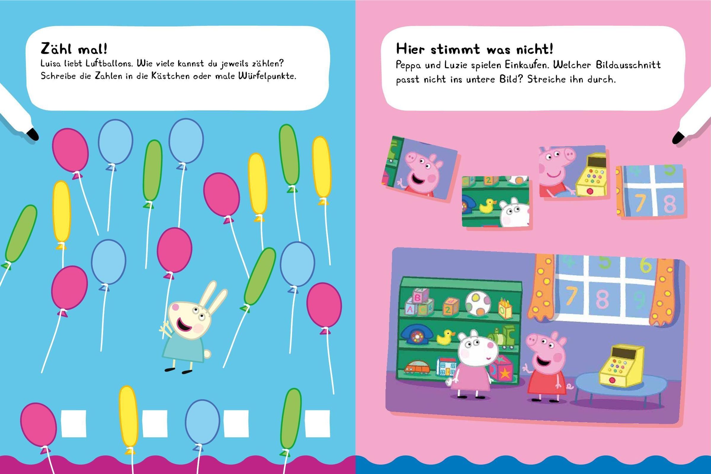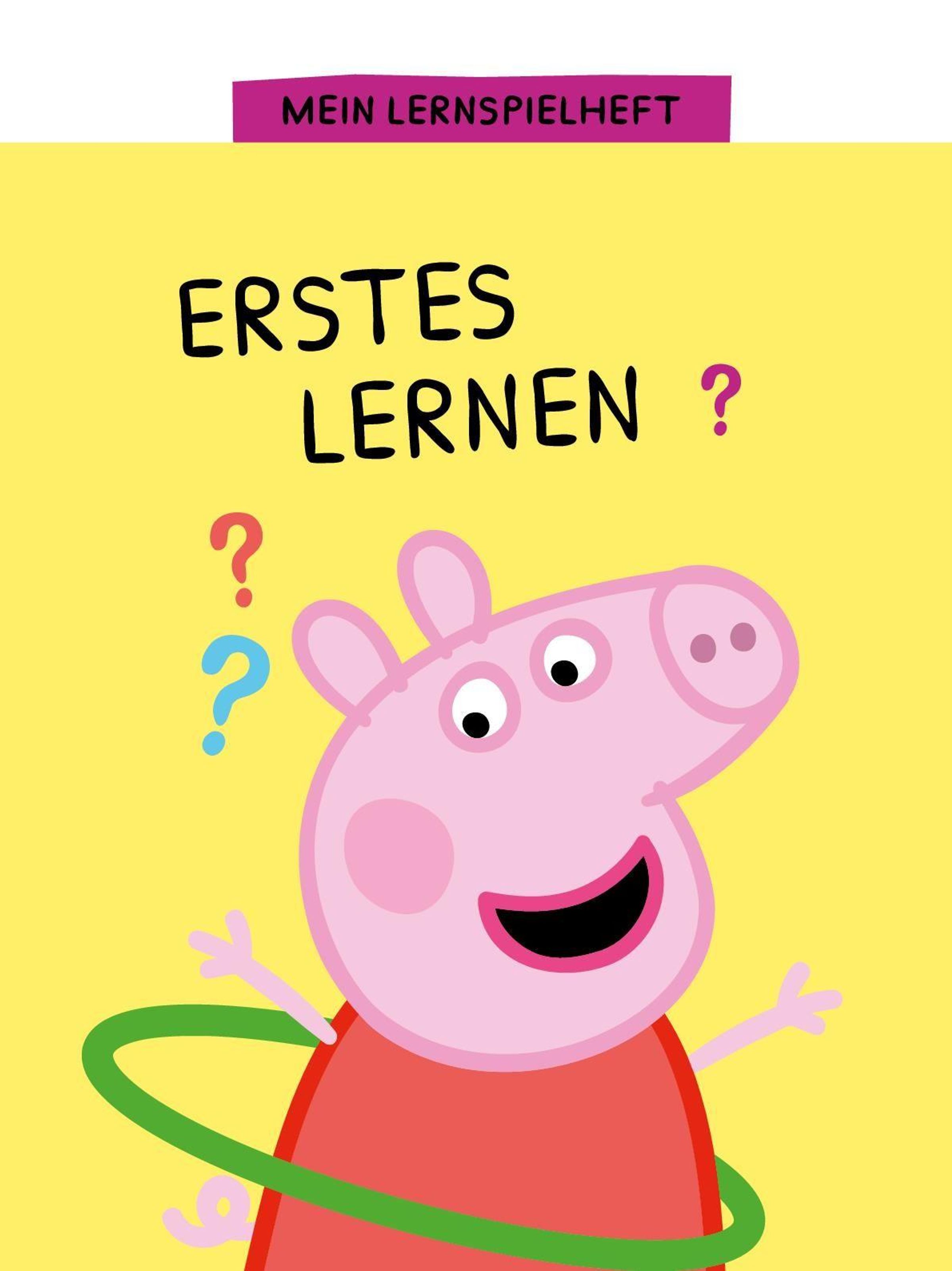 „Erstes Lernen“, „Mein Lernspielheft“, „Mit Stift und abwischbaren Seiten“, Peppa Pig Illustration mit rosa Schwein., Buch