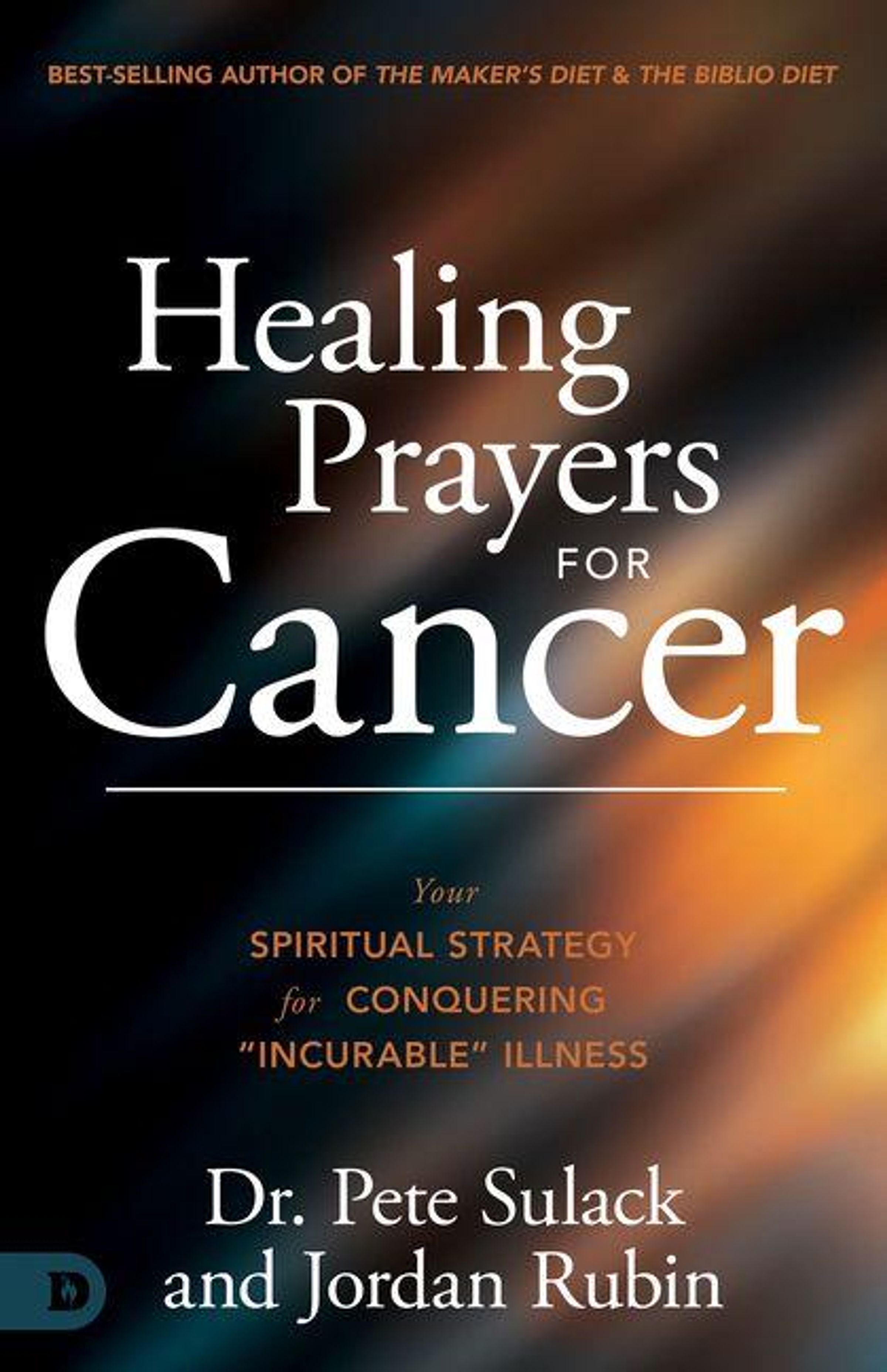 "Healing Prayers for Cancer" von Dr. Pete Sulack und Jordan Rubin. Farbverlauf Hintergrund in Dunkelblau und Orange., Buch