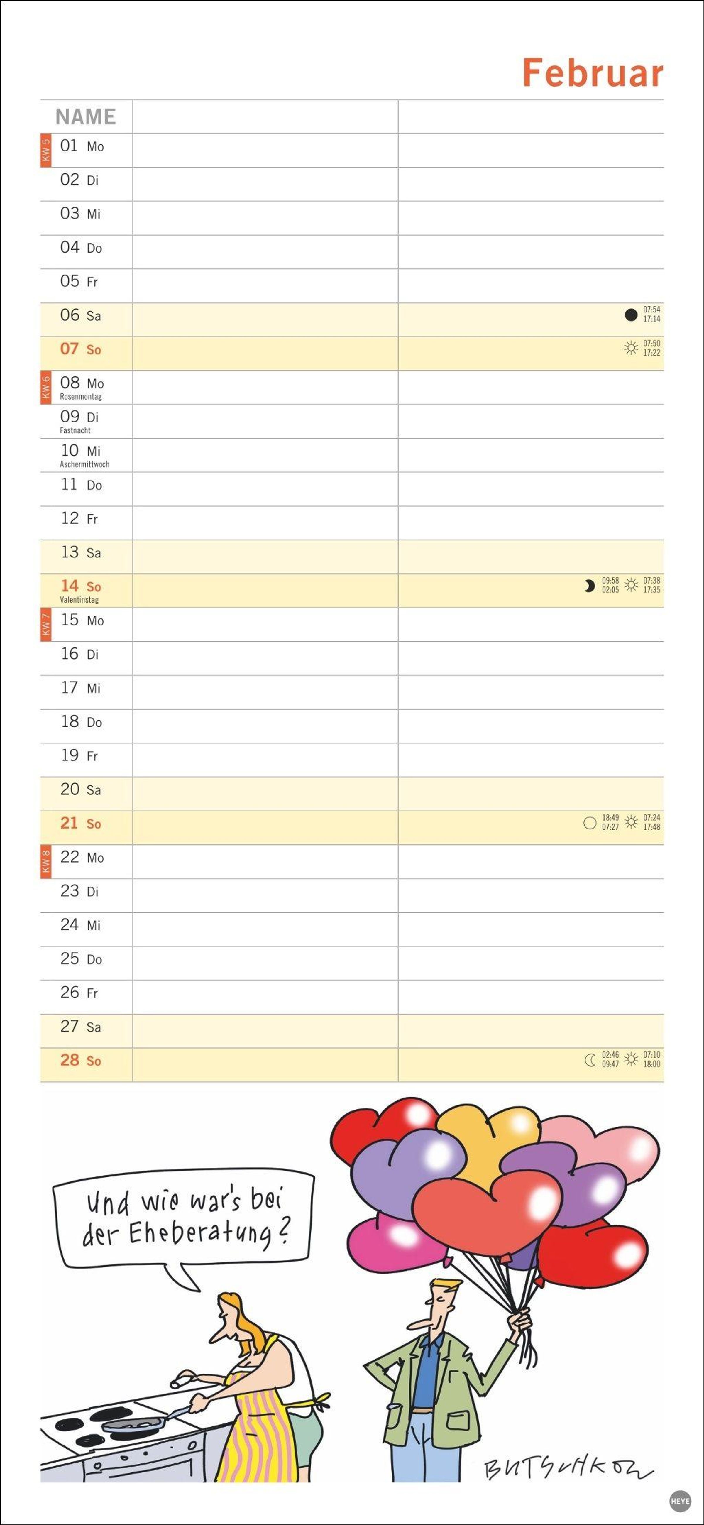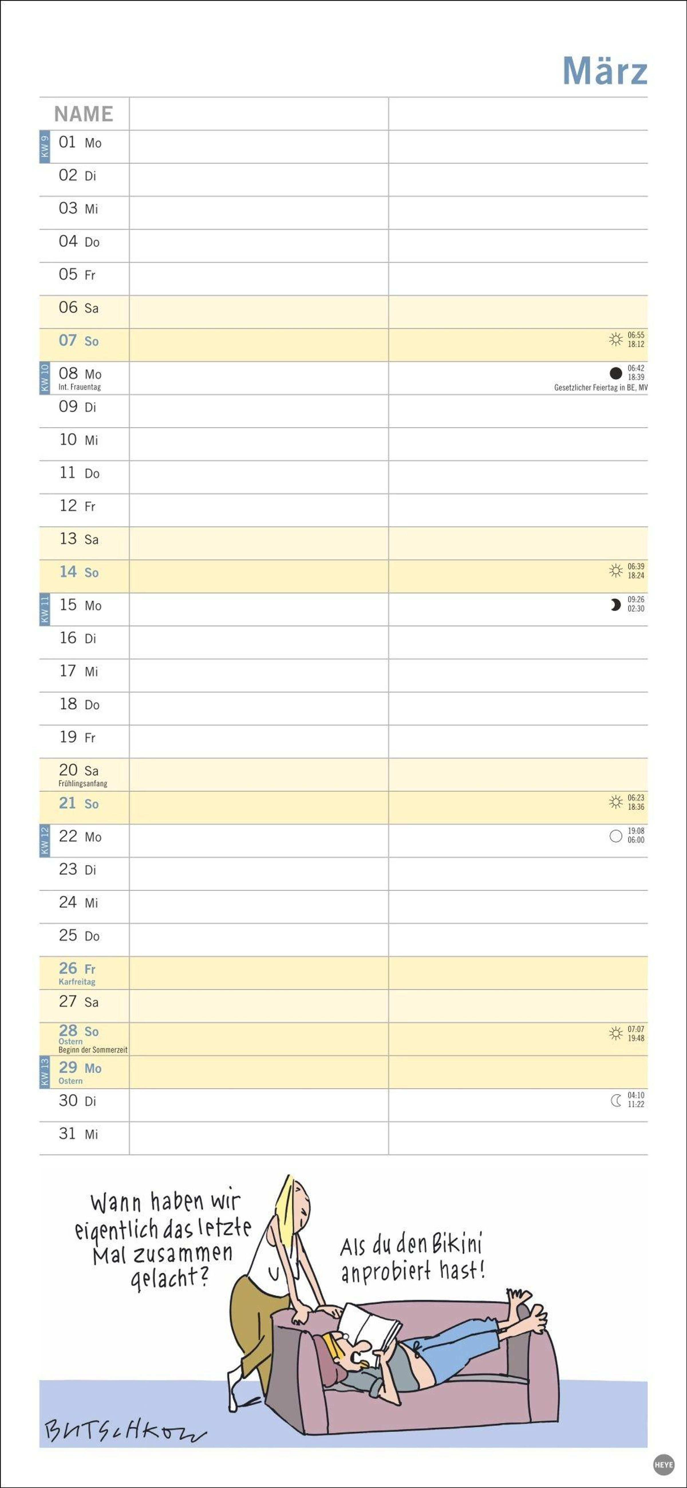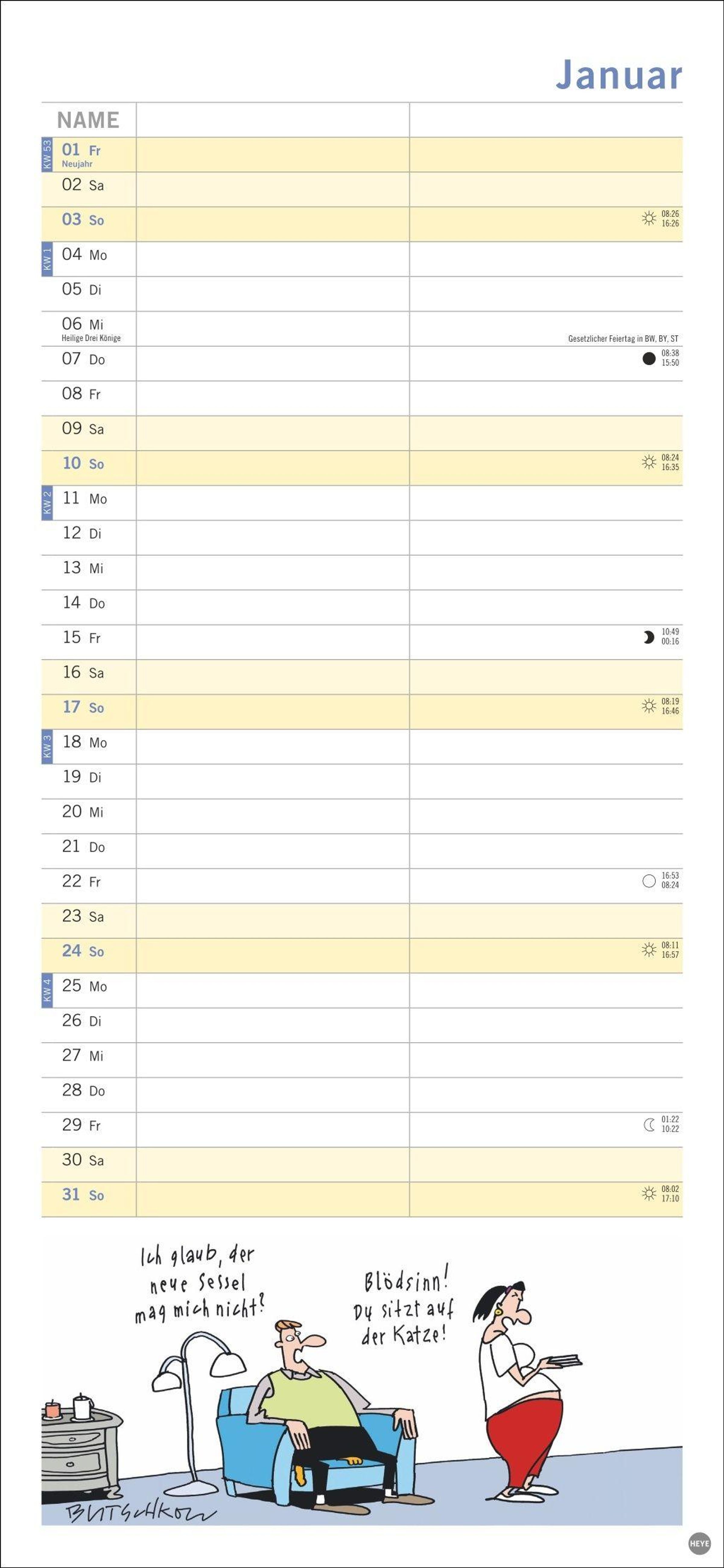 Macht die Planung zum Vergnügen: Das Kalenderformat 16 x 34, 7 cm bietet viel Platz für Eintragungen und für Butschkows witzige Cartoons