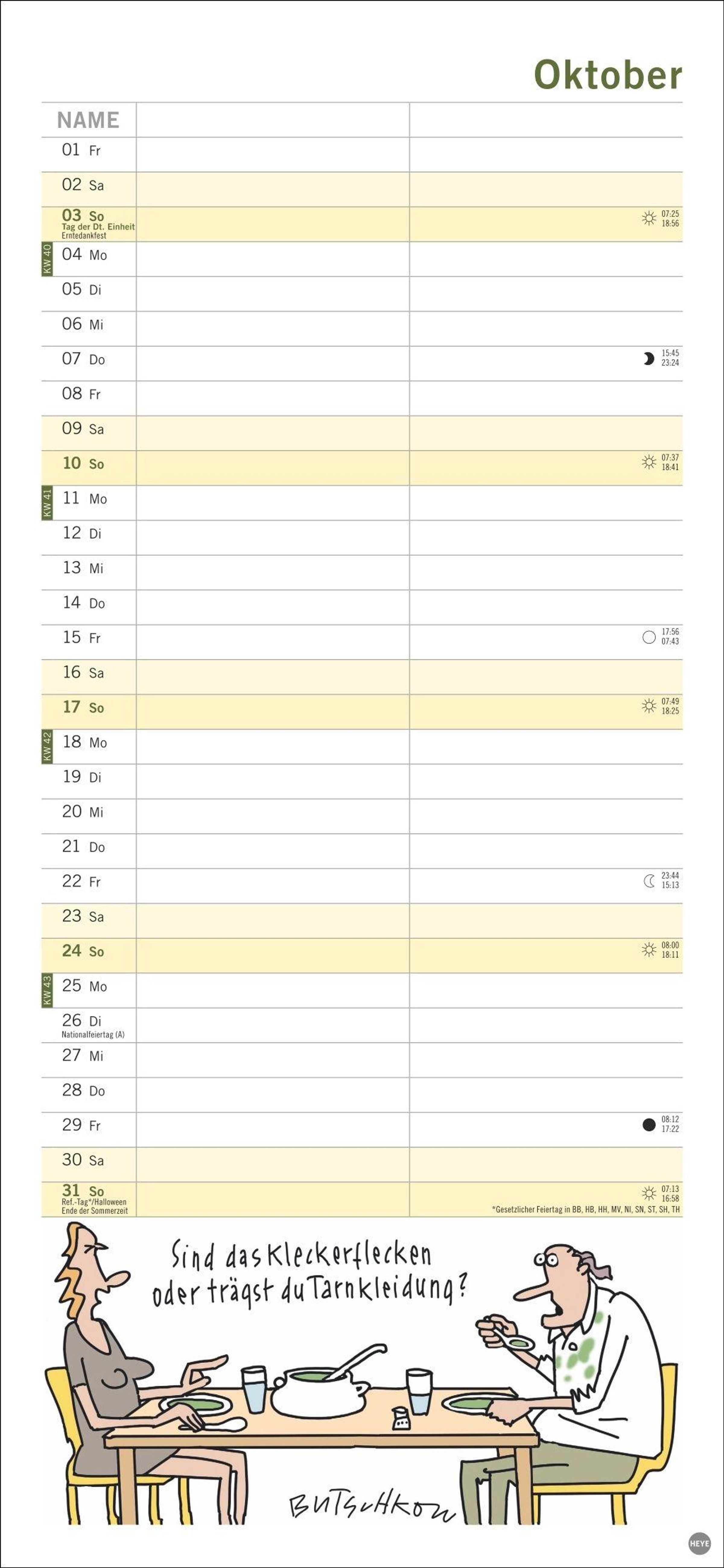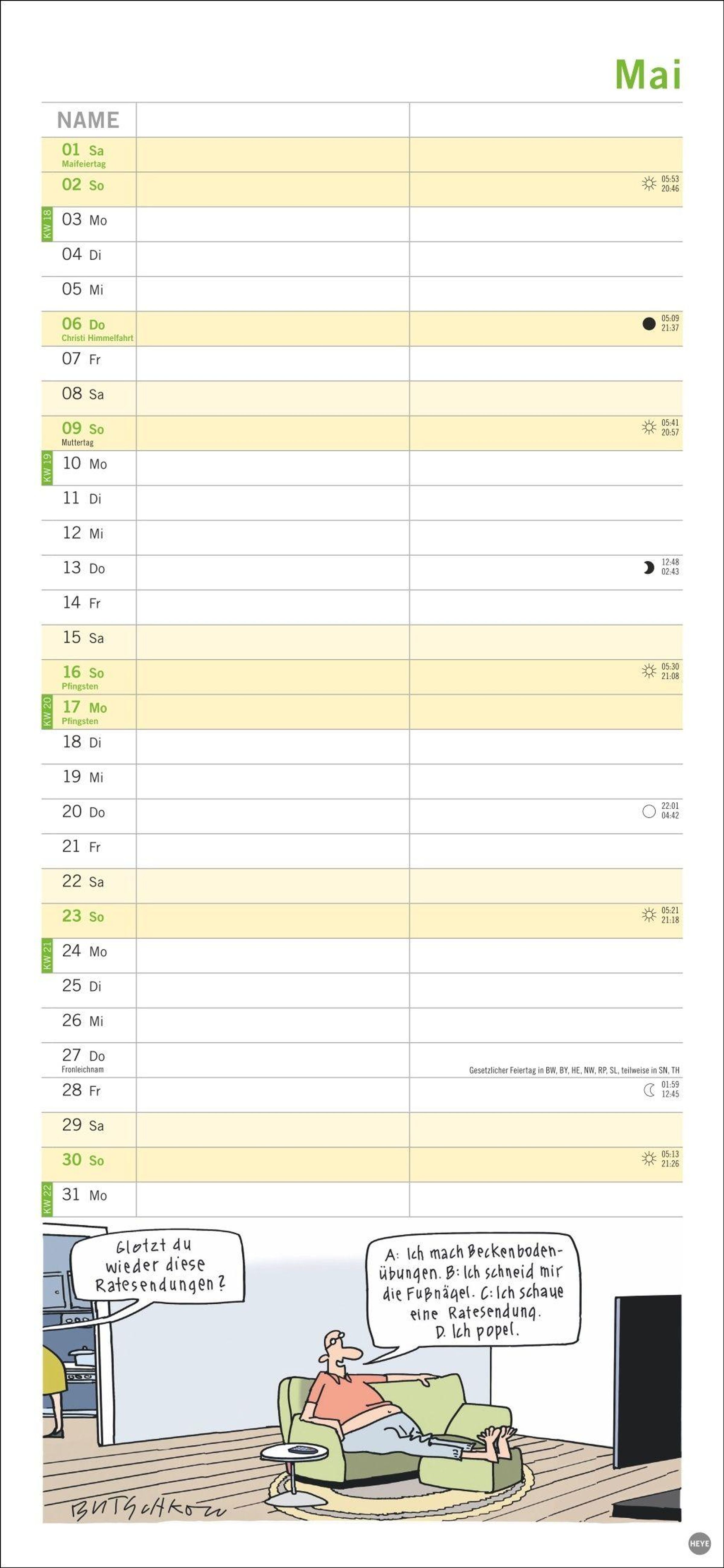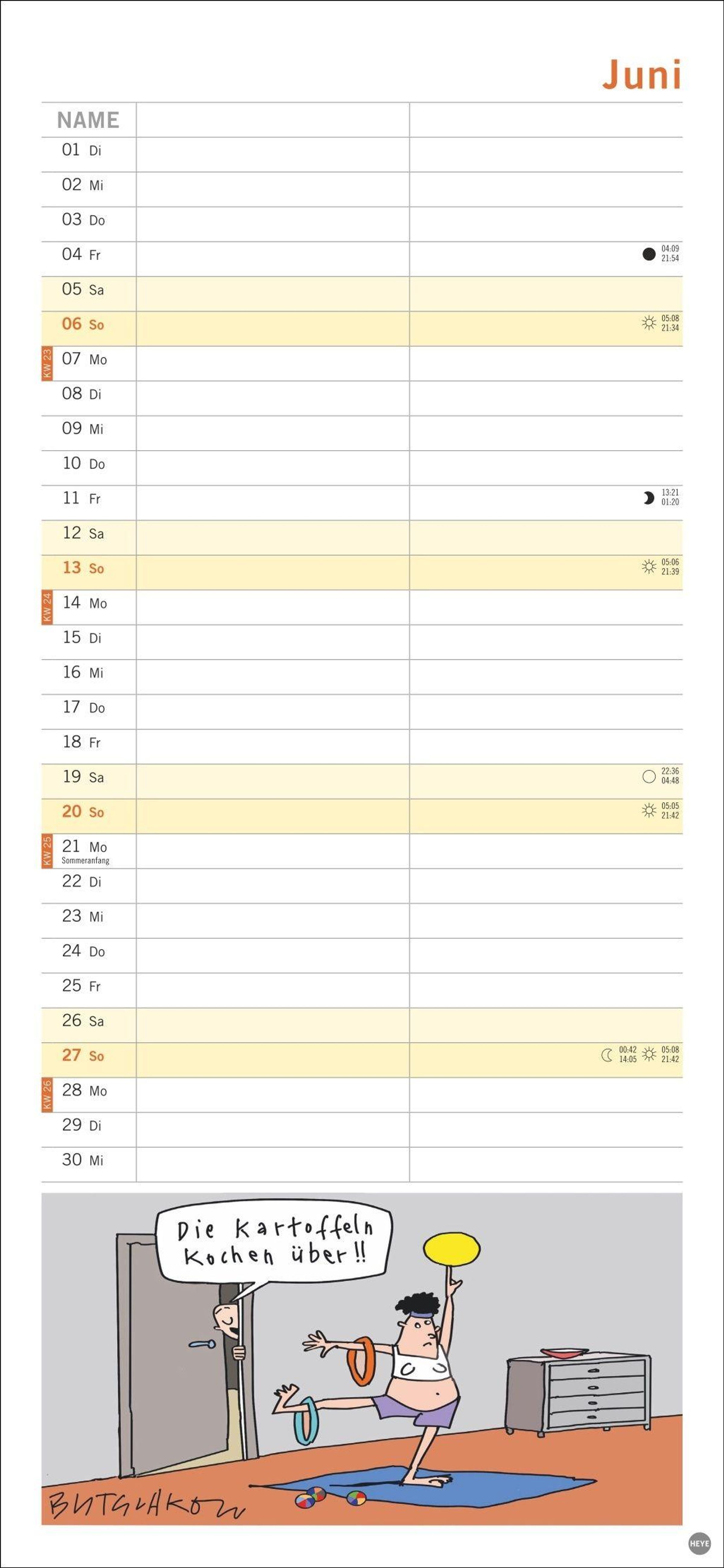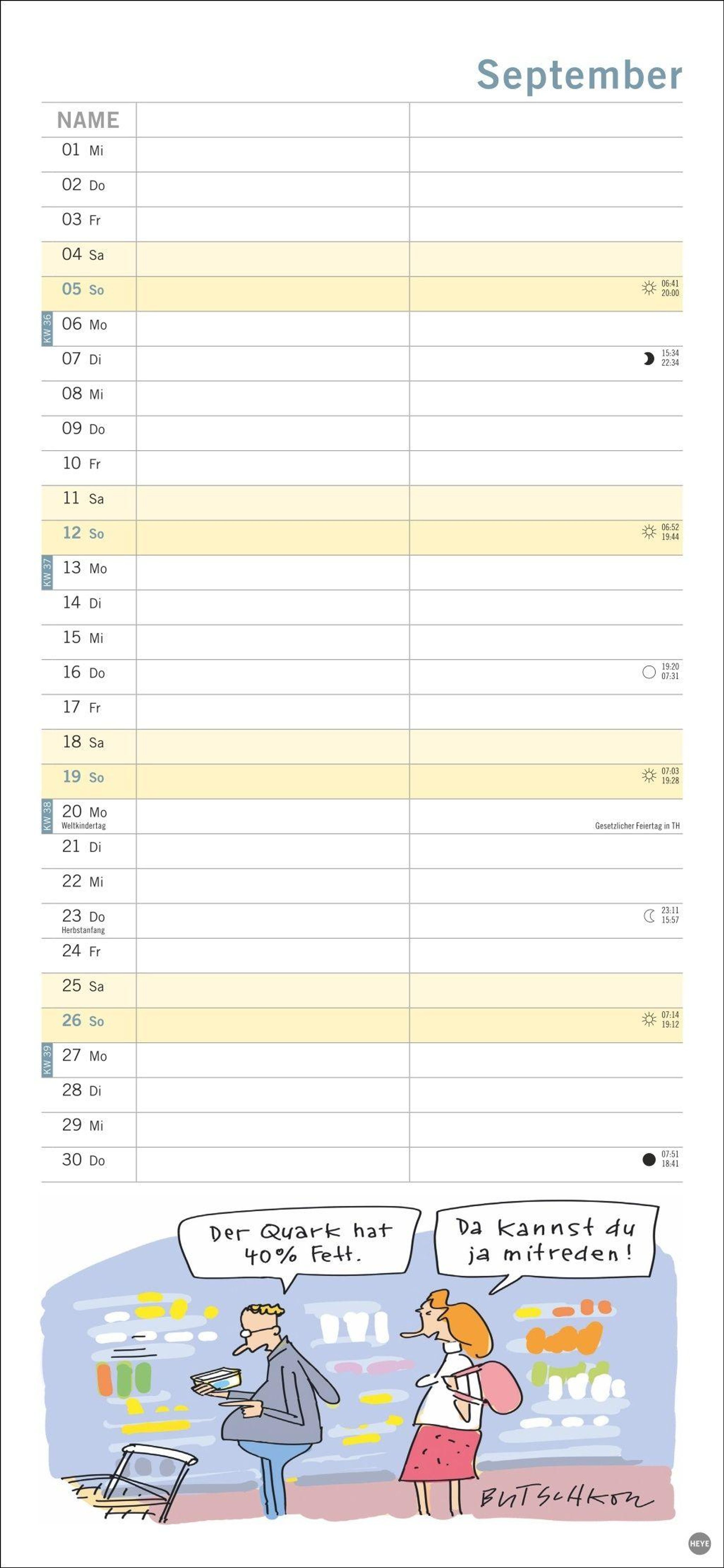 Macht die Planung zum Vergnügen: Das Kalenderformat 16 x 34, 7 cm bietet viel Platz für Eintragungen und für Butschkows witzige Cartoons