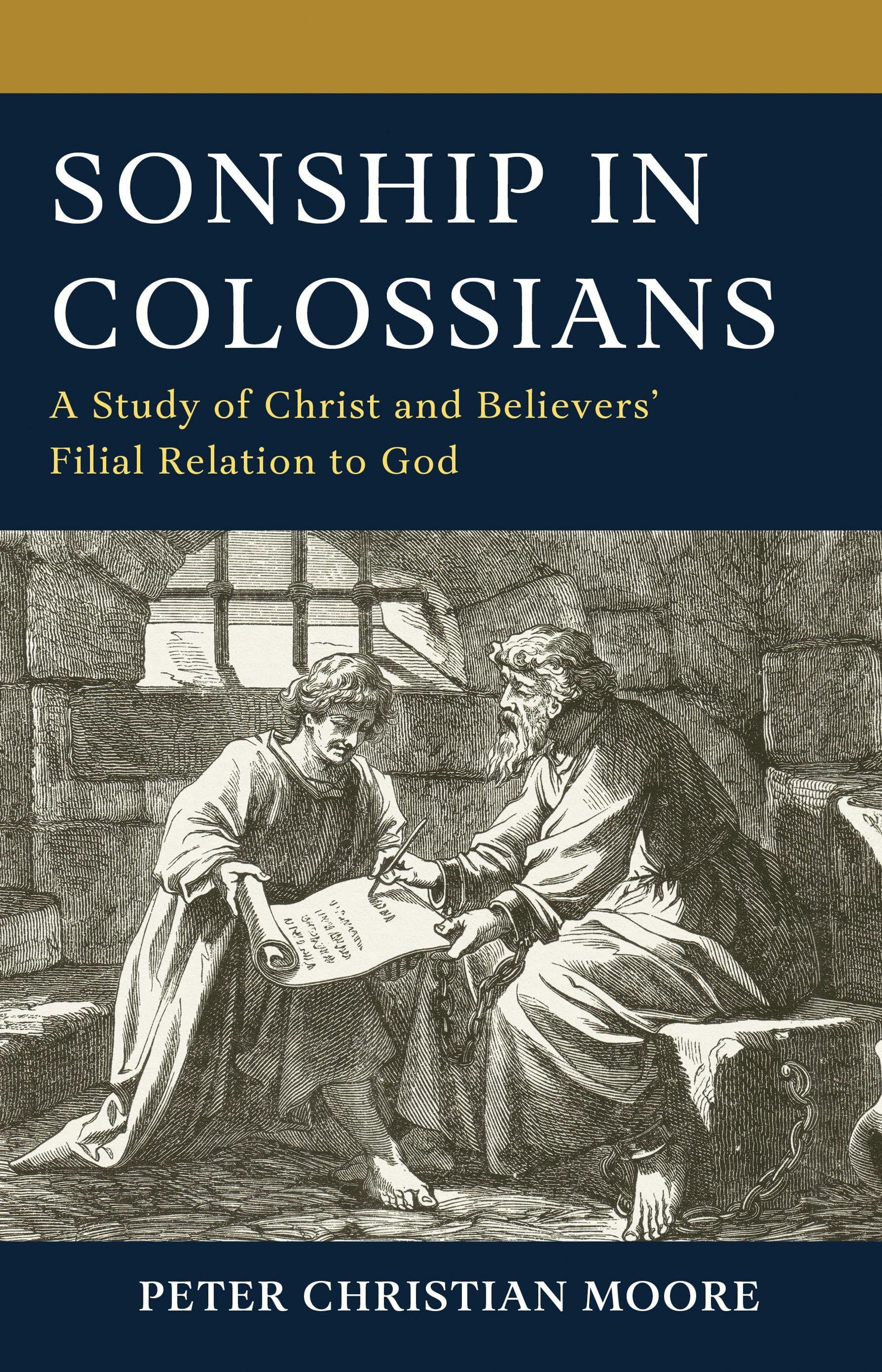 "Sonship in Colossians", Peter Christian Moore. Illustration: Zwei Männer in antiker Kleidung, einer schreibt auf eine Schriftrolle., Buch
