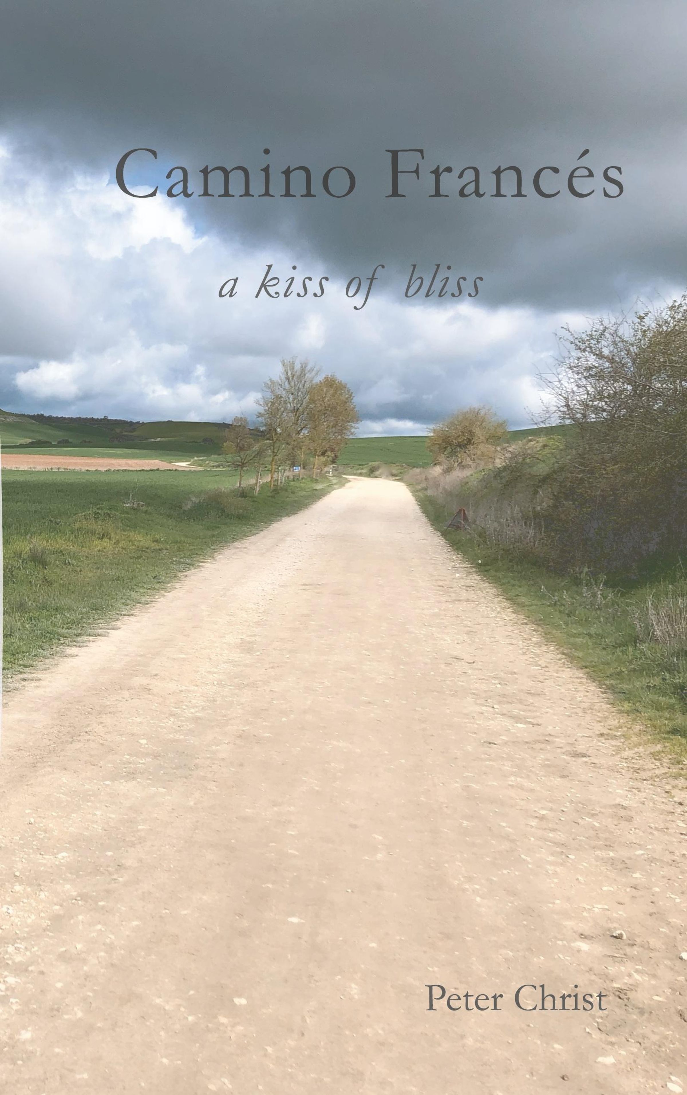 Text "Camino Francés, a kiss of bliss, Peter Christ". Ein Weg führt durch eine grüne Landschaft unter bewölktem Himmel., Buch