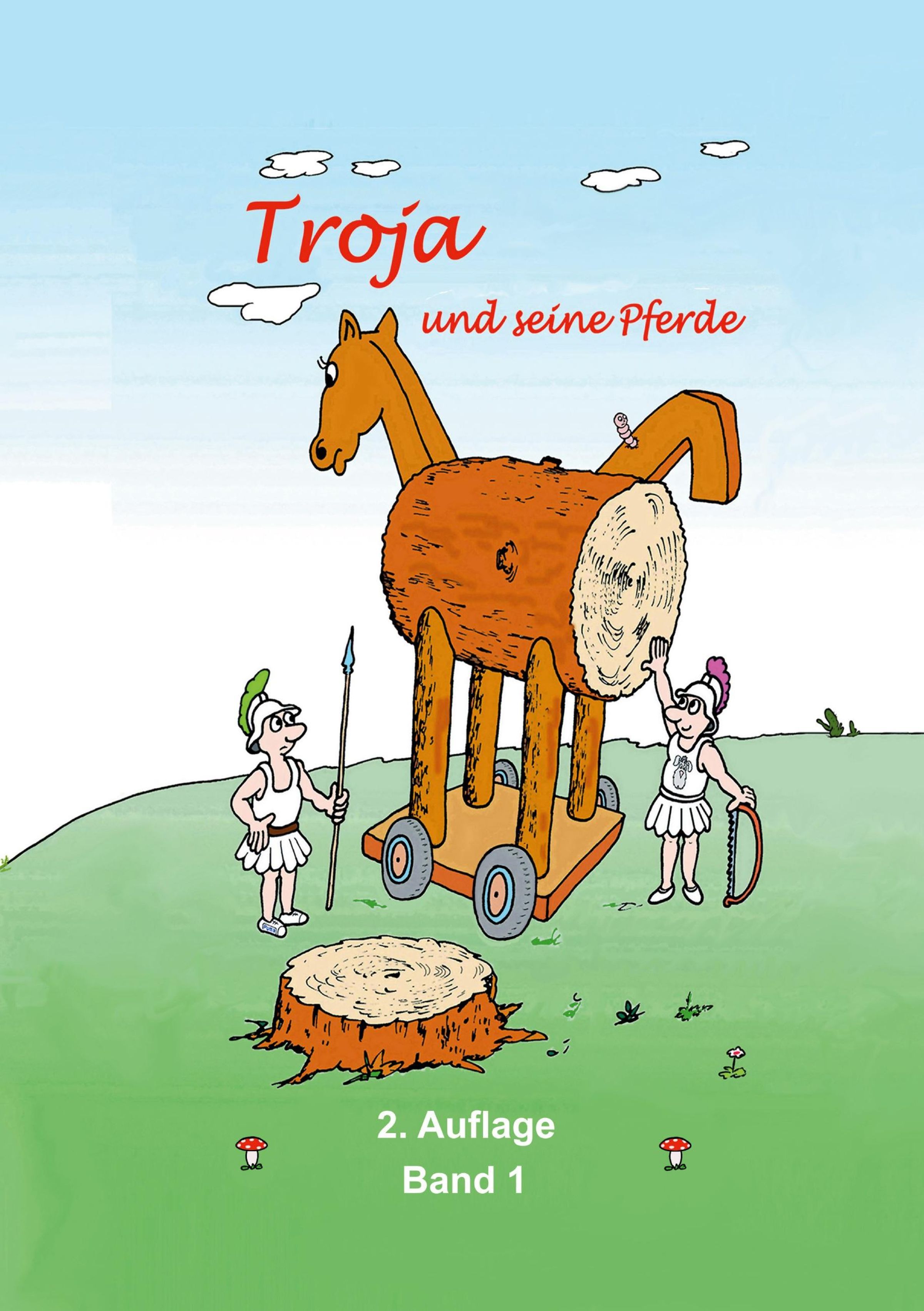 „Troja und seine Pferde“, „2. Auflage Band 1“. Illustration: Ein hölzernes Pferd auf Rädern mit zwei Soldaten., Buch