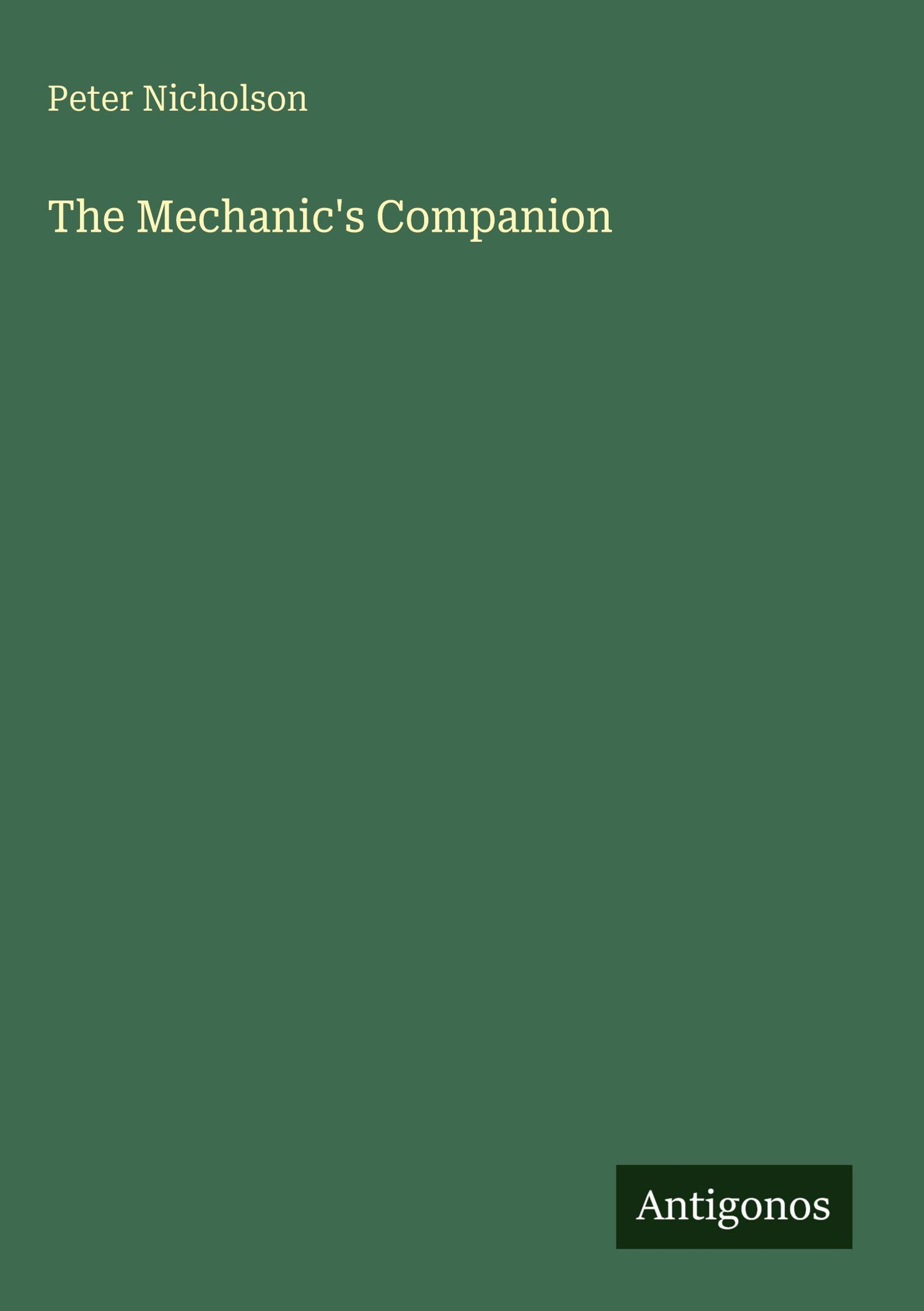 Text: "Peter Nicholson, The Mechanic's Companion, Antigonos". Grüner Hintergrund, schlichtes Design in Weiß., Buch