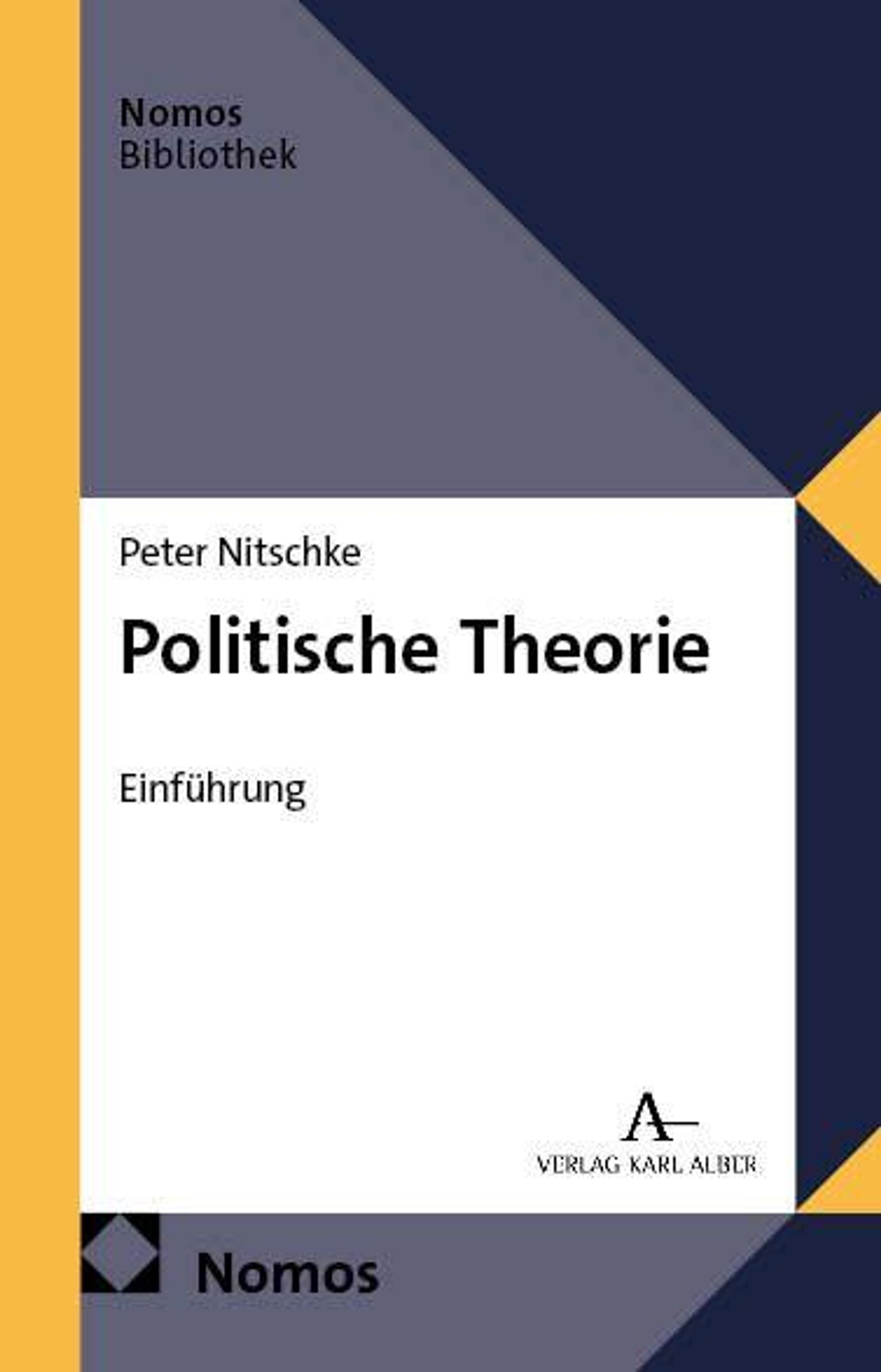 „Peter Nitschke, Politische Theorie, Einführung“. Verlag Karl Alber Logo, blau-gelbes Coverdesign, „Nomos Bibliothek“., Buch