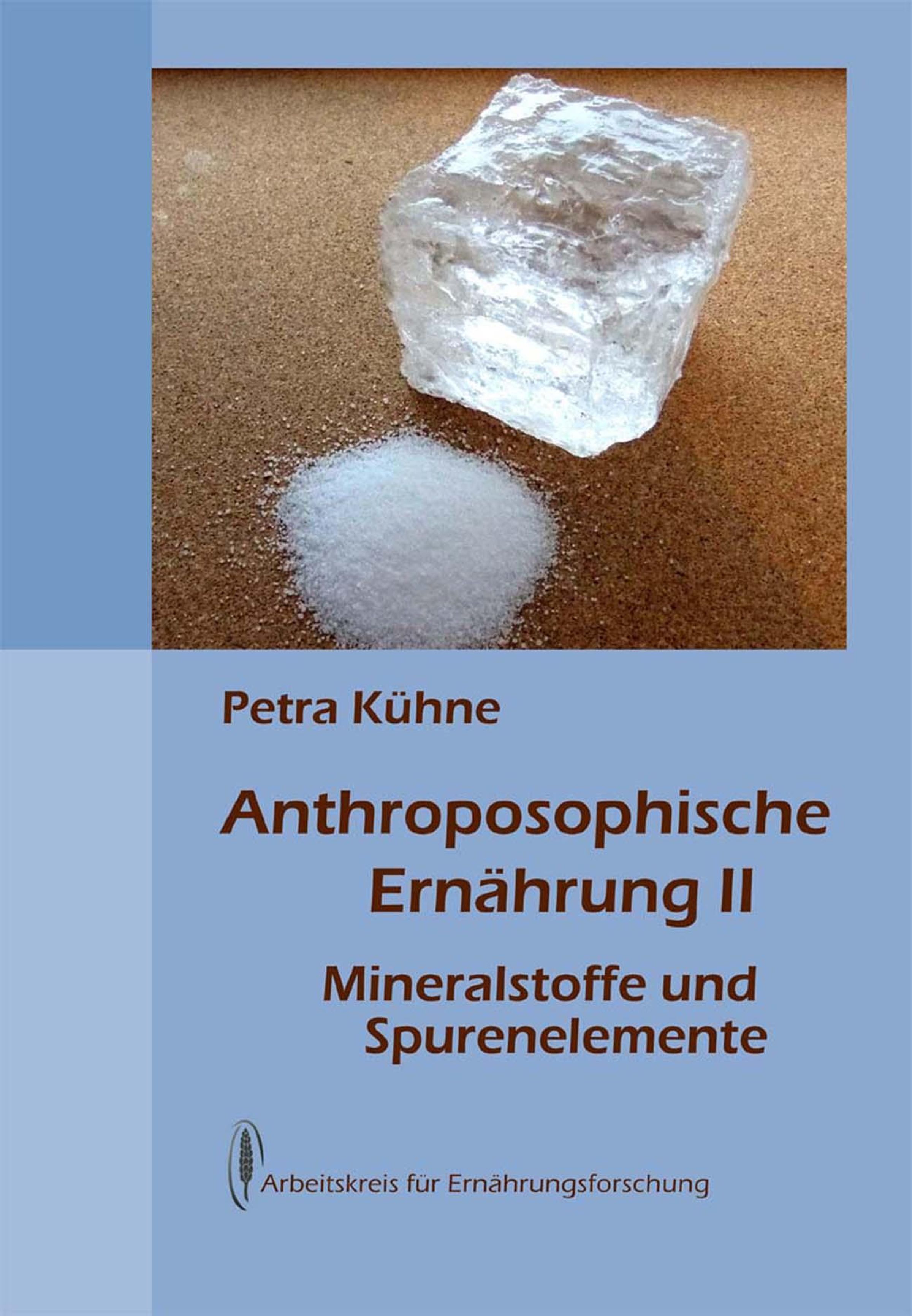 Text: "Petra Kühne, Anthroposophische Ernährung II, Mineralstoffe und Spurenelemente, Arbeitskreis für Ernährungsforschung." Oben ist ein Salzblock und Salzstreu., Buch