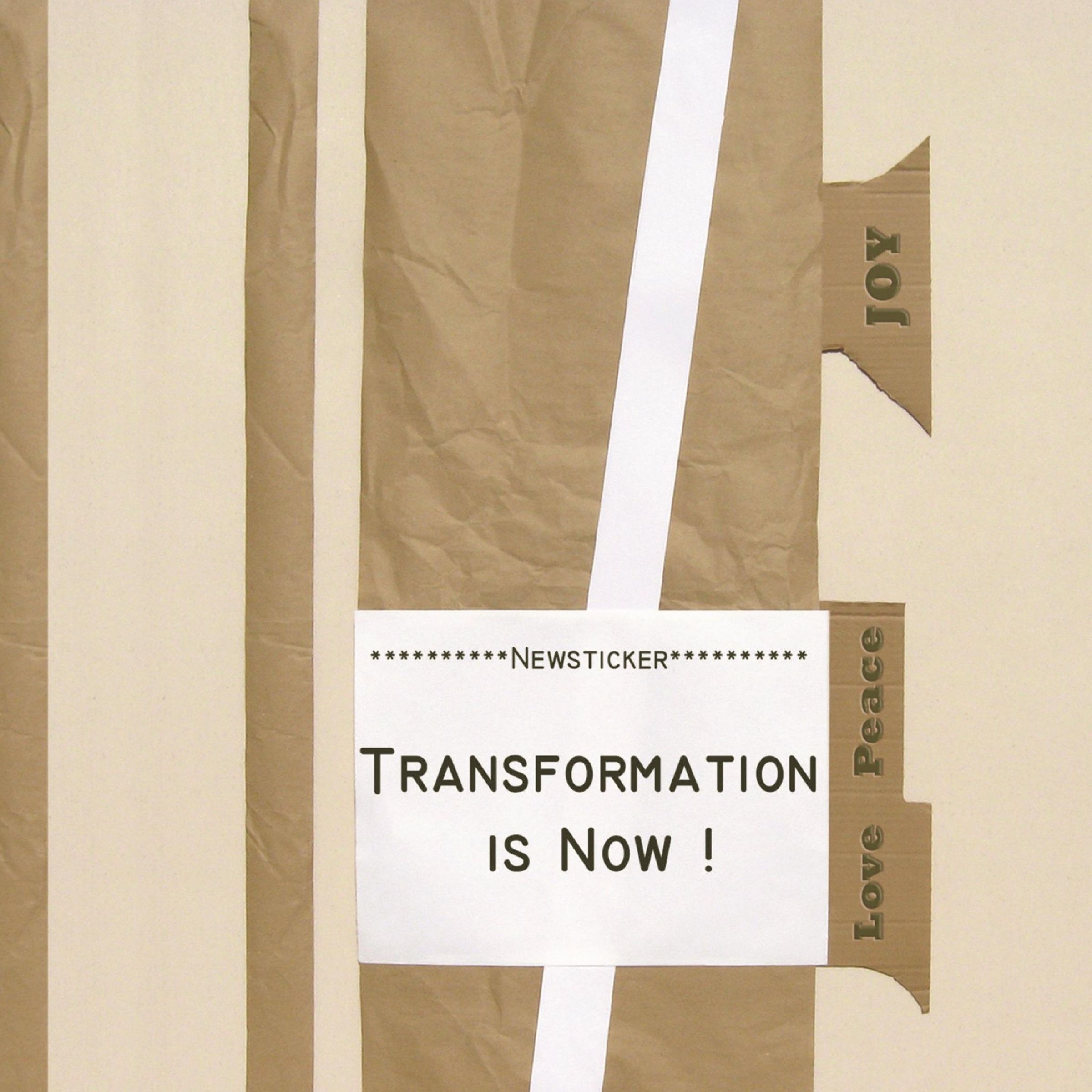 "********Newsticker********* Transformation is Now! Joy, Love, Peace" steht auf Papierstreifen in einem abstrakten Design., Buch
