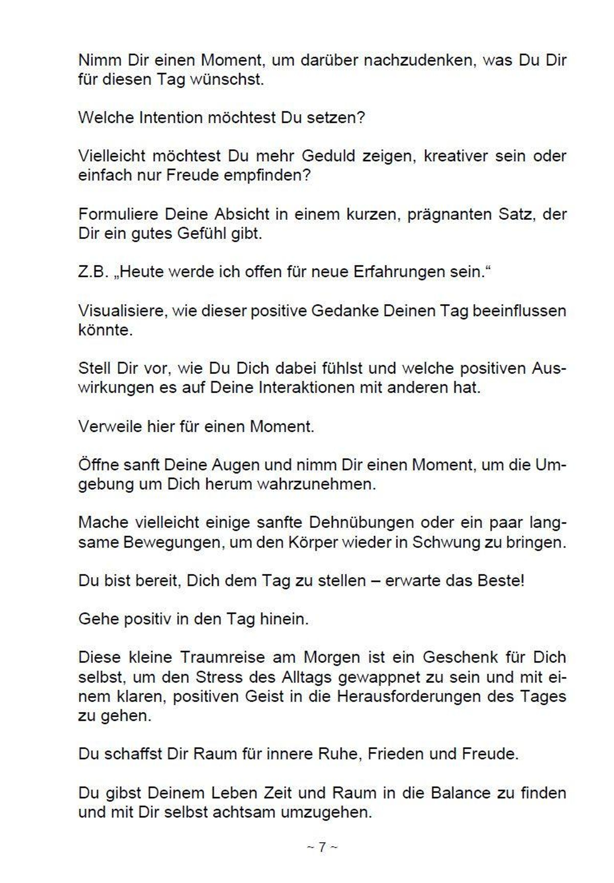 Du kannst diese Traumreisen aus diesem Buch auf 3 Arten nutzen: Du liest die Texte einem anderen oder mehreren Menschen vor, damit diese eine geführte Traumreise genießen können. Du liest die Texte für Dich selbst und machst an den Stellen immer kleine Pausen, damit Deine Fantasie auch genug Zeit hat, sich alles vorzustellen. Du liest die Texte, während Du mit einem Aufnahmegerät Deine Stimme aufnimmst. Das kann dein Handy sein, ein Diktiergerät oder ein anderes Aufnahmegerät. So liest Du erst die Traumreise und kannst sie dir hinterher mit Deiner eigenen Stimme öfters anhören und Dich dann mit geschlossenen Augen durch Deine Fantasie leiten lassen.