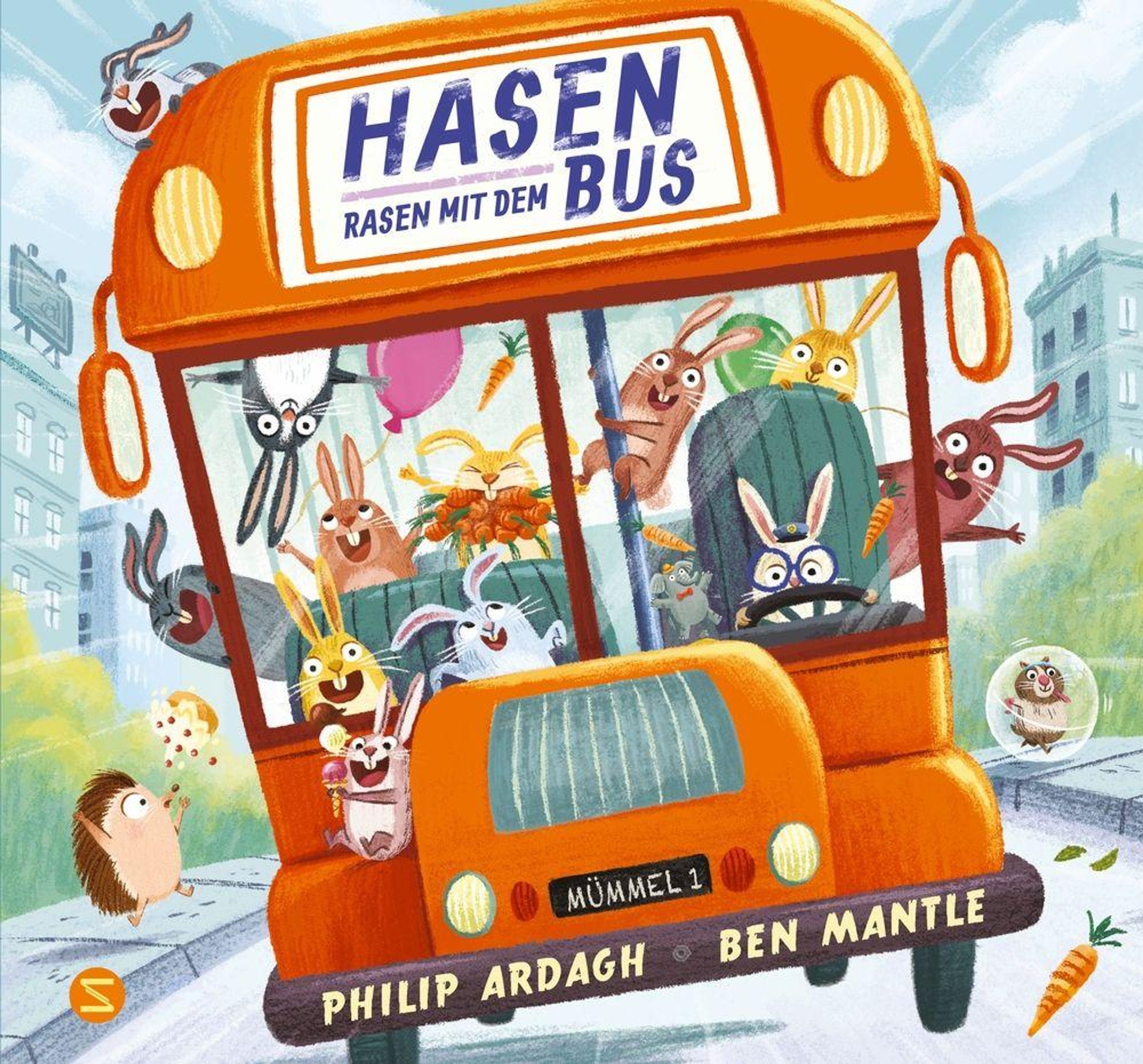 Aufgepasst! Die Hasen haben sich den Bus geschnappt und rasen wie verrückt durch Mümmelburg. Keiner kann sie aufhalten. Sie rauschen an den Haltestellen vorbei und schliddern um die Kurven. Da sind Hasen auf dem Dach! Hasen im Gang! Hasen überall! Doch, puh, endlich kommt der Bus zum Halten! Am Bahnhof. Und was steht da? Ein Zug! O nein! Diese Hasen werden doch wohl nicht ....?