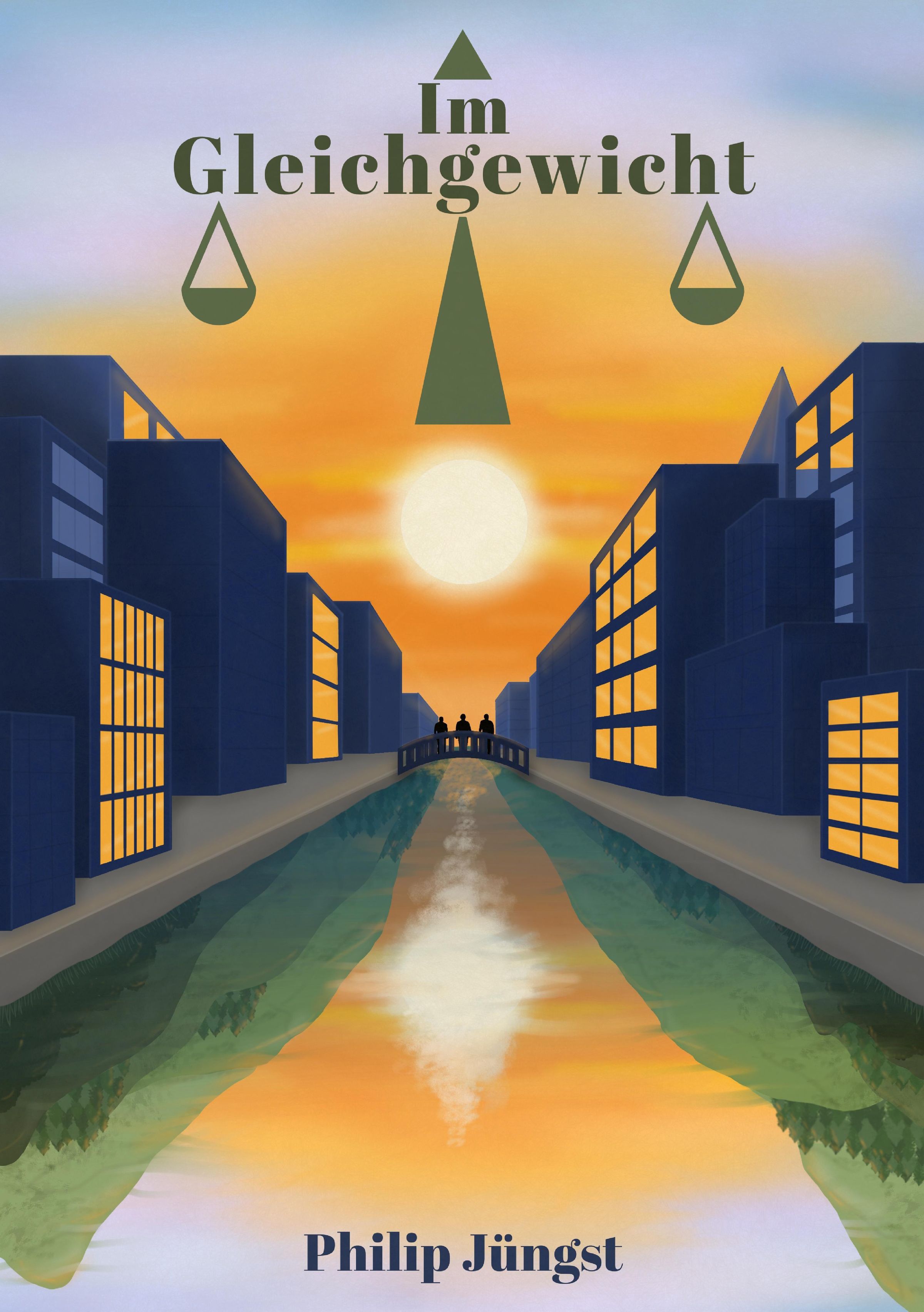 „Im Gleichgewicht“ und „Philip Jüngst“ vor einer Skyline bei Sonnenuntergang, mit einer Brücke über einem Fluss., Buch
