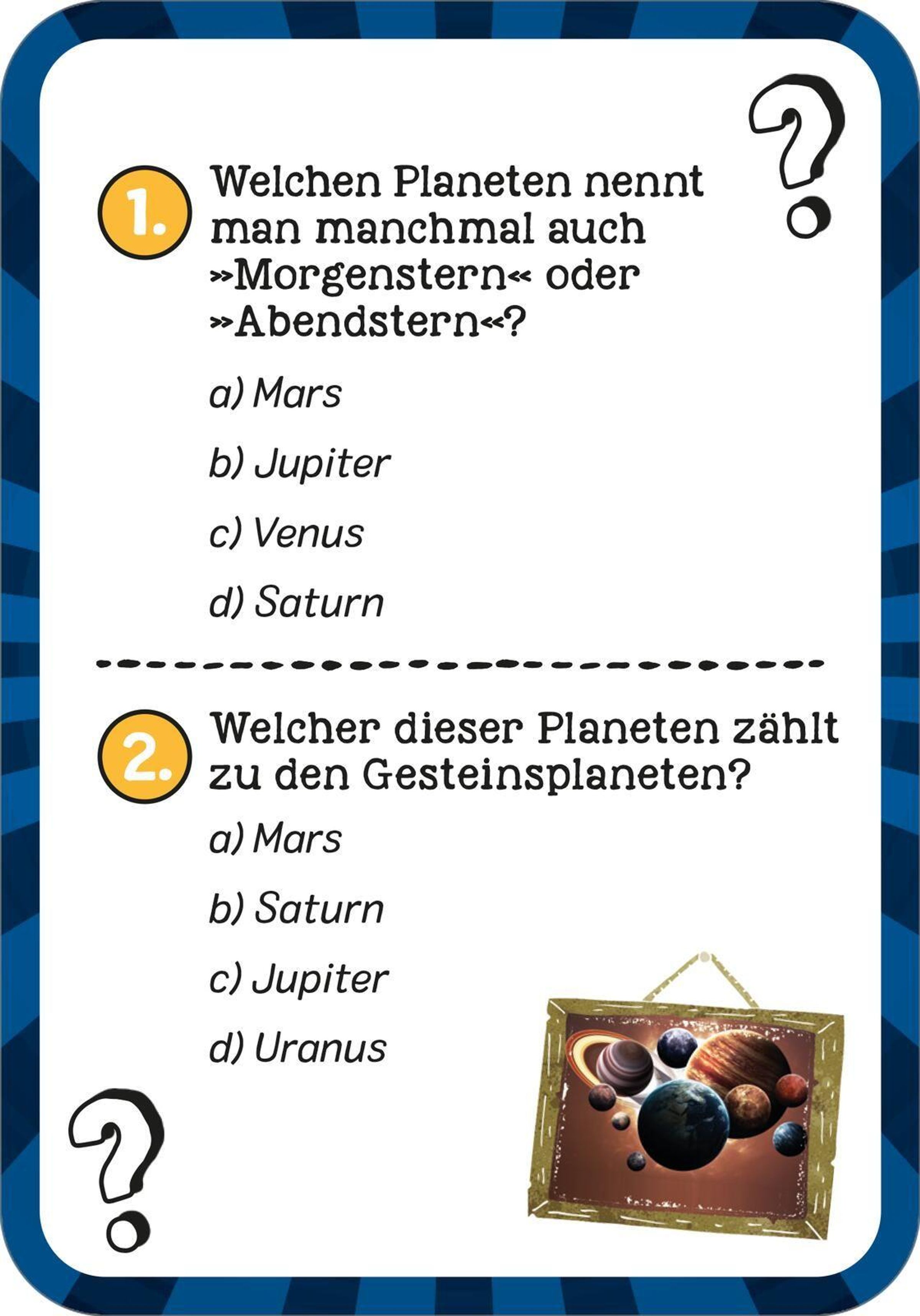Mit vielen informativen Rätseln zum Weltraum auf 50 bunt illustrierten Quizkarten: Wie viele Planeten kreisen um die Sonne? Was sieht man am Nachthimmel, wenn "Neumond" ist? Wann wurde das erste Foto aus dem Weltall aufgenommen? Was müssen Astronauten im Weltall tragen? Dieses Wissens-Quiz bietet über 100 abwechslungsreiche Fragen und Antworten.