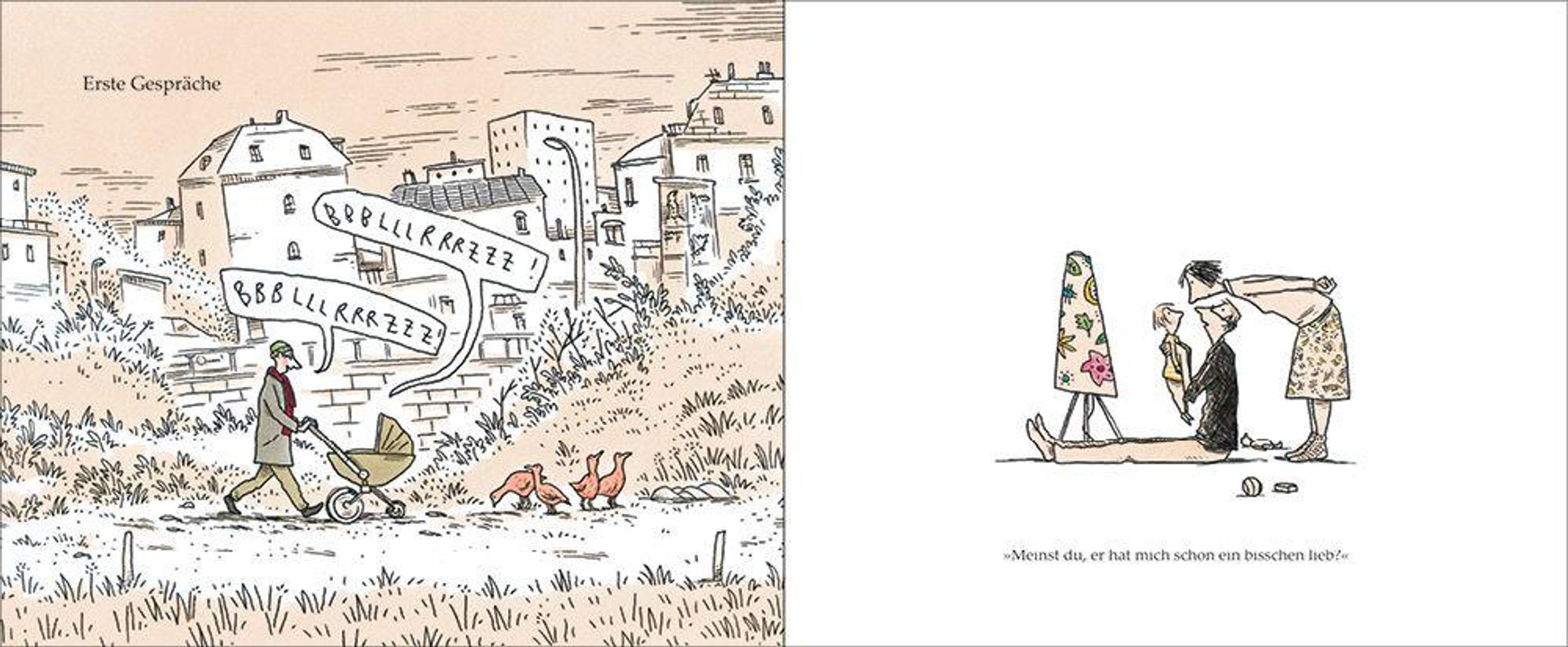 Philip Waechter erzählt in vielen pointierten Bildern vom beinahe unglaublichen Glück, Vater zu werden. Von einem Vater, der selbst von so profanen Dingen wie dem ersten Wickeln oder der Rote-Bete-Schlacht völlig ergriffen ist, und den unausweichlichen Babyschwimmkursen und Sandkastengesprächen. Und davon, wie Väter auch nach schlaflosen Nächten der Champions-League treu bleiben können.