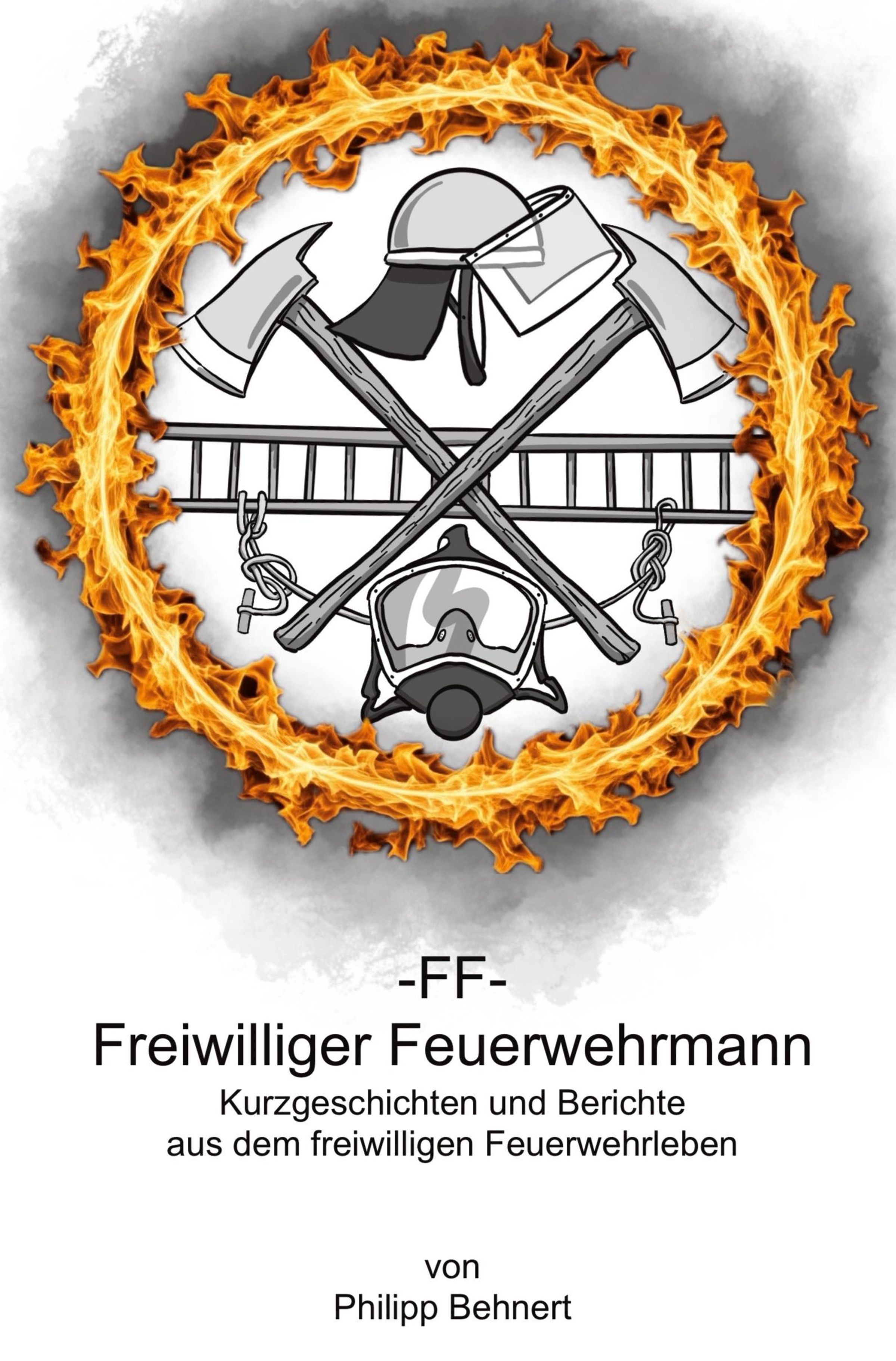 Logo mit Feuerhelm, Äxten, Leiter, Atemmaske in Flammenring. Text: "Freiwilliger Feuerwehrmann" von Philipp Behnert., Buch