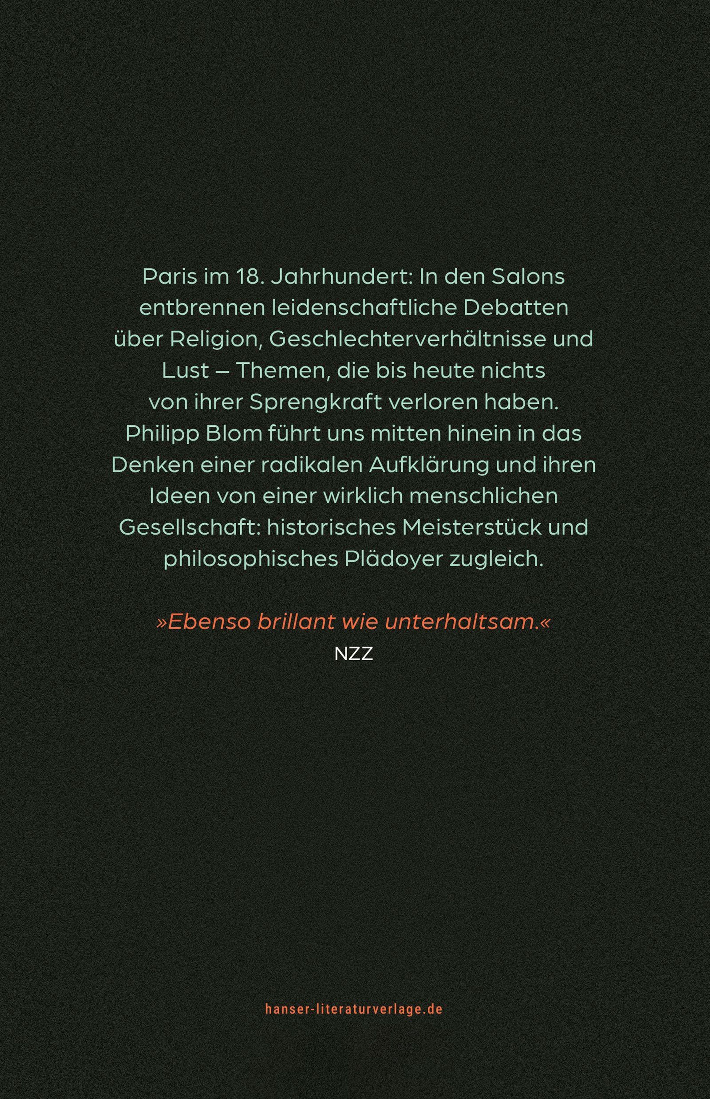 Paris, wenige Jahre vor Ausbruch der Revolution: Im Salon des Barons d'Holbach treffen sich regelmäßig die besten Köpfe Europas. Denis Diderot, David Hume, Laurence Sterne, Jean-Jacques Rousseau und viele andere Denker des 18. Jahrhunderts streiten um eine zeitgemäße Philosophie, die die Religion hinter sich lässt und allein auf die Kraft des Verstandes setzt, aber auch den Leidenschaften angemessenen Platz einräumt. Philipp Blom erzählt ein Kapitel europäischer Geschichte und bringt die radikale Variante der Aufklärung wieder in Erinnerung, die eine Idee von einer wirklich menschlichen Gesellschaft hatte. Ein historisches Meisterstück und philosophisches Plädoyer zugleich.