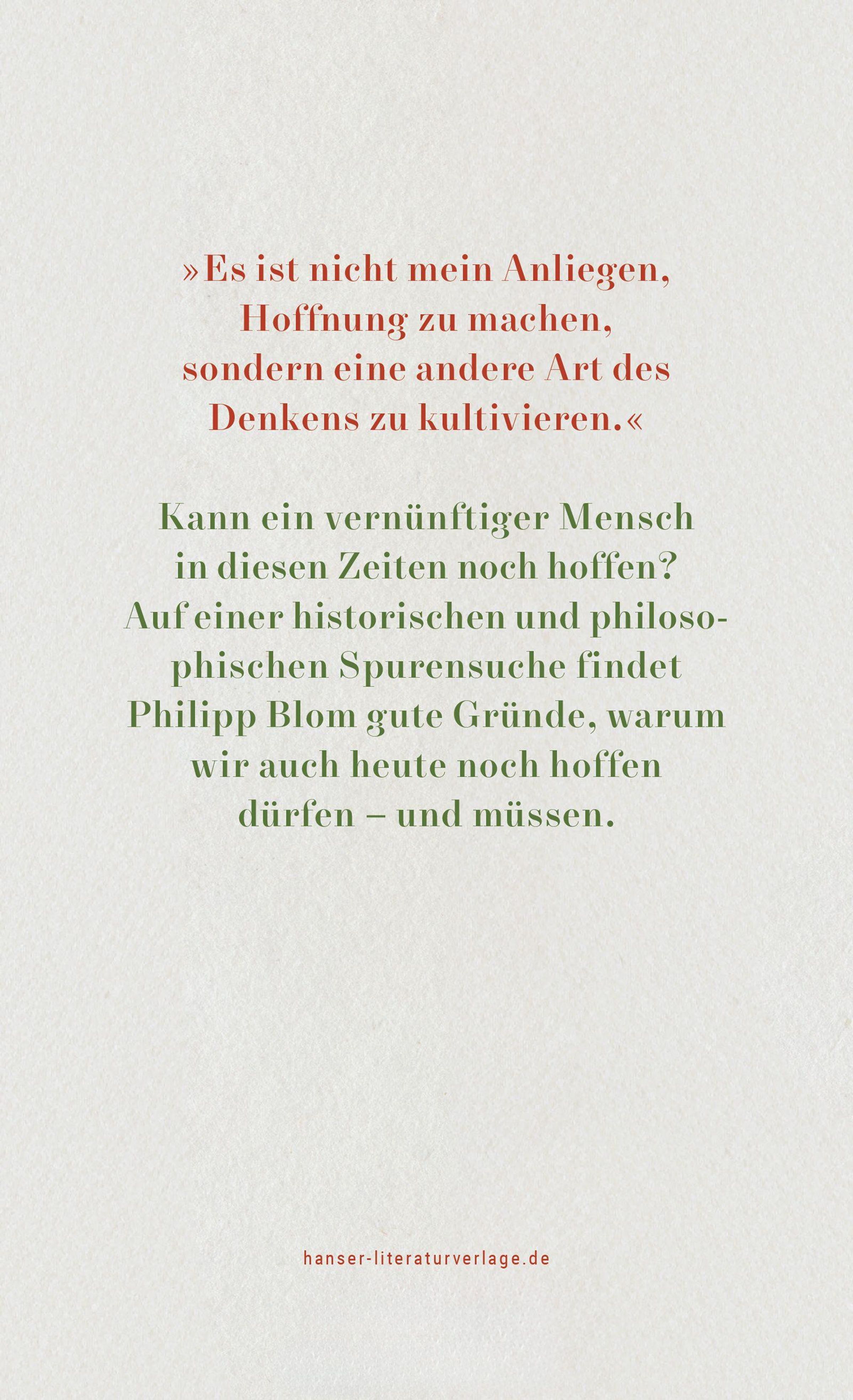 Es ist noch nicht lange her, da stand die Zukunft für eine bessere Welt. Inzwischen haben wir uns angewöhnt, mit dem Schlimmsten zu rechnen, und mussten oft genug erleben, dass es noch schlimmer kam. Gibt es wirklich keinen vernünftigen Grund mehr, zu hoffen? Philipp Blom findet die Ursprünge der Hoffnung in einem religiösen Weltverständnis, mit dem die Gegenwart nicht mehr viel anfangen kann: Das Dasein war sinnvoll, weil es in ein ewiges Leben münden würde. Heute könnte uns das Bedürfnis nach Hoffnung dazu treiben, ein sinnvolles Leben zu führen, indem wir Ziele für eine bessere Welt verfolgen: Gerechtigkeit etwa oder Nachhaltigkeit. Das wäre das Gegenteil von naivem Optimismus, das wäre eine vernünftige Haltung zur Welt. Sie ist nötiger denn je.