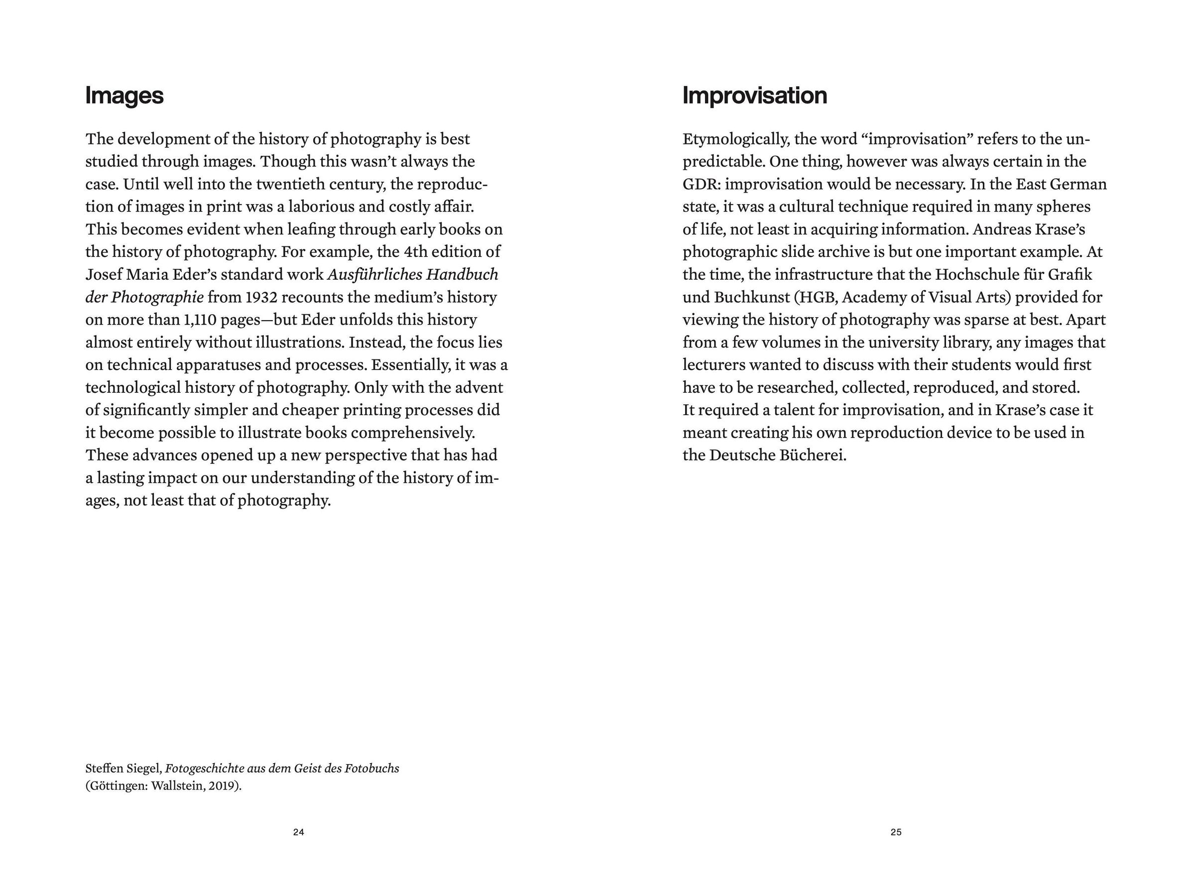 In Improvised Projections , the artist Philipp Goldbach and the photography historian Steffen Siegel turn the spotlight on how the history of photography was presented in the late GDR. Andreas Krase taught at the Hochschule für Grafik und Buchkunst in Leipzig (Academy of Fine Arts) from 1985 until 1990. Undisturbed by government oversight, he built a collection of slides over the years that reflects the media history of its time. In their project, Goldbach and Siegel transpose this treasure into a creative arrangement in its own right-a new volume in the KONTEXT series that prompts reflections on the possibilities and limitations of the circulation of knowledge.