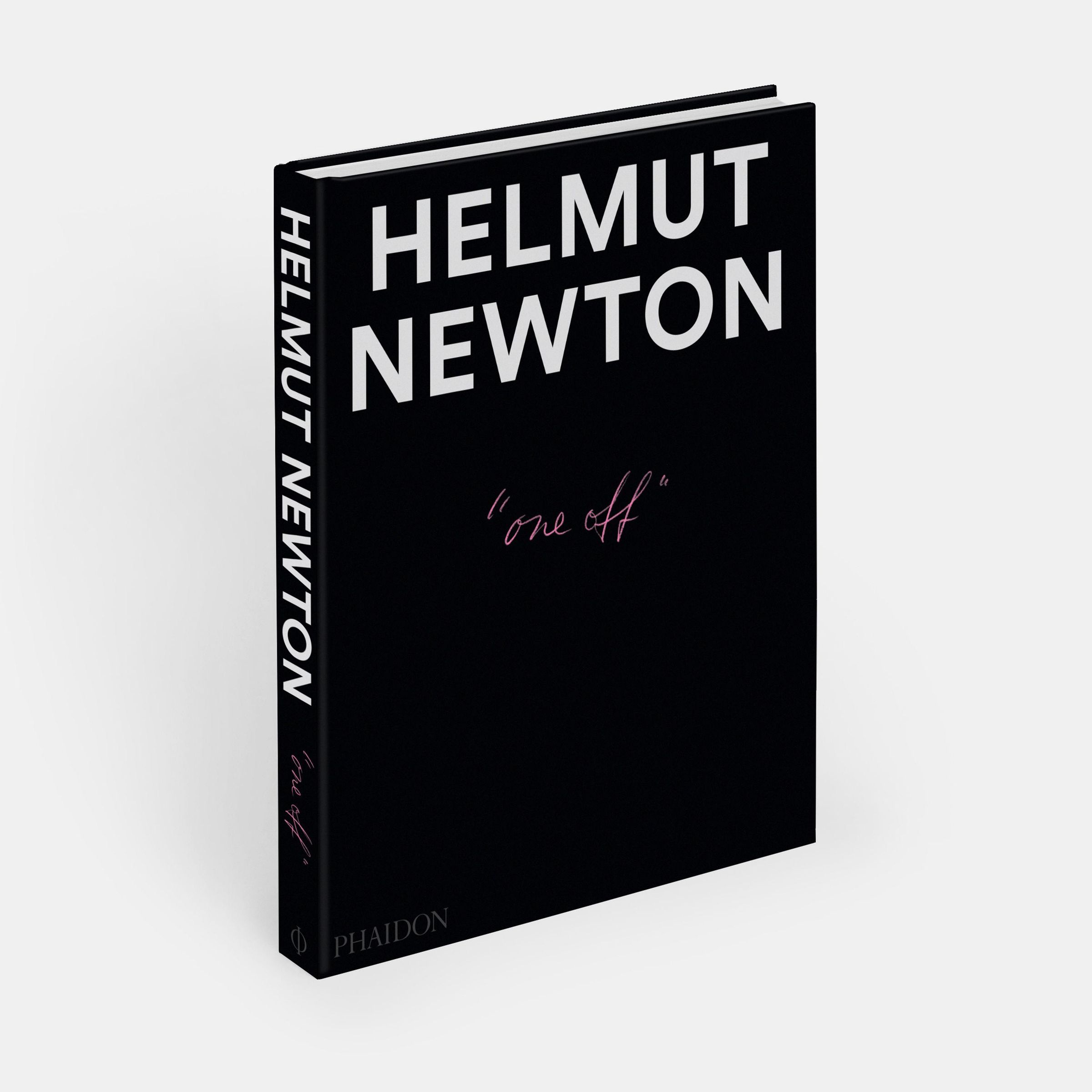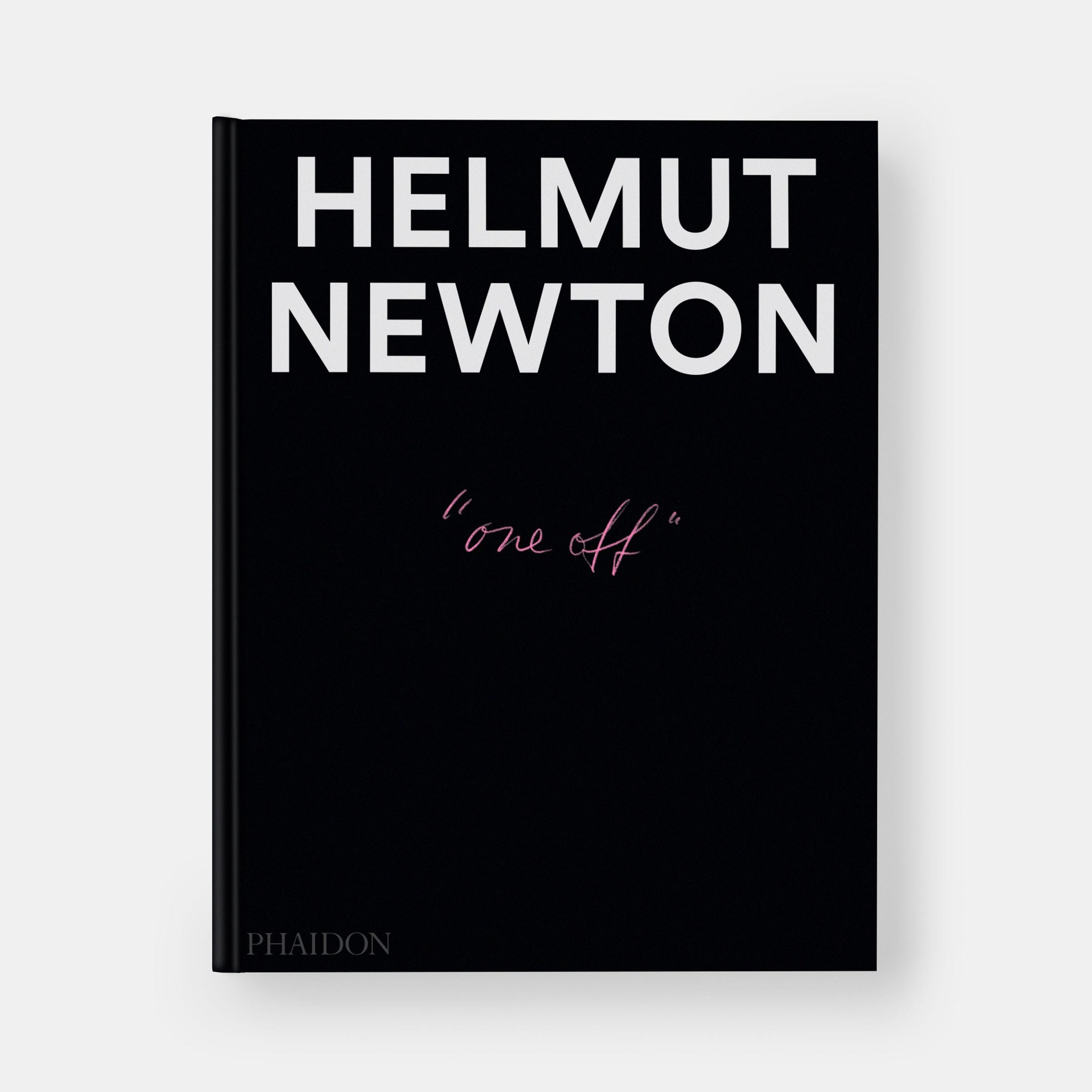 "HELMUT NEWTON" in großen weißen Buchstaben und "one off" in rosa Schreibschrift auf schwarzem Hintergrund., Buch