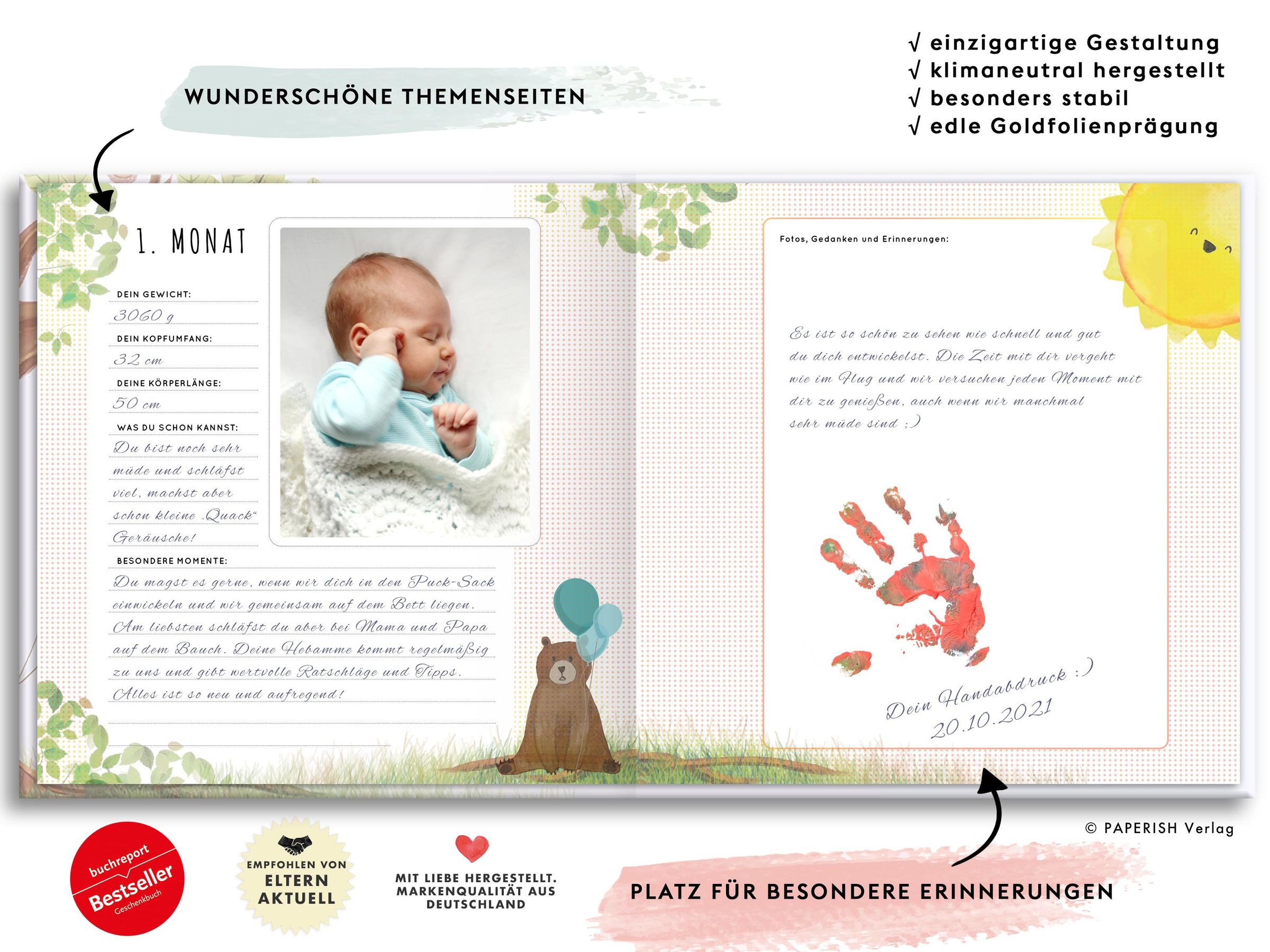 Der PAPERISH Verlag und Pia Loewe haben ein bezauberndes Babyalbum für die schönsten Erinnerungen und wichtigsten Momente der ersten Jahre gestaltet. Dieses besondere Babybuch erfüllt nicht nur höchste gestalterische Ansprüche, es bietet spannende kreative Eintragmöglichkeiten mit Platz für die schönsten Photos und Erinnerungen. Themen wie die eigene Familie, Geburt und die Zeit danach werden genauso behandelt wie das erste Lächeln, die ersten Schritte sowie die wichtigsten Meilensteine in der Entwicklung.