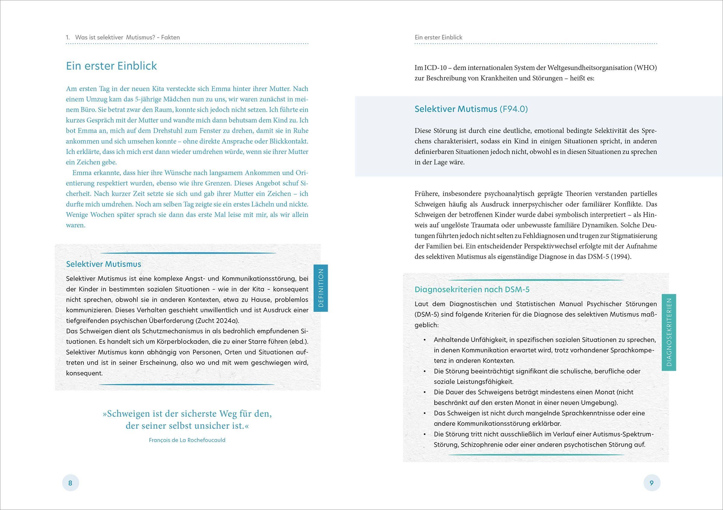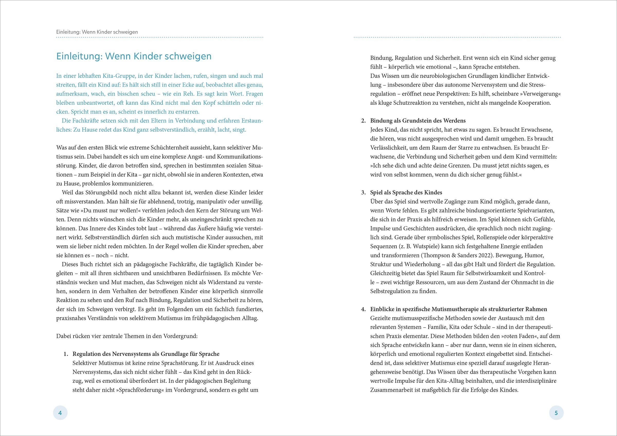 diesem Buch einen ganzheitlichen Blick auf selektiven Mutismus und verbindet Fachwissen für die Kita mit berührenden Einblicken in den Therapiealltag betroffener Kinder. Mit vielen praxisnahen Tipps sowie fundiertem Hintergrundwissen für pädagogische Fachkräfte gelingt ein Perspektivwechsel, der Sicherheit schafft - für die Kinder und für das pädagogische Handeln im Kita-Alltag.