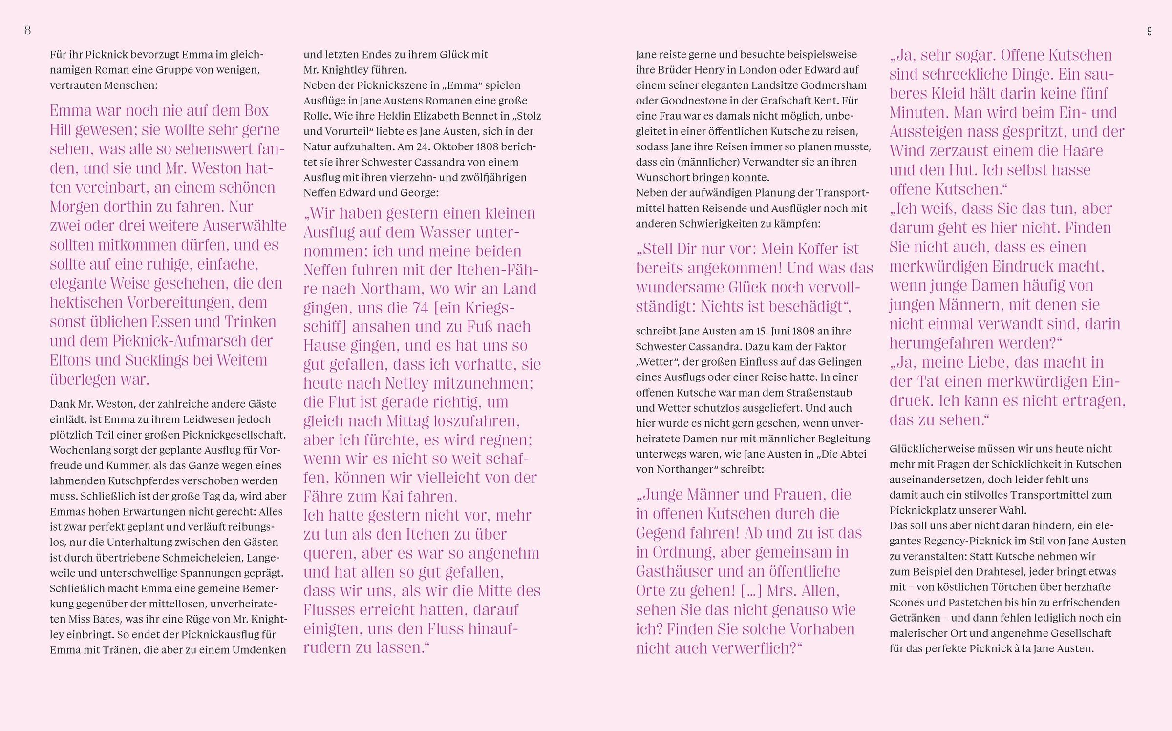 'Es war ein wunderschöner Tag für Box Hill, und auch alle anderen äußeren Umstände wie Reisevorbereitung, Bequemlichkeit und Pünktlichkeit sprachen für einen angenehmen Ausflug. ... Es fehlte nichts zum Glücklichsein, als sie dort ankamen. Sie legten sieben Meilen in Vorfreude auf das Vergnügen zurück, und alle waren voller Bewunderung, als sie ankamen ...'