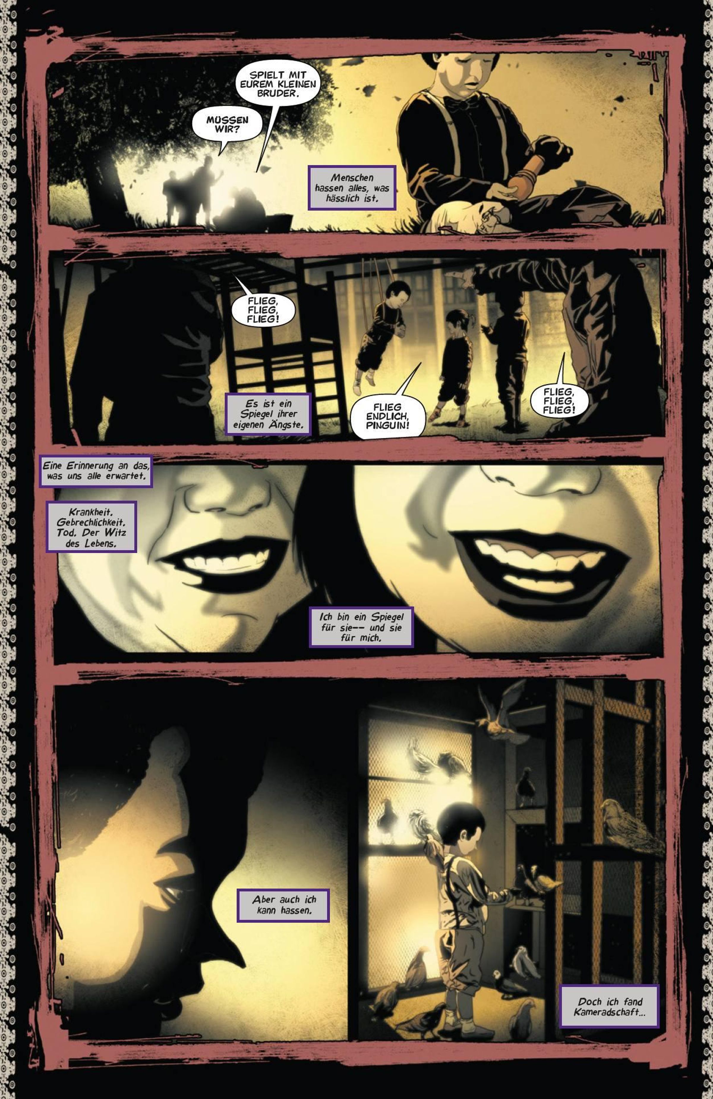 DIE HERKUNFT EINES SUPERSCHURKEN Oswald Cobblepot ist der Pinguin, einer der mächtigsten Gangsterbosse von Gotham City und zugleich einer der ältesten Widersacher von Batman. Doch er war nicht immer ein skrupelloser Superkrimineller! Diese Geschichte erzählt den Werdegang des gutmütigen jungen Oswald, der aufgrund seines missgestalteten Aussehens von seiner Umwelt mit Spott und Häme und sogar mit Gewalt gequält wird, bis er schließlich zu hassen lernt. Das Einzige, was er in seinem Leben liebt, sind seine Vögel und seine Mutter - doch auch die Beziehung zu ihr ist alles andere als gesund ...