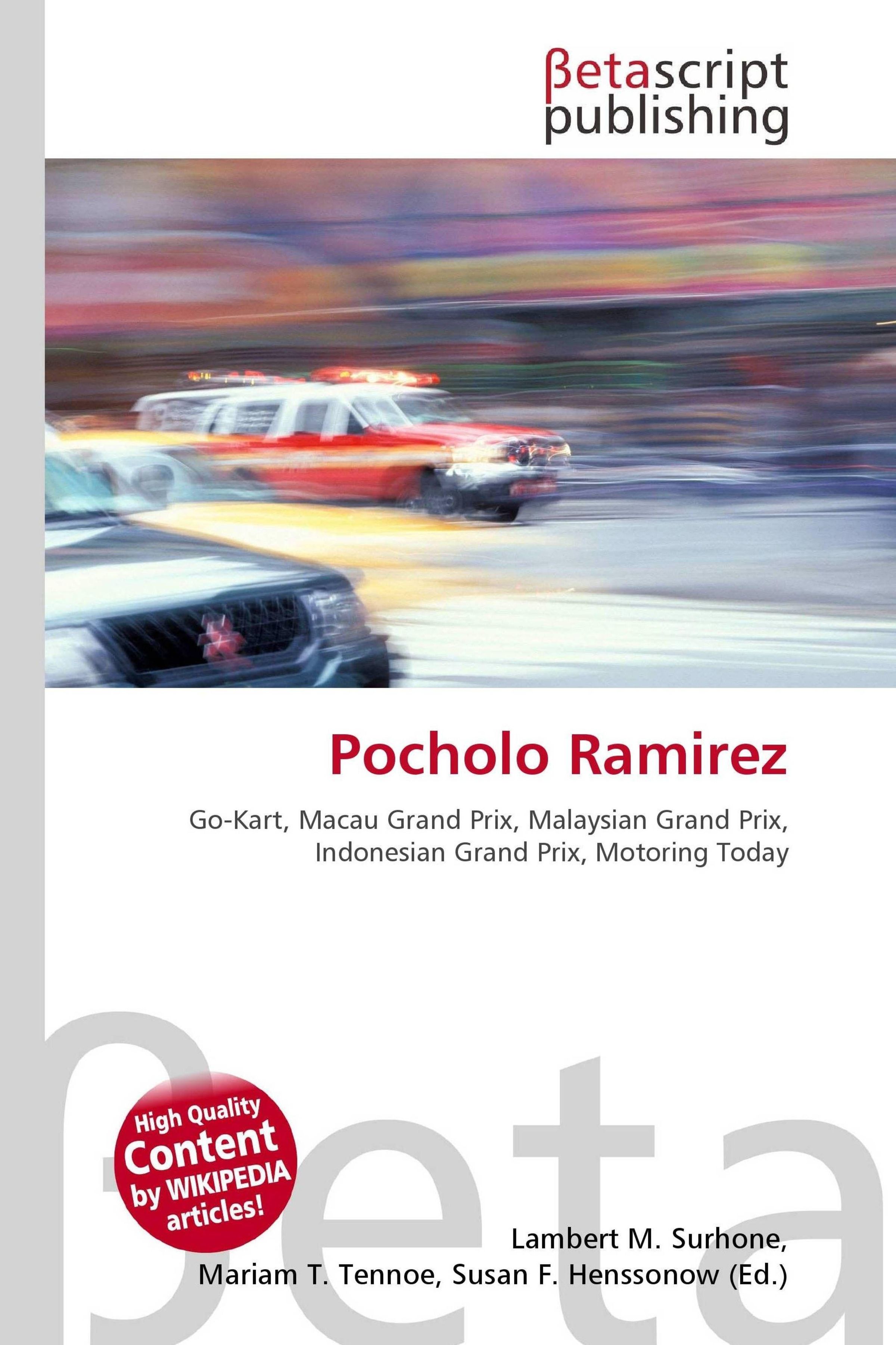 Text: "Pocholo Ramirez - Go-Kart, Macau Grand Prix..." und "High Quality Content by WIKIPEDIA articles!". Unscharfes Auto, Betascript-Logo., Buch