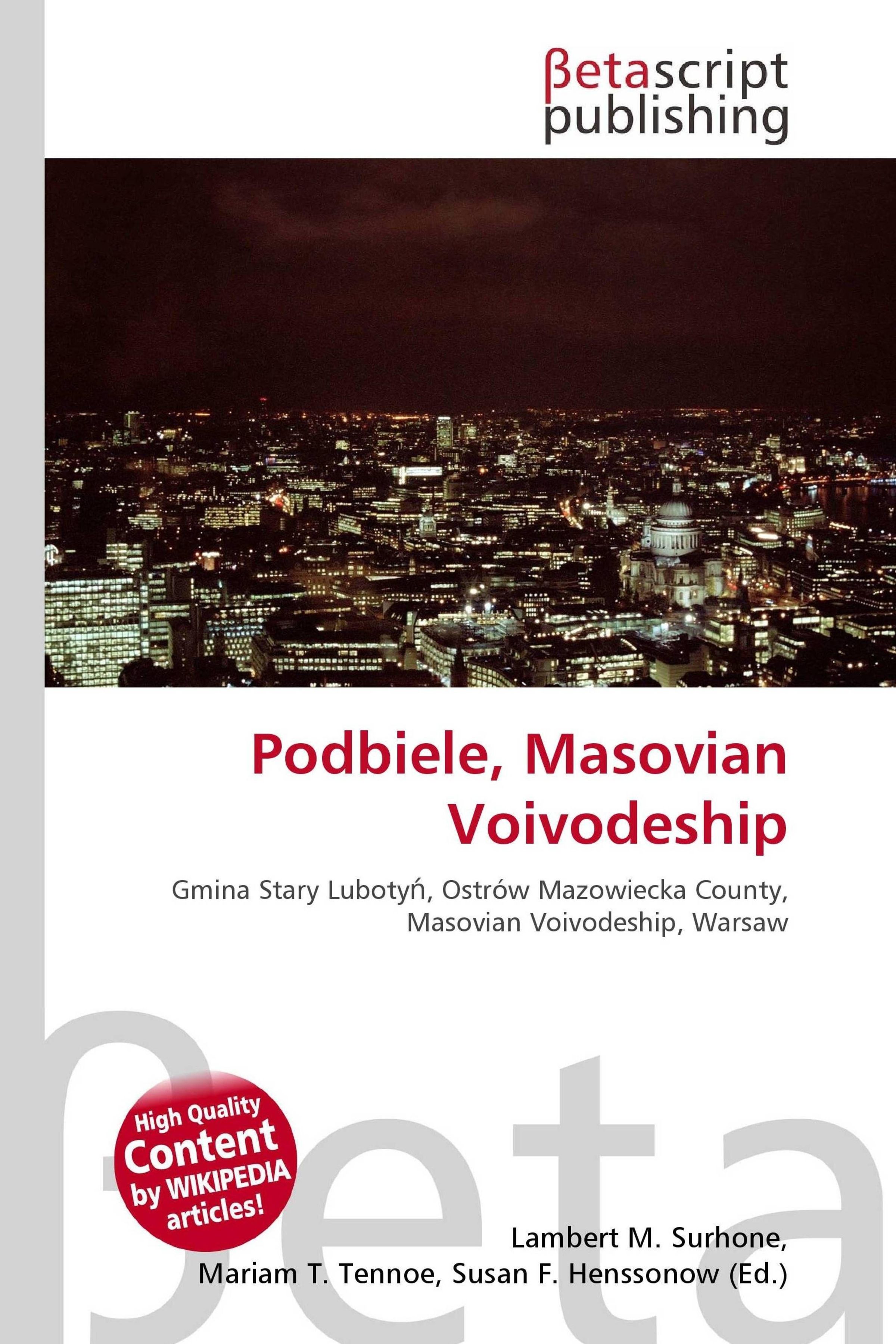 Please note that the content of this book primarily consists of articles available from Wikipedia or other free sources online. Podbiele [pdbjl] is a village in the administrative district of Gmina Stary Luboty, within Ostrów Mazowiecka County, Masovian Voivodeship, in east-central Poland. It lies approximately 12 kilometres (7 mi) north of Ostrów Mazowiecka and 101 km (63 mi) north-east of Warsaw. Gmina Stary Luboty is a rural gmina (administrative district) in Ostrów Mazowiecka County, Masovian Voivodeship, in east-central Poland. Its seat is the village of Stary Luboty, which lies approximately 15 kilometres (9 mi) north-east of Ostrów Mazowiecka and 100 km (62 mi) north-east of Warsaw. The gmina covers an area of 109.16 square kilometres (42.1 sq mi), and as of 2006 its total population is 3, 984. Ostrów Mazowiecka County (Polish: powiat ostrowski) is a unit of territorial administration and local government (powiat) in Masovian Voivodeship, east-central Poland. It came into being on January 1, 1999, as a result of the Polish local government reforms passed in 1998.