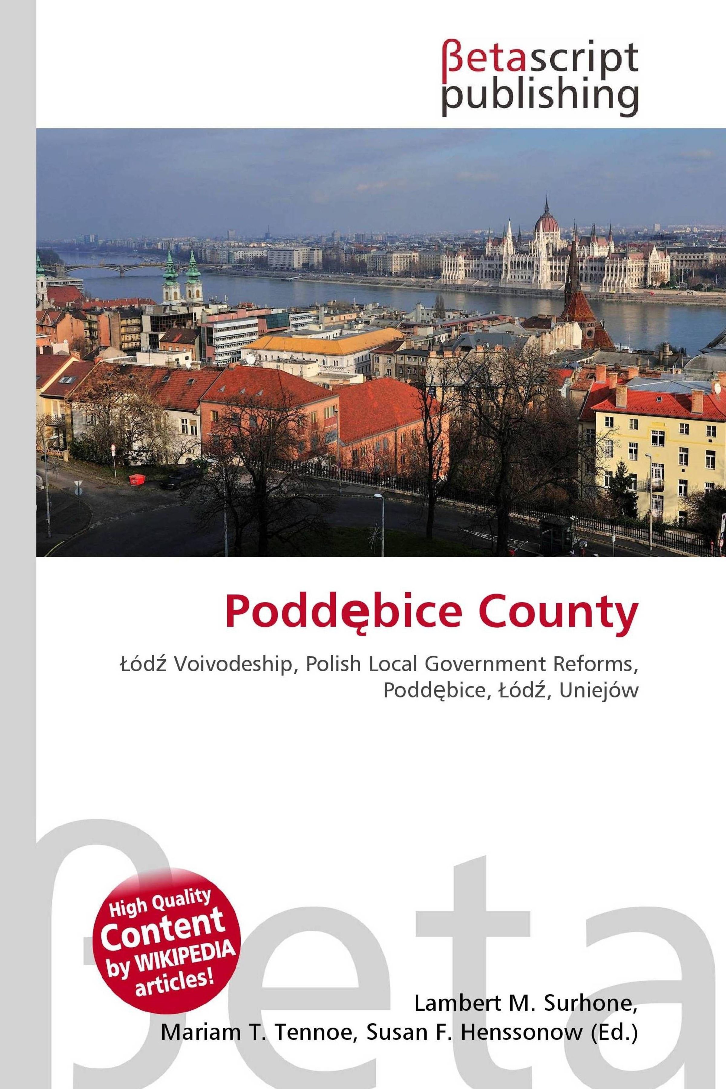 „Poddębice County“ und darunter „Łódź Voivodeship...“. Stadtansicht mit Fluss, roten Dächern und markanten Gebäuden., Buch