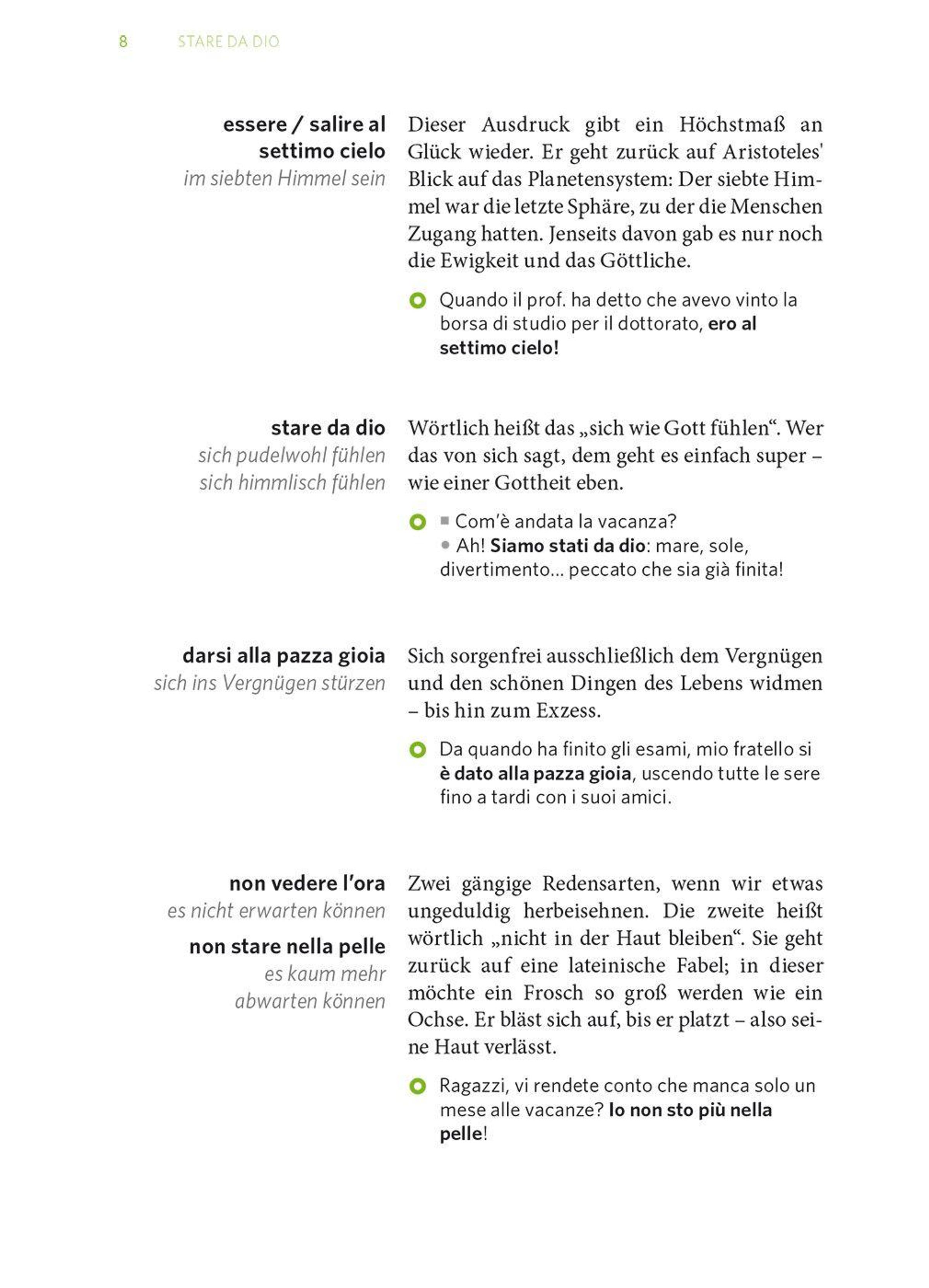 ACQUA IN BOCCA! gibt dir all die Redensarten an die Hand, mit denen du dich gewandter, treffender und natürlicher ausdrücken und dein Italienisch zum Glänzen bringen kannst. Im direkten Vergleich des Italienischen mit dem Deutschen kannst du interessante sprachliche Feinheiten entdecken, z. B. toccare ferro (auf Holz klopfen) oder una gatta da pelare (eine hart zu knackende Nuss).