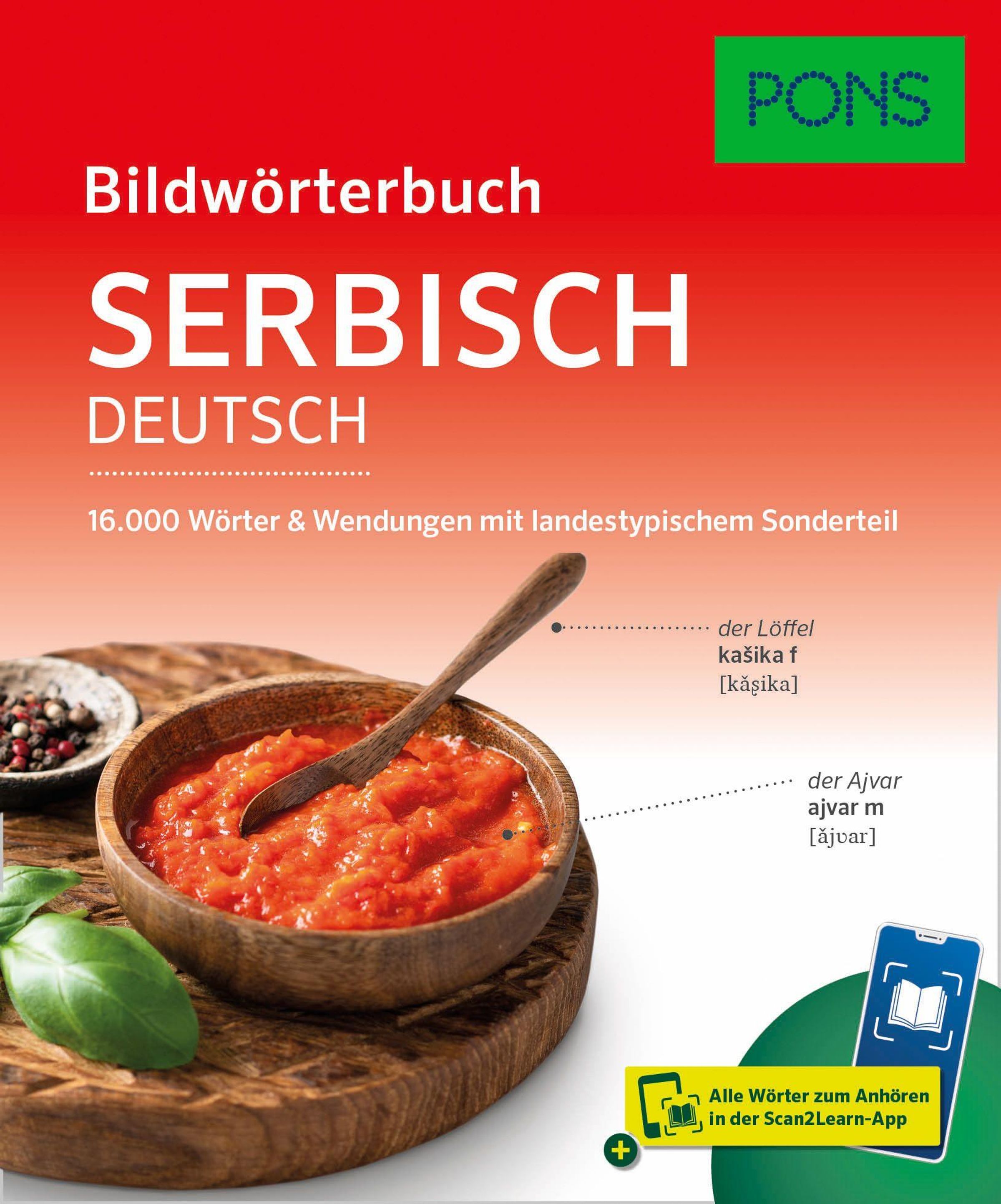 "Bildwörterbuch Serbisch-Deutsch, 16.000 Wörter & Wendungen." Holzschüssel mit Ajvar und Löffel, Basilikumblatt., Buch
