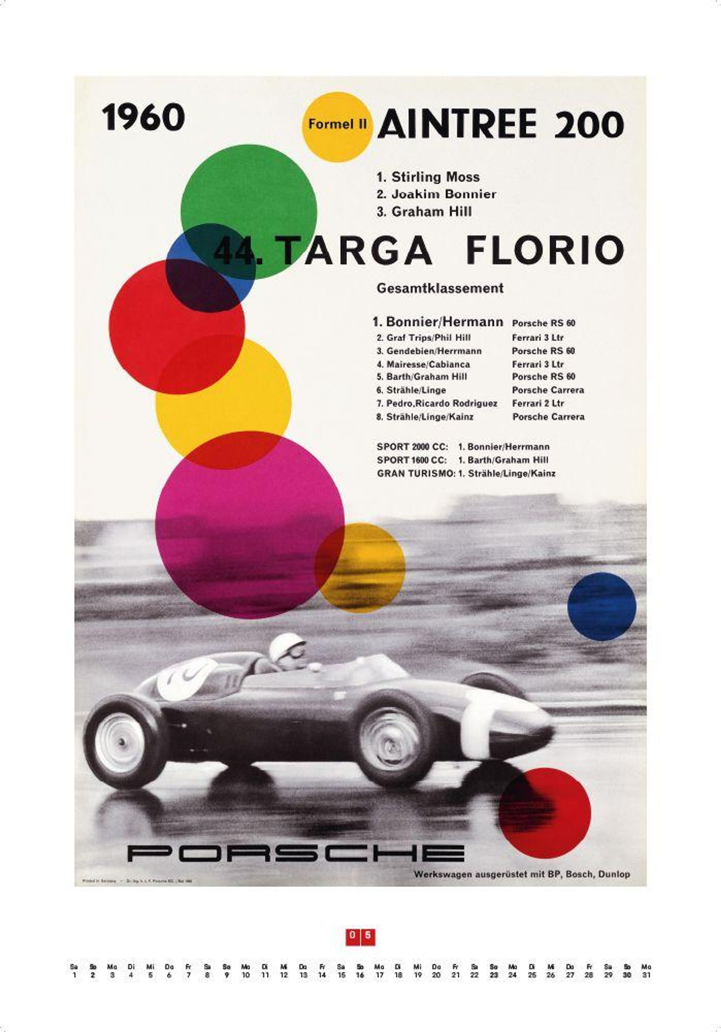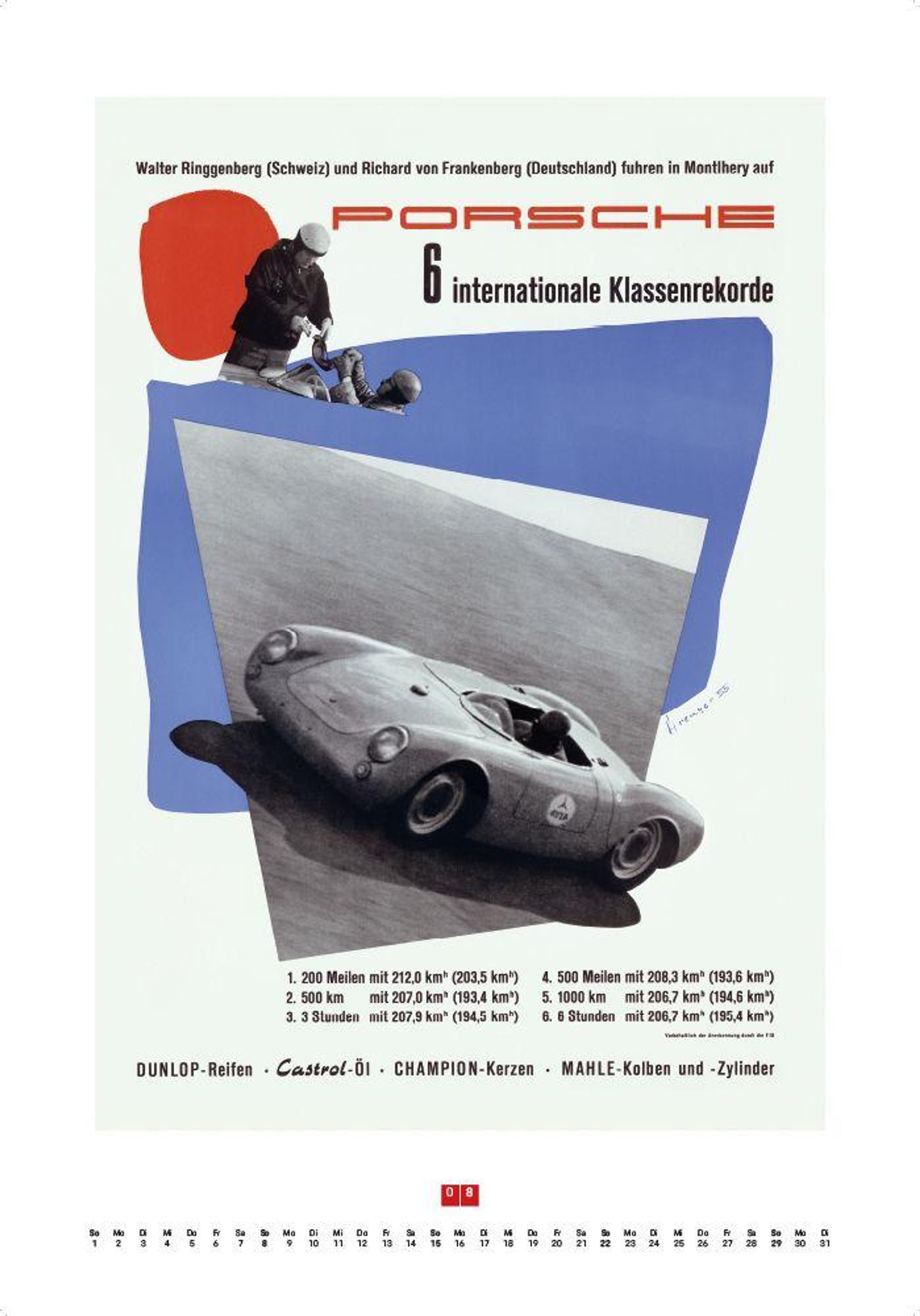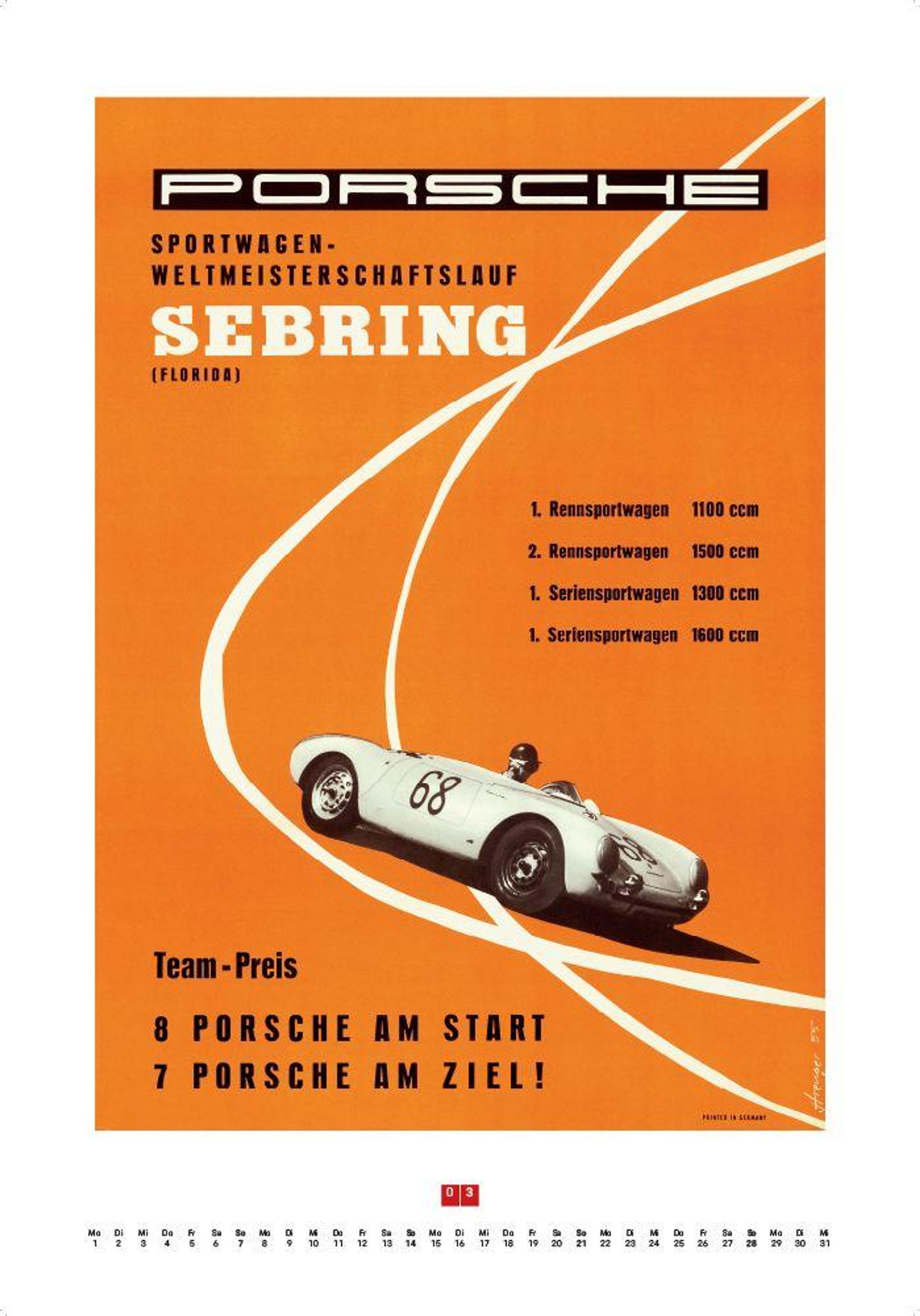 Porsche-Logo oben, Text: "1957, über 700 internationale Erfolge, Meisterschaften in vielen Ländern." Illustration eines Autos., Kalender