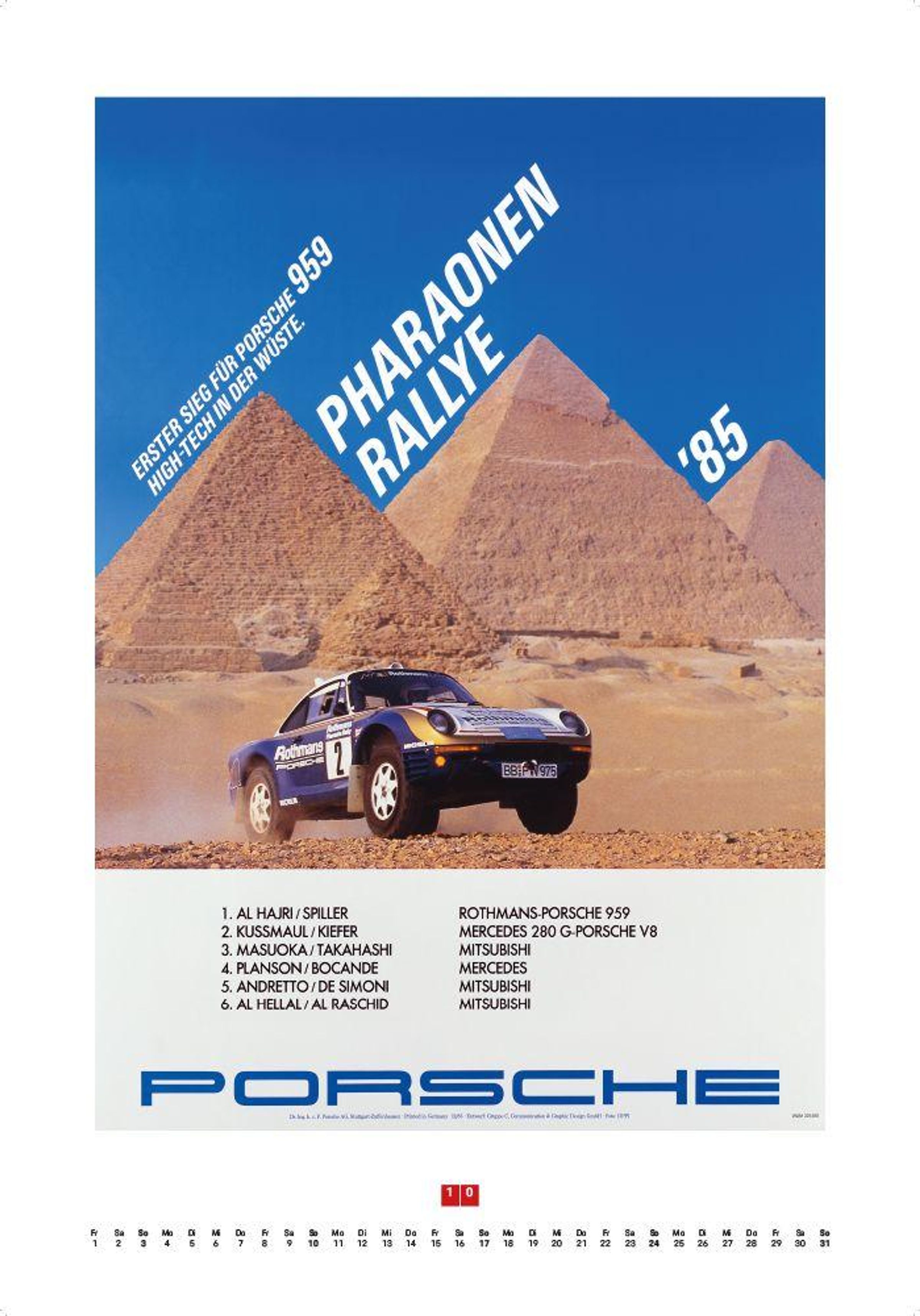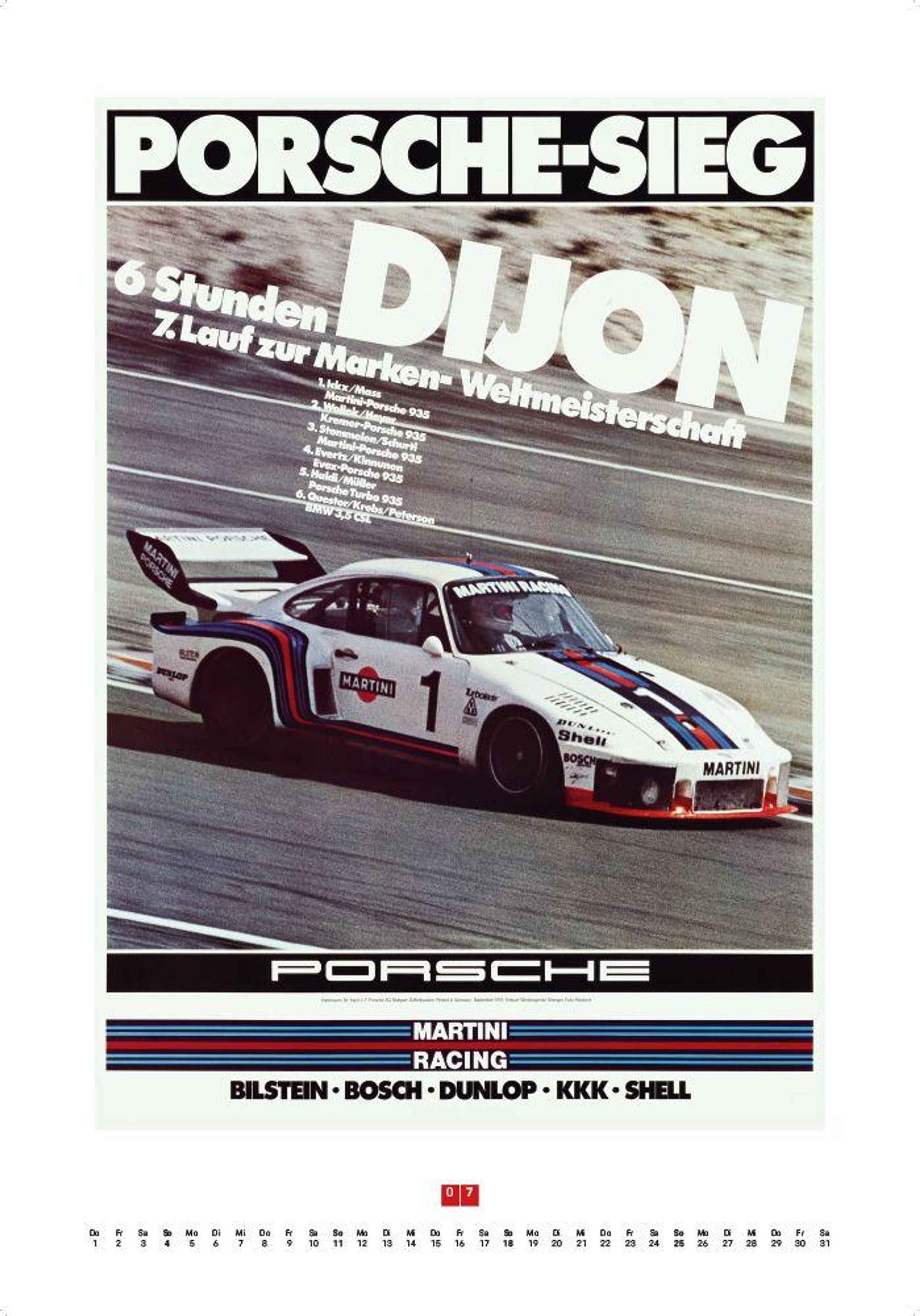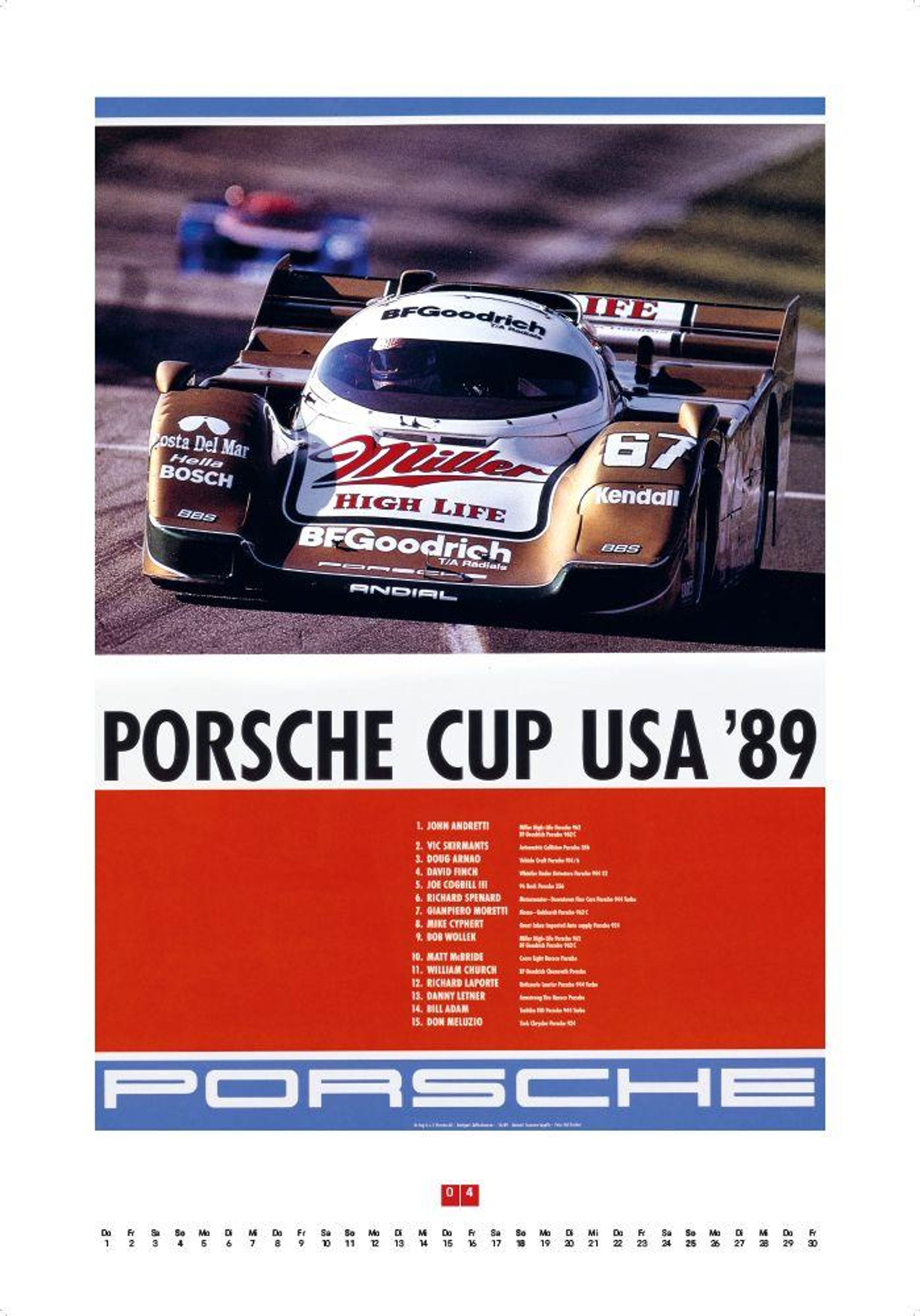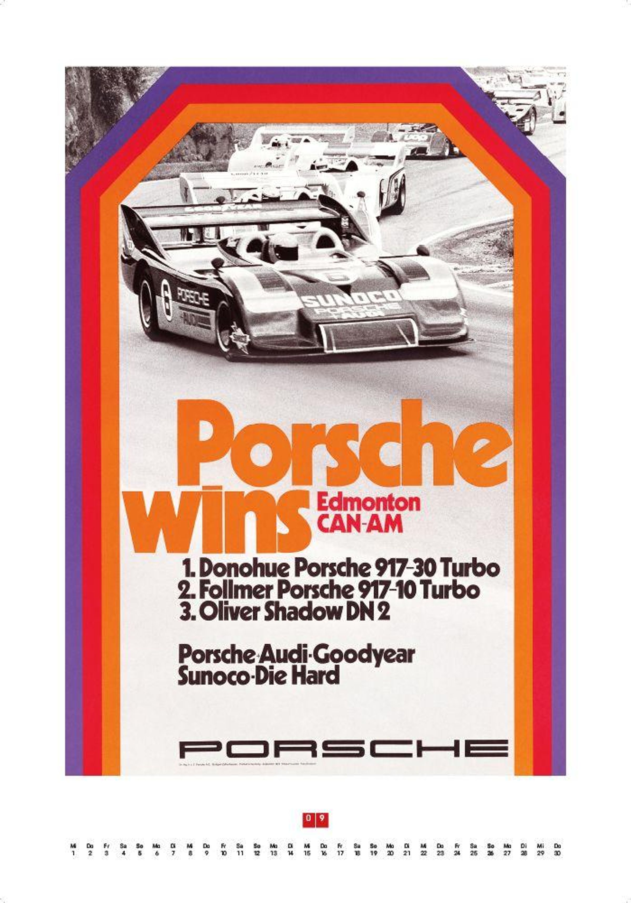 Porsche-Logo oben, Text: "1957, über 700 internationale Erfolge, Meisterschaften in vielen Ländern." Illustration eines Autos., Kalender