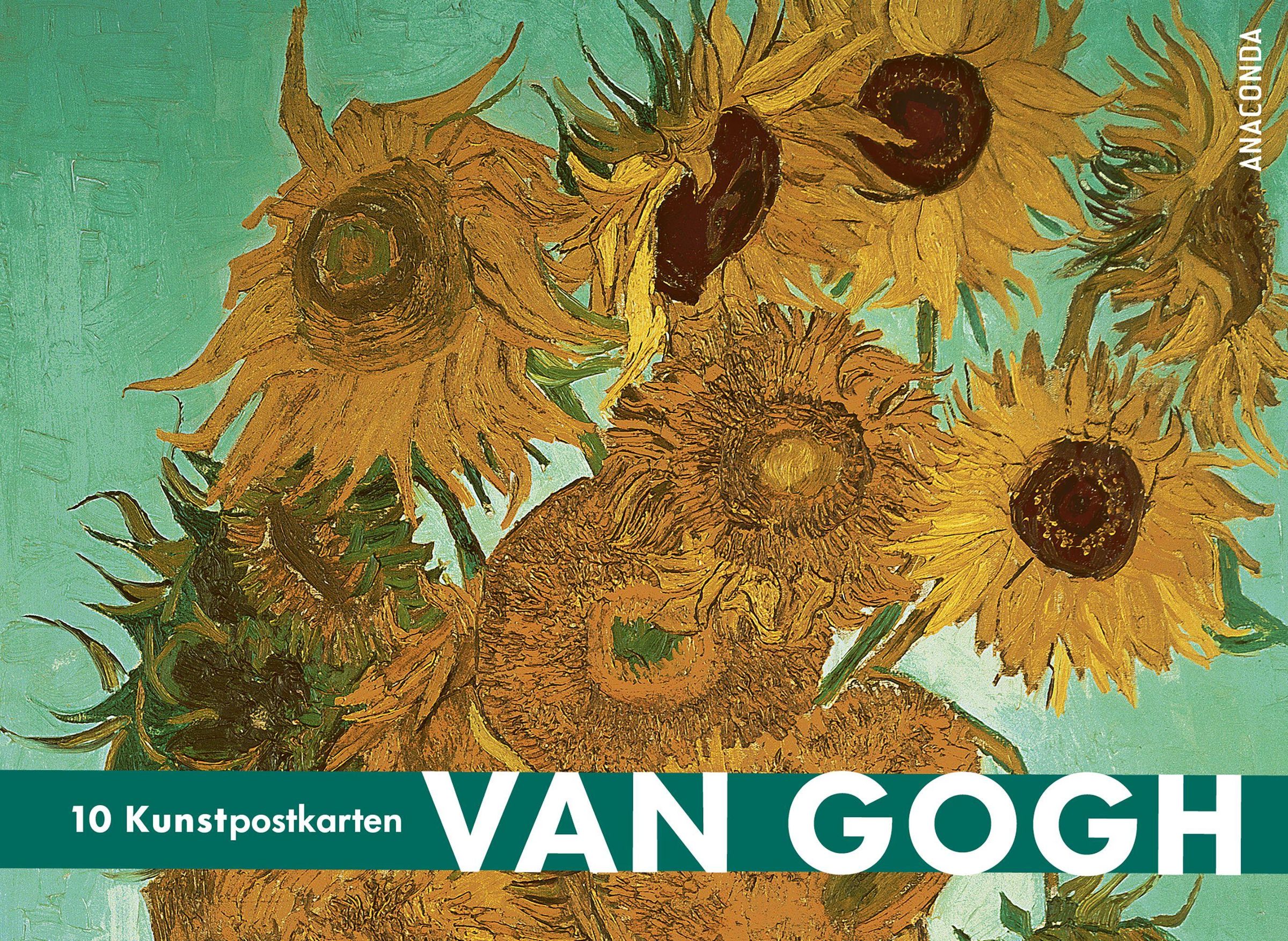 „10 Kunstpostkarten VAN GOGH“. Eine Illustration von Sonnenblumen mit grünem Hintergrund., Diverse