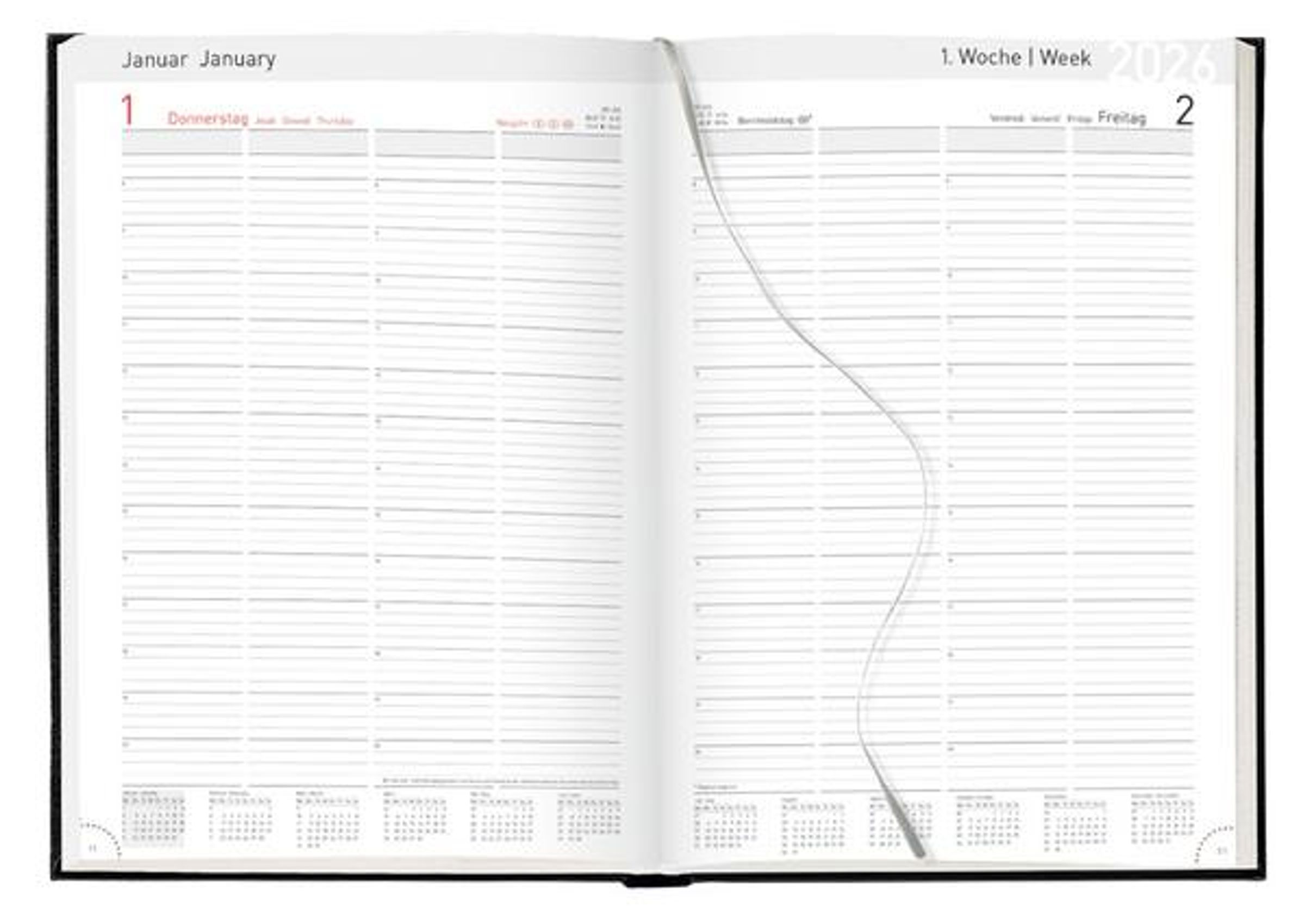 Hochwertiger Buchkalender. Hardcover schwarz. 400 Seiten. Pro Wochentag 1 Seite. Kalendarium d-e-f-i.