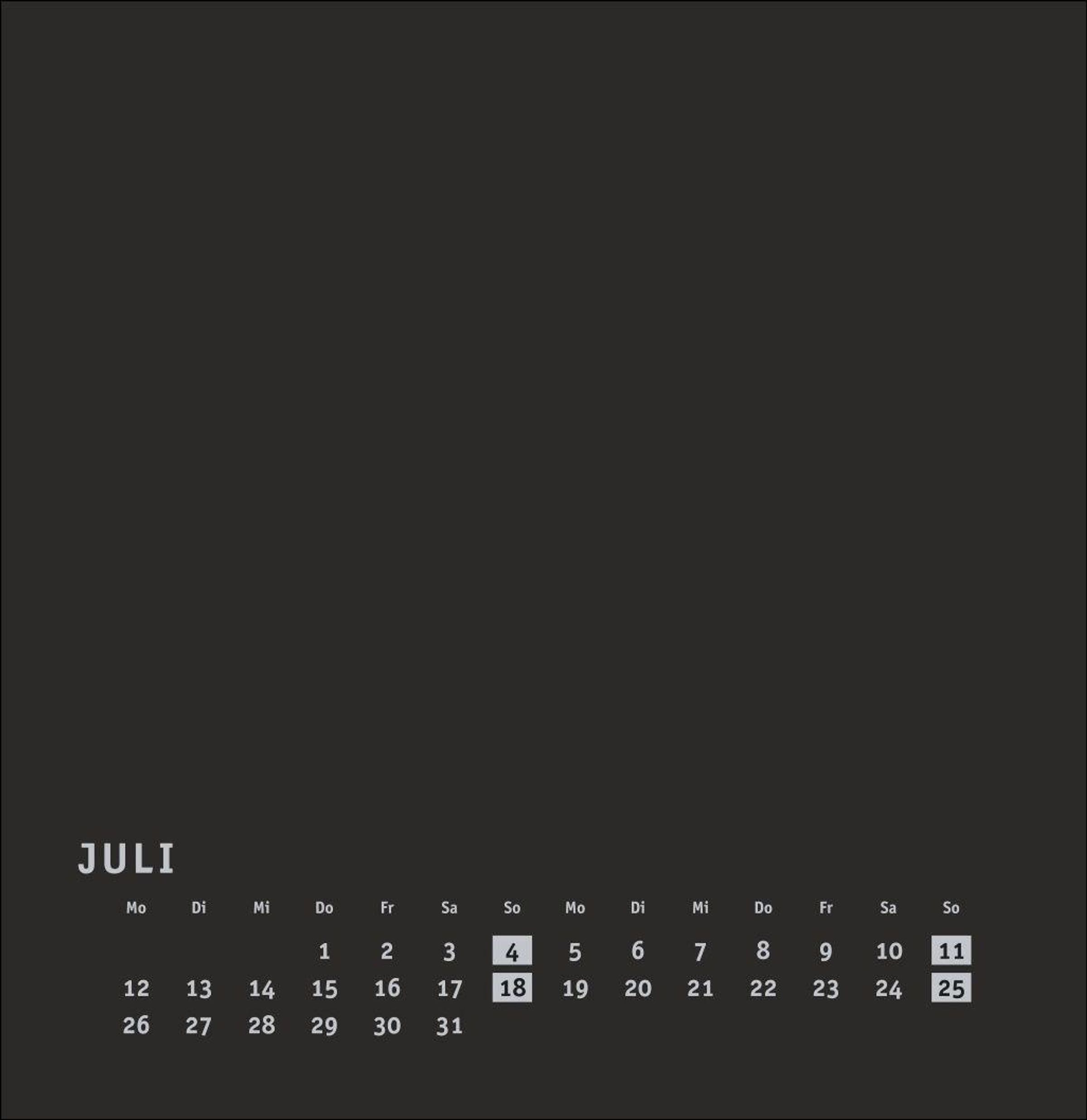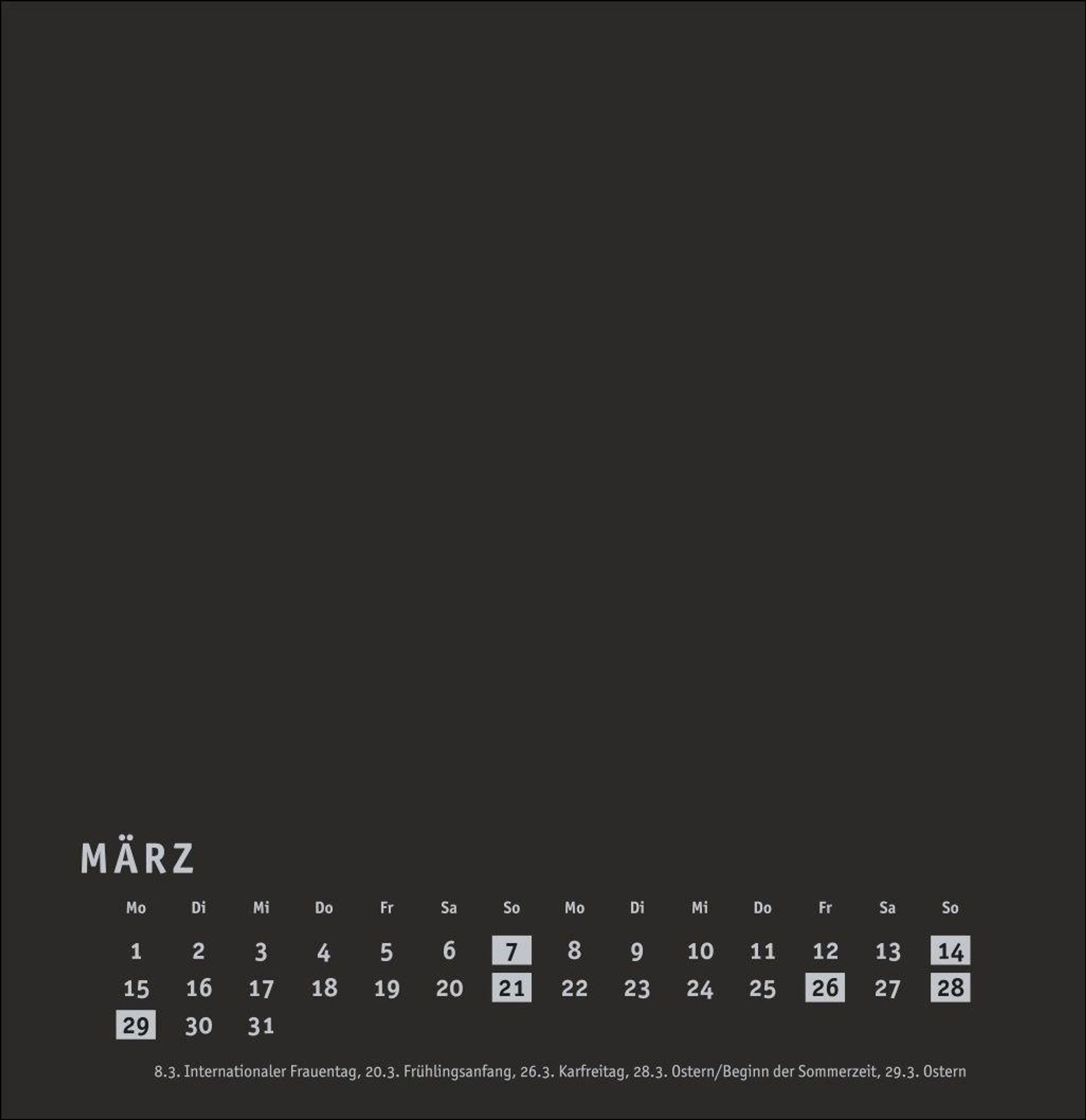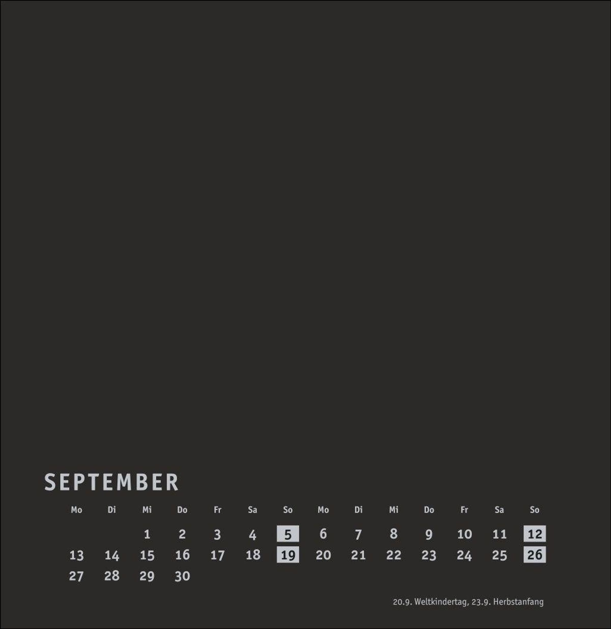 Kalender im quadratischen Format mit schwarzer Grundfarbe als neutralem Hintergrund