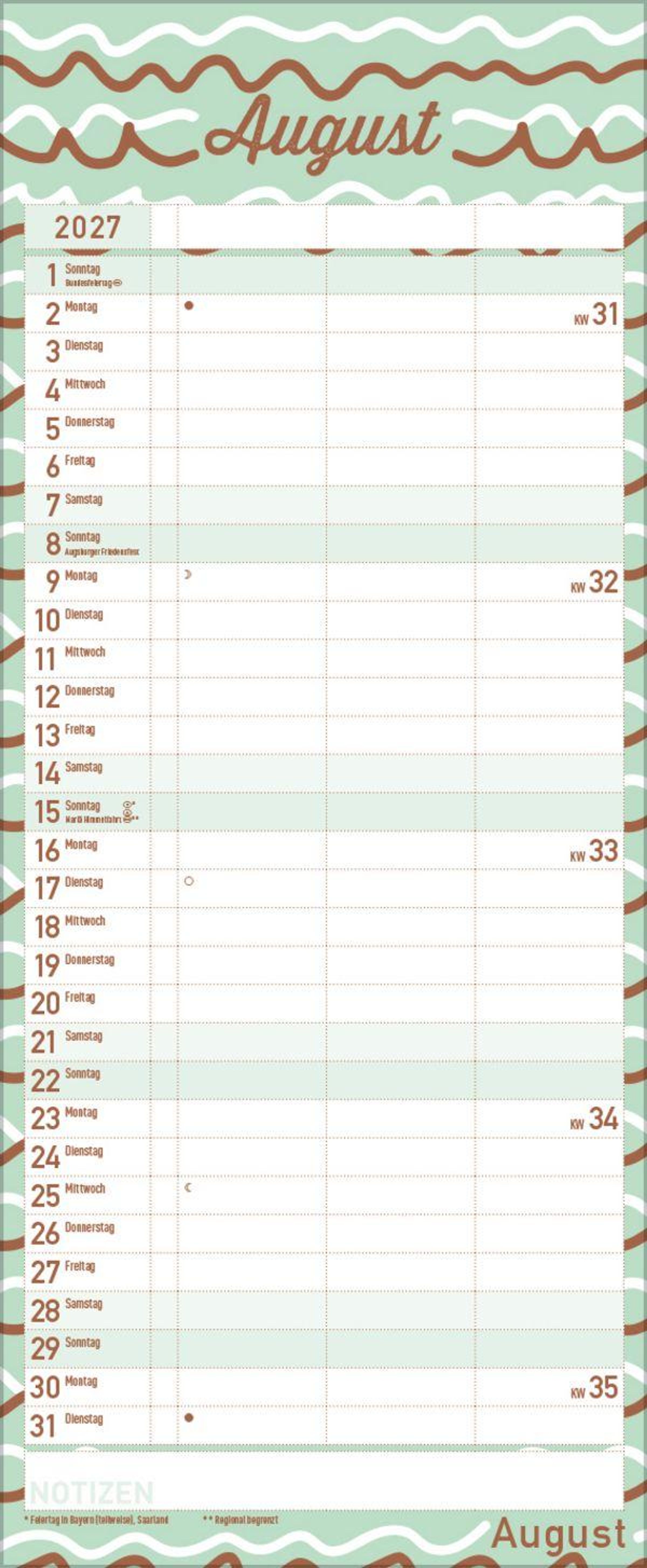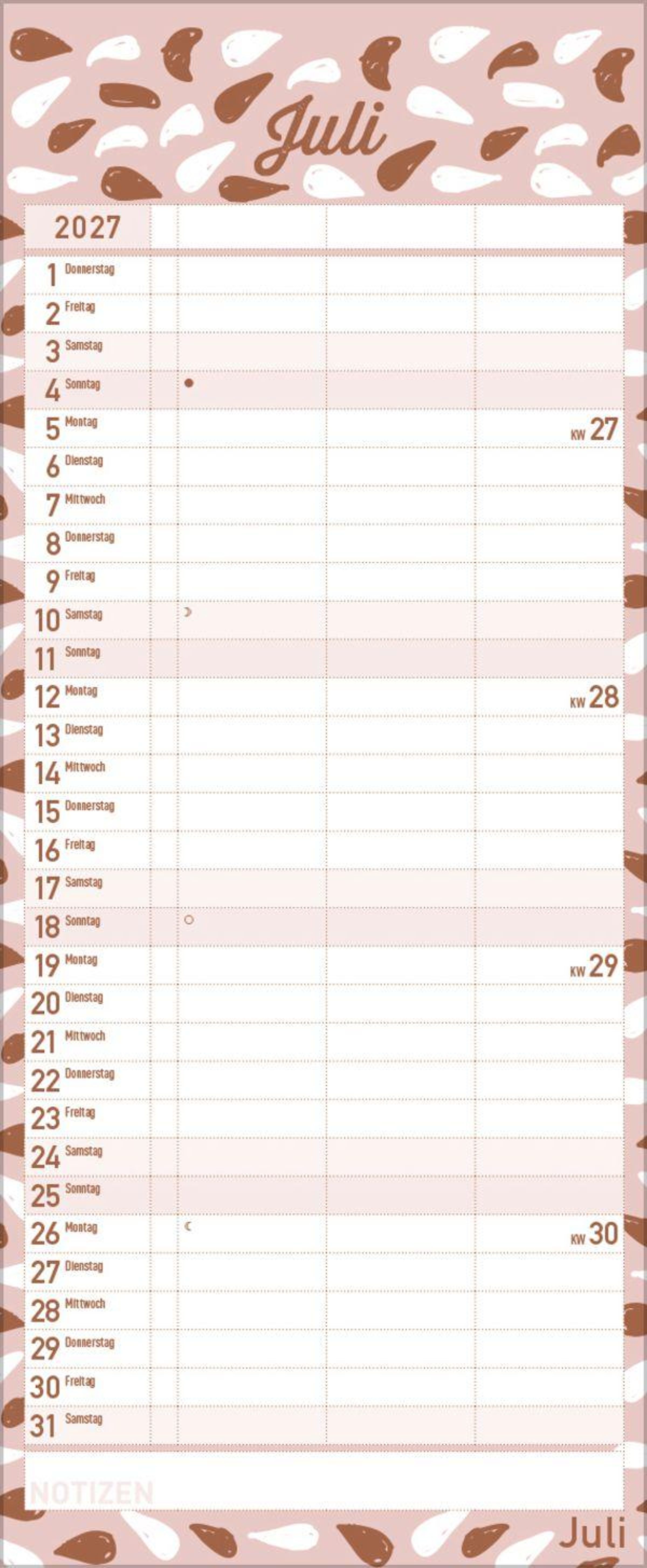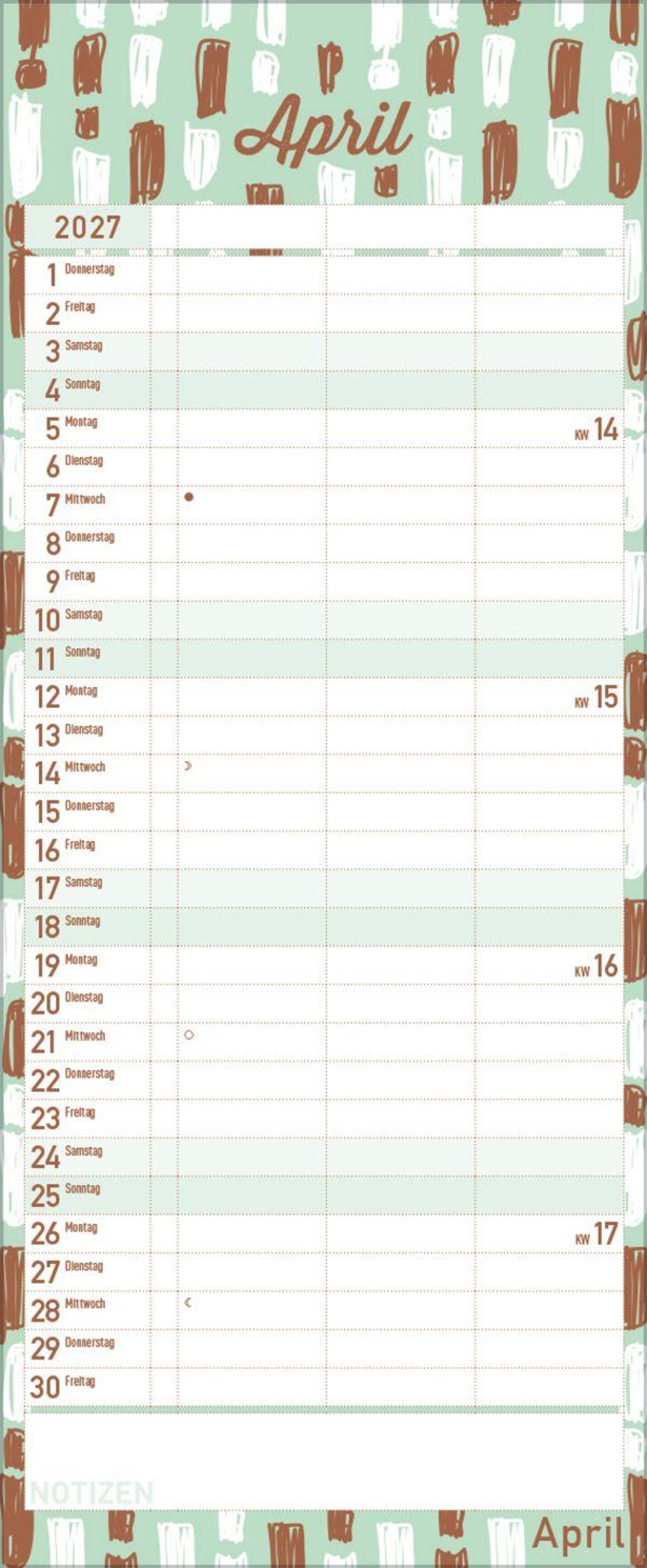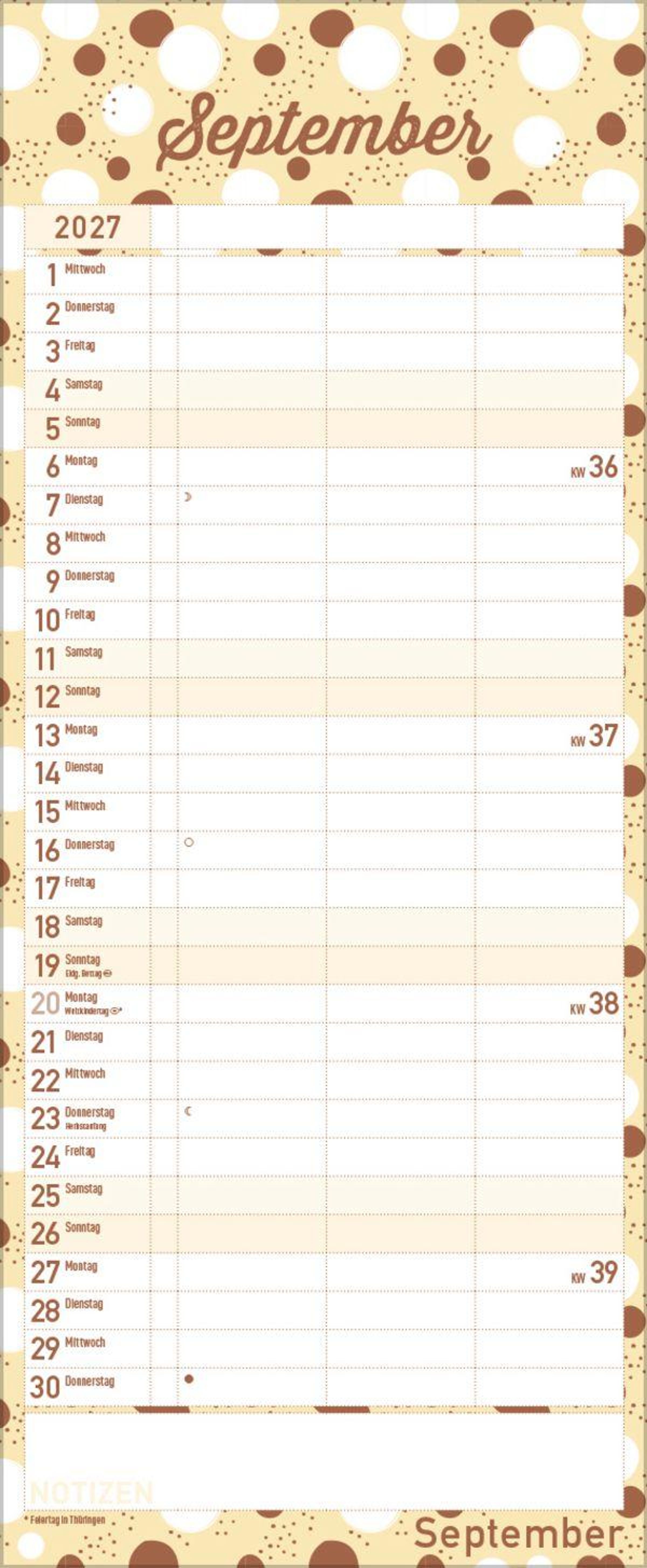 - Familienplaner mit 3 breiten Spalten. Edler Familienkalender mit Metallic Glanz und Folienprägung. Mit Ferienterminen, Vorschau bis März 2027. Format 19 x 46 cm.