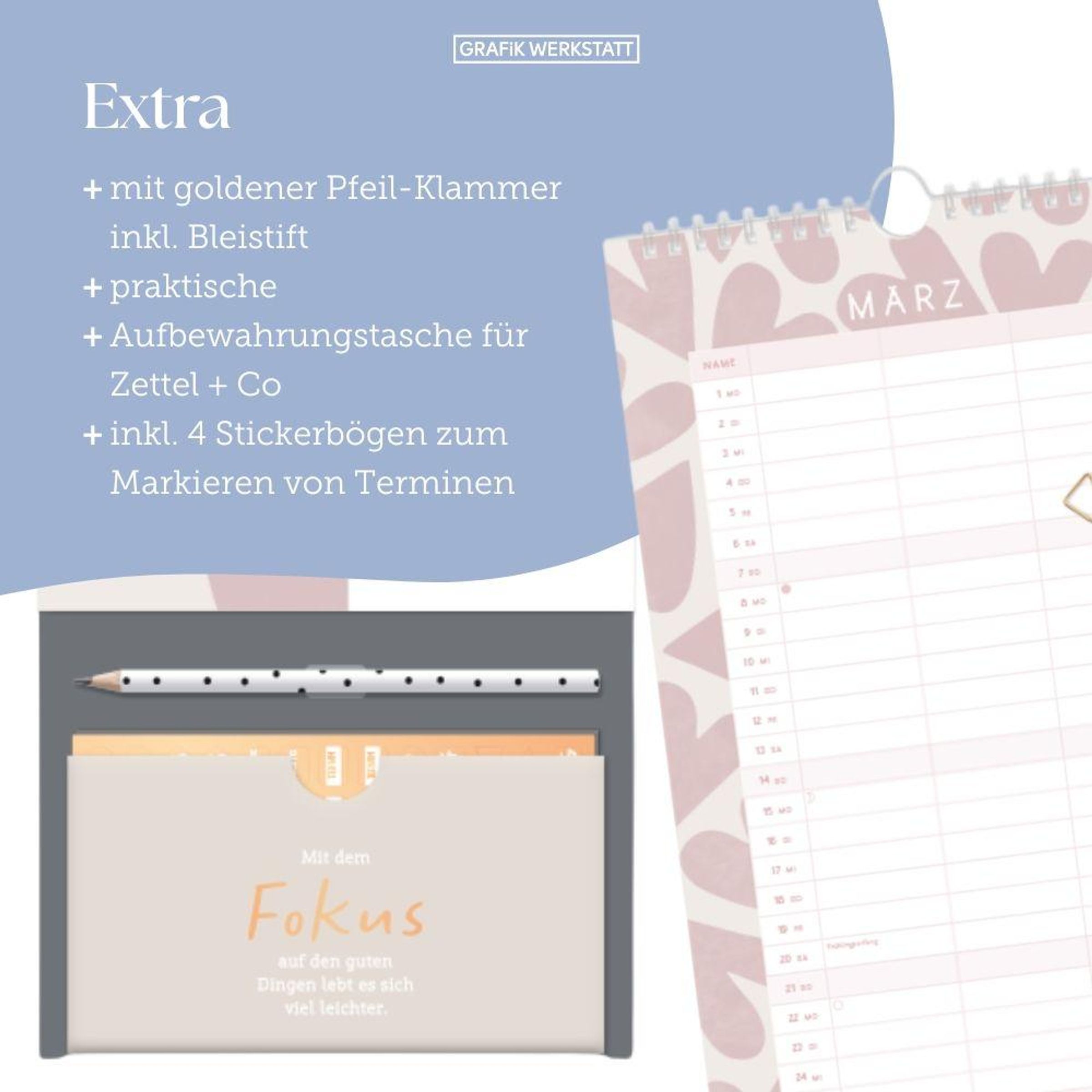 Dieser Premium Paarplaner ist der perfekte Jahresplaner für bis zu 3 Personen mit vielen praktischen Extras. Ein Monat auf einer Seite und 3 große Spalten sorgen für den perfekten Überblick und leiten die ganze Familie durch den Alltag. Edles Design in Kombination mit tollen Extras wie 4 Stickerbögen, eine praktische Aufbewahrungstasche, Bleistift und eine goldene Pfeil-Klammer sorgen Monat für Monat für gute Laune. Feiertage und Schulferien sind im Paarplaner natürlich eingetragen.