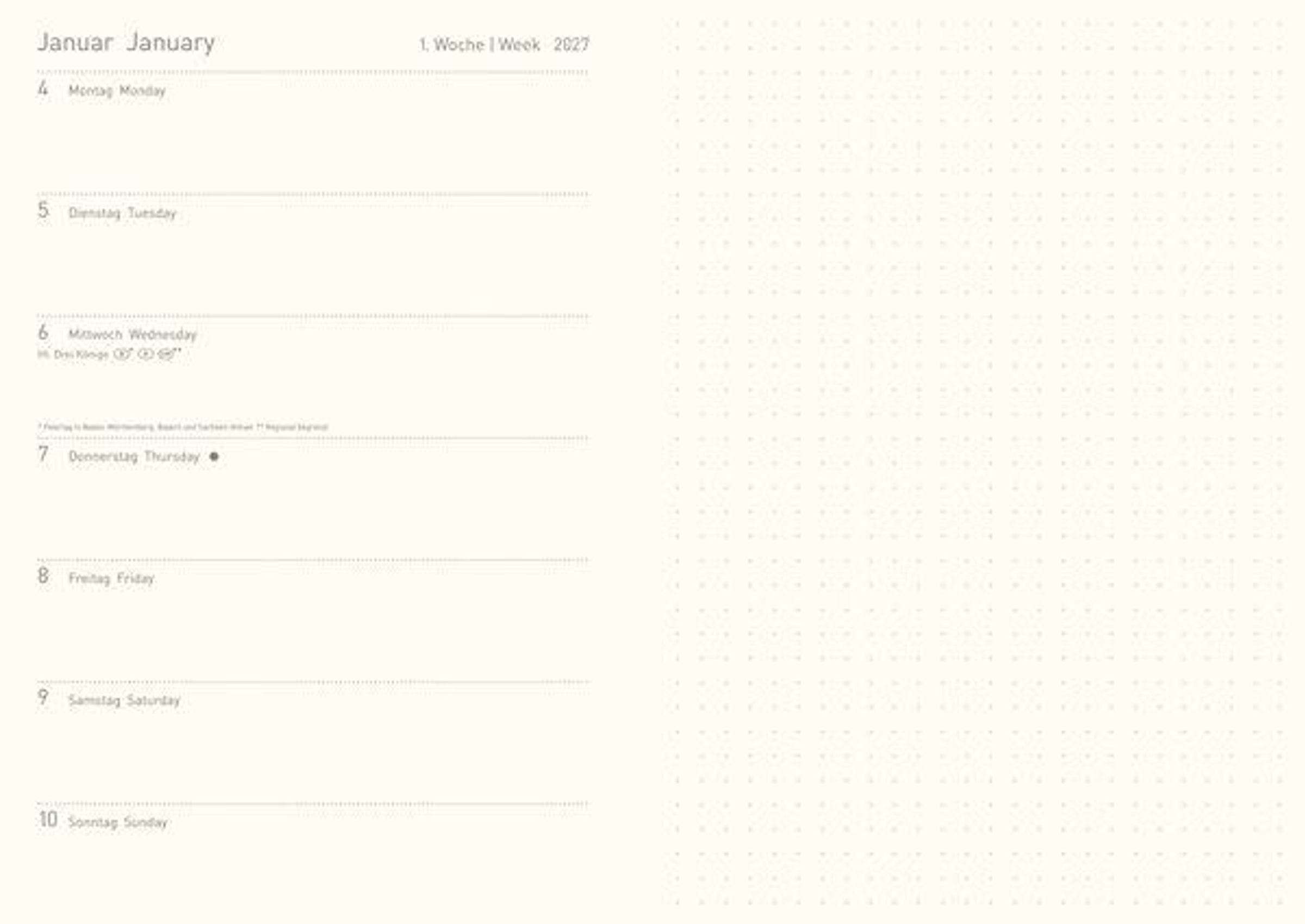 Taschenkalender im Format: 12 x 17 cm, 144 Seiten, umweltfreundliches FSC Papier Jede Doppelseite des 12 Monats-Kalendariums zeigt die Wochenübersicht sowie eine Seite für Notizen Kalendarium auf Deutsch und Englisch; Feiertagen für Deutschland, Österreich und Schweiz Geprägter und mit Kaltfolie veredelter Umschlag Stifthalter und Lesebändchen sowie praktische Zetteltasche; Anzeige der Mondphasen